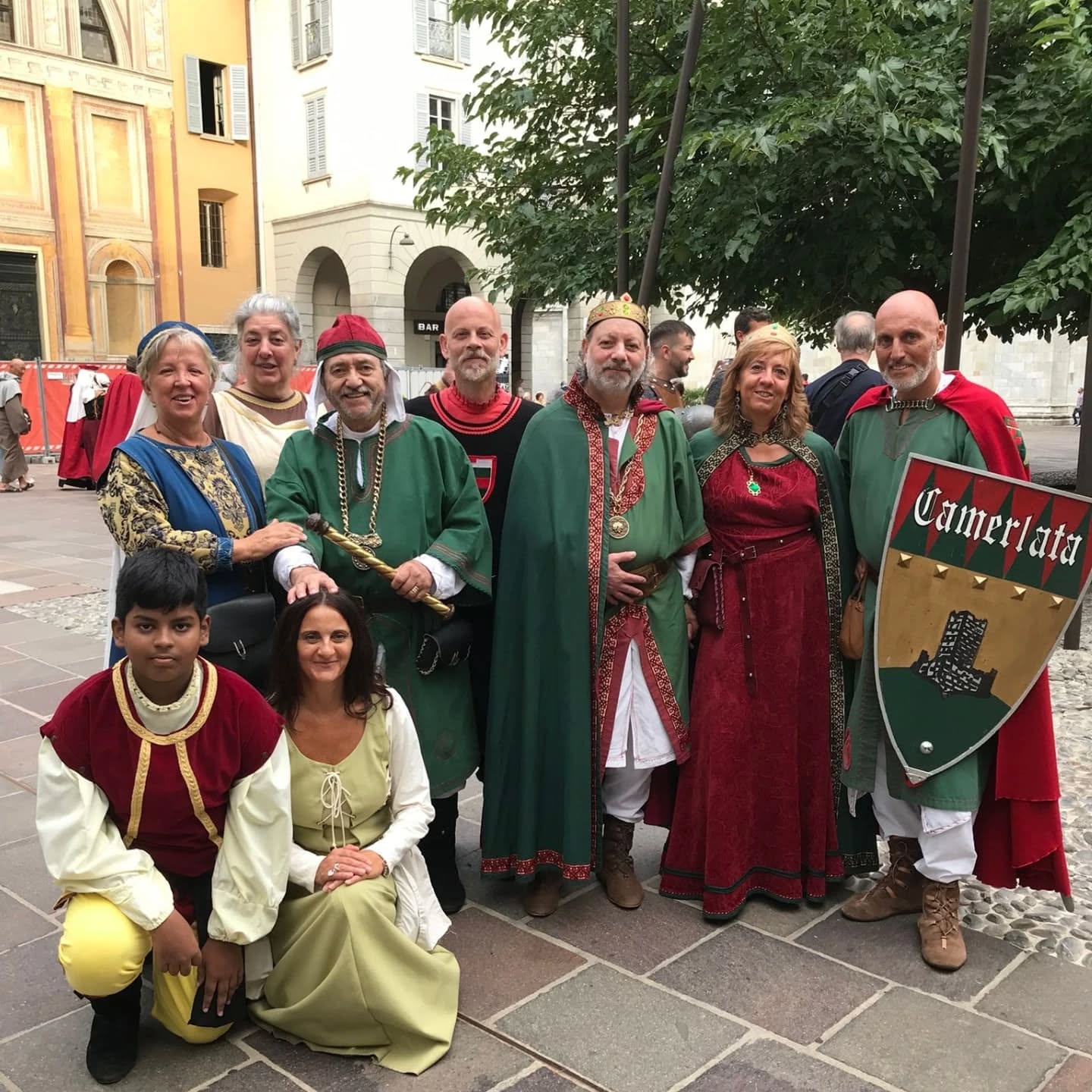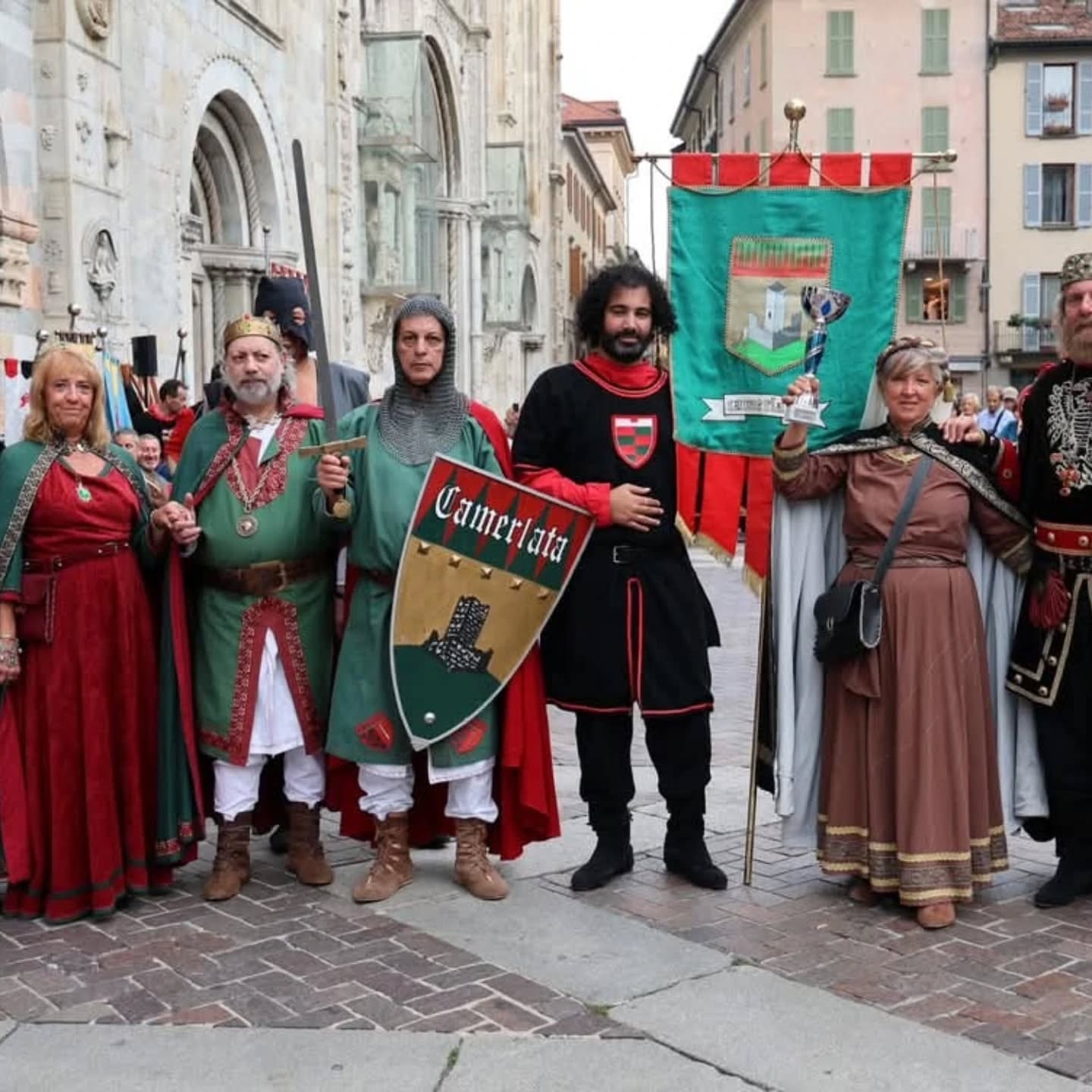 Essa fu commissionata dal Comune di Como per riqualificare uno dei luoghi d’ingresso alla città, piazzale Camerlata, già allora transitata da molti veicoli nelle quattro direzioni di marcia (Varese, Como, Milano e Cantù). Data la destinazione urbanistica del monumento, i progettisti idearono tale combinazione di anelli e di sfere ispirandosi alla pila di Alessandro Volta. La fontana venne costruita in forma temporanea per la VI Triennale di Milano del 1936, e poi demolita e nuovamente assemblata in piazza Camerlata (ai tempi piazza Corsica) nel 1962. Colori del borgo: verde-rosso. Nel suo emblema è raffigurata la casa merlata o piuttosto una ricostruzione del Castel Baradello.
