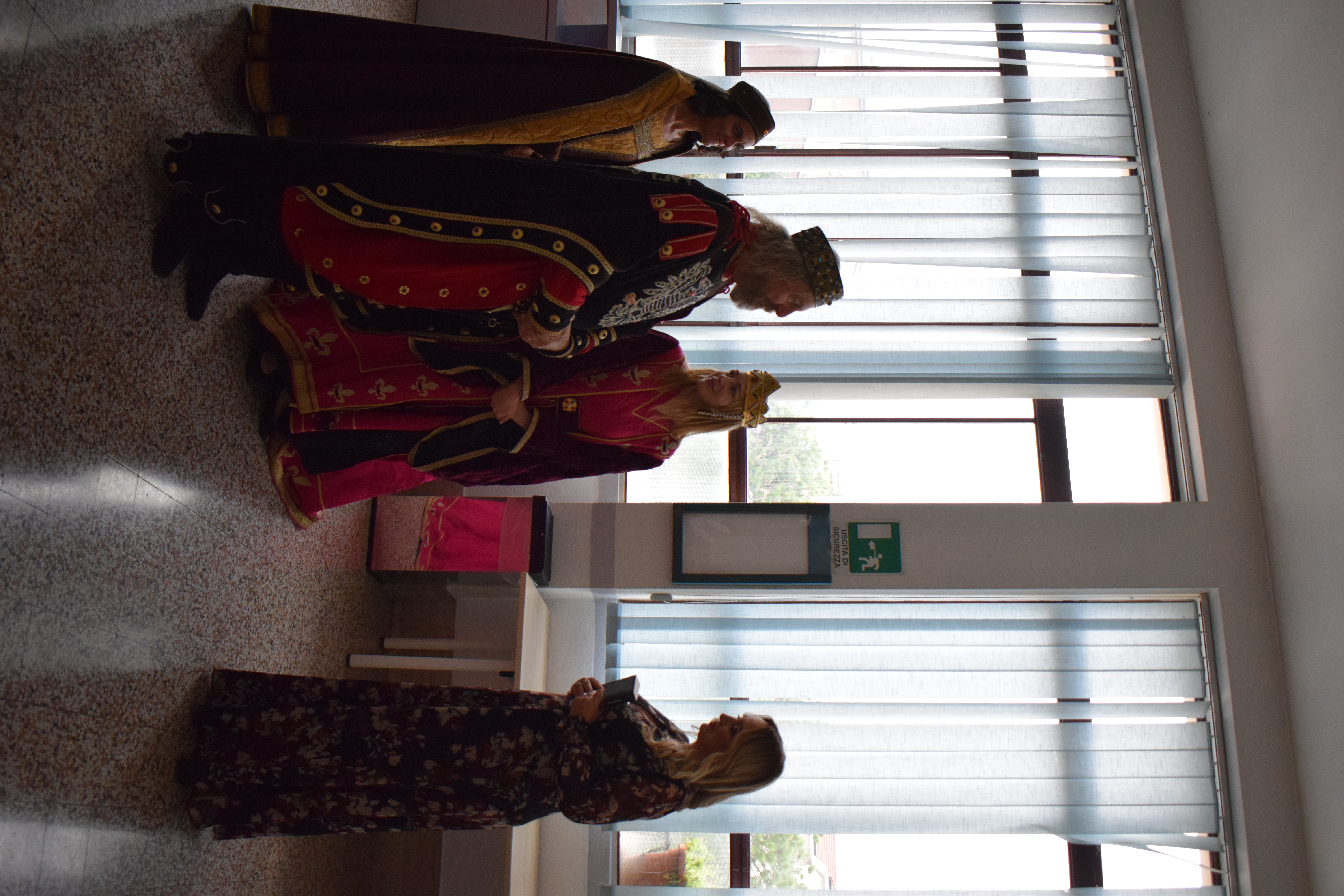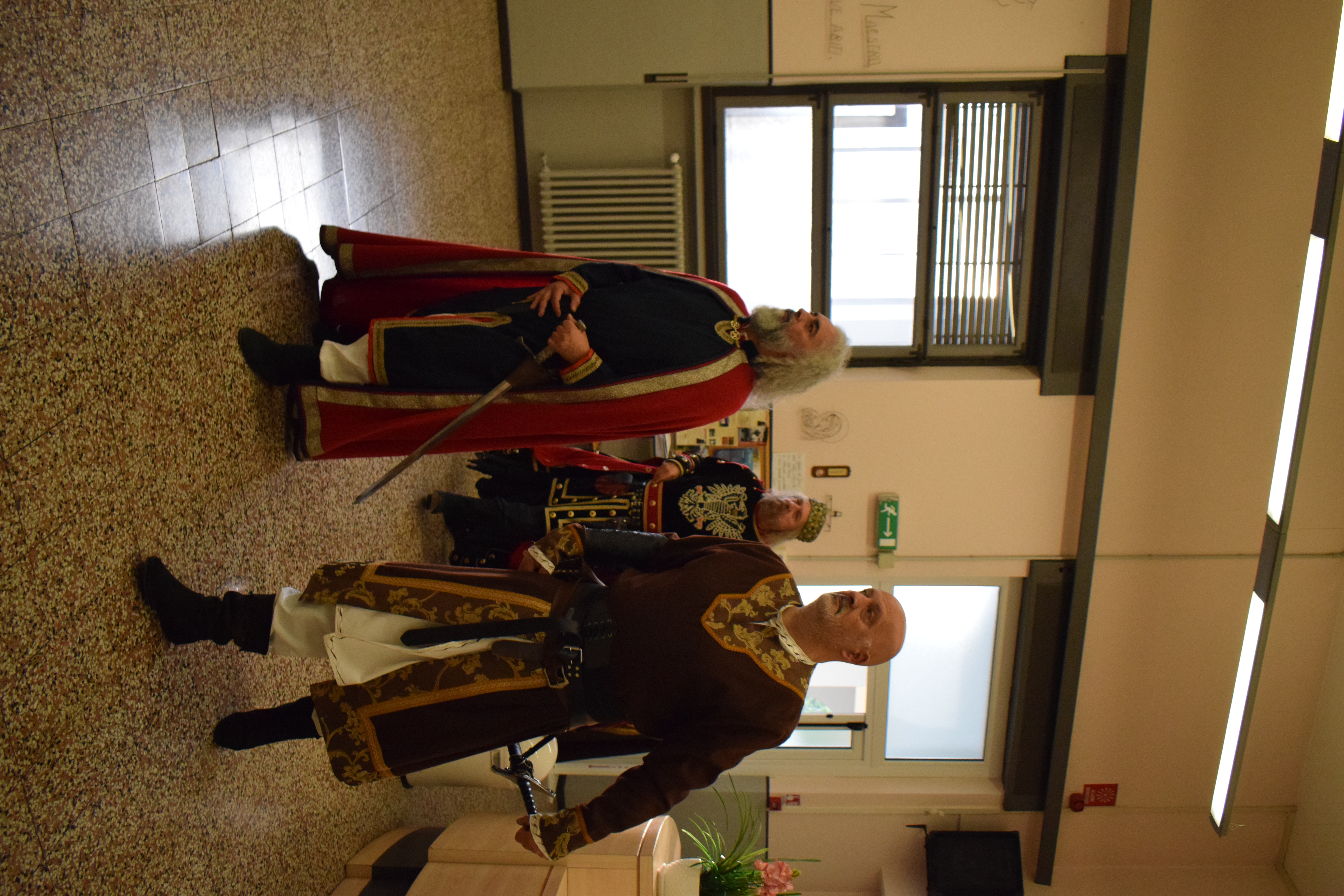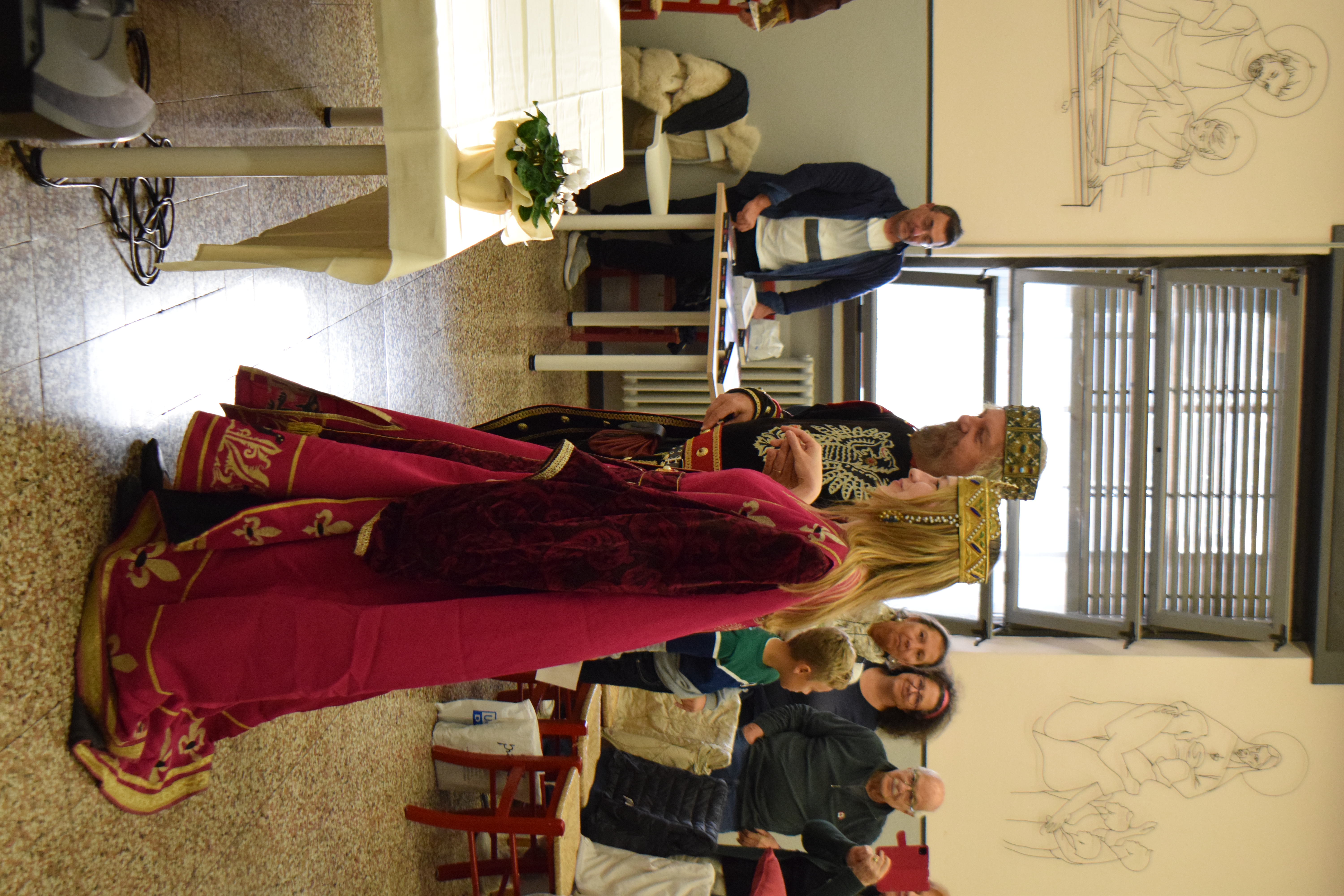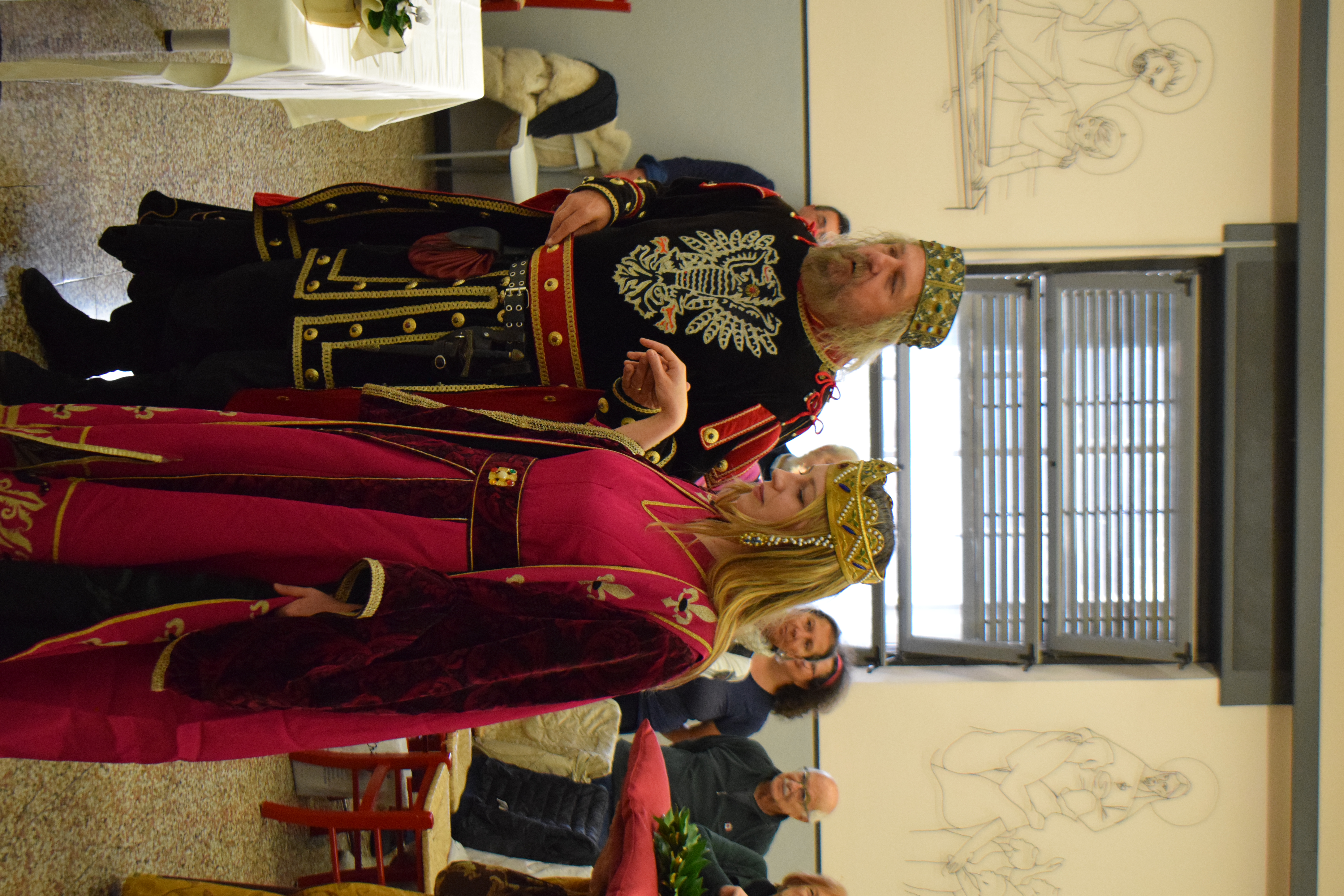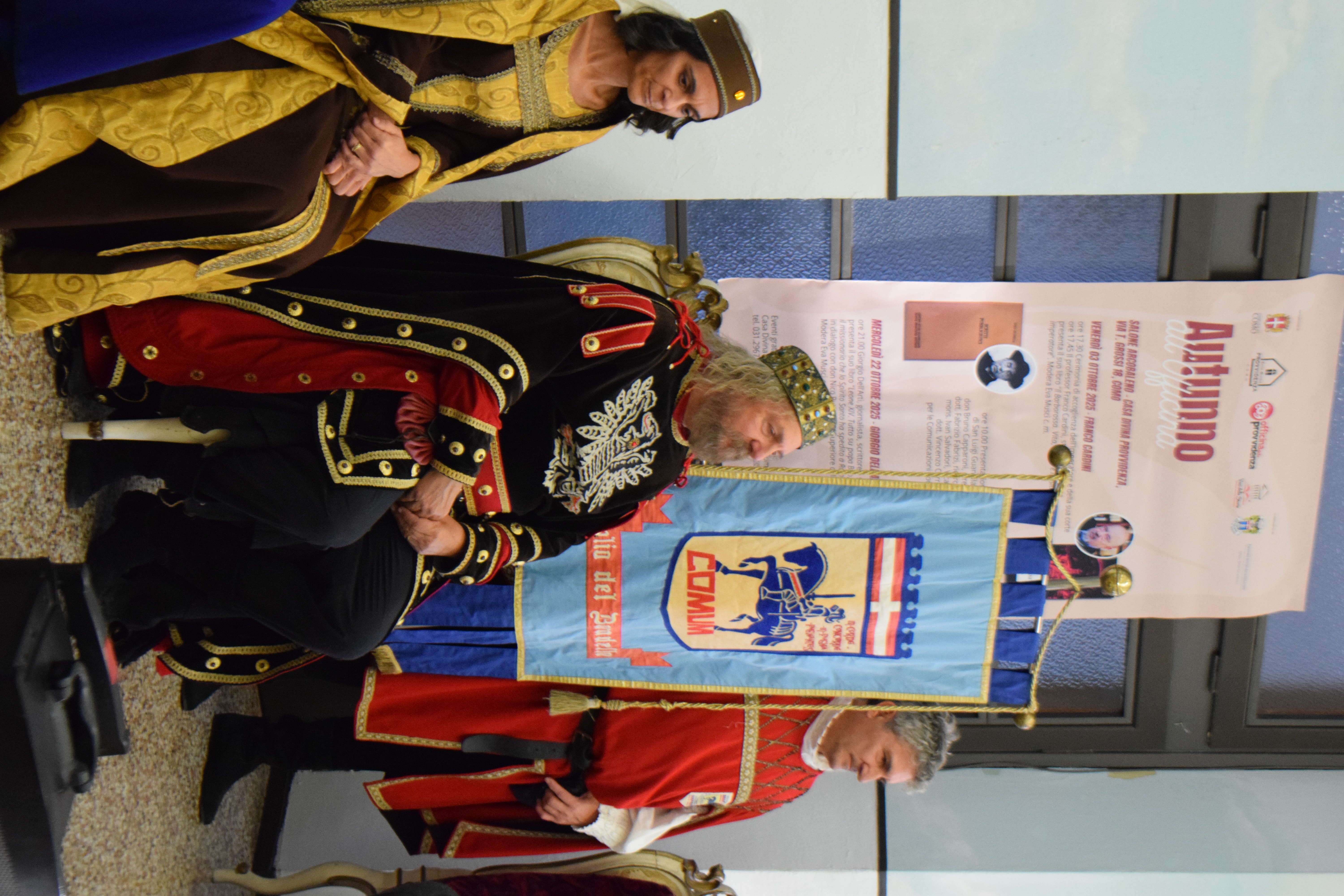 di intrecciare rigore scientifico e sensibilità narrativa, restituendo al pubblico figure storiche complesse con profondità e chiarezza. Ritrovarsi al suo cospetto con l’imperatore e l’imperatrice impersonati dai rievocatori del Palio del Baradello ha creato un momento di forte suggestione, quasi un ponte simbolico tra la ricerca storica e la storia rievocata, tra studio e memoria viva.