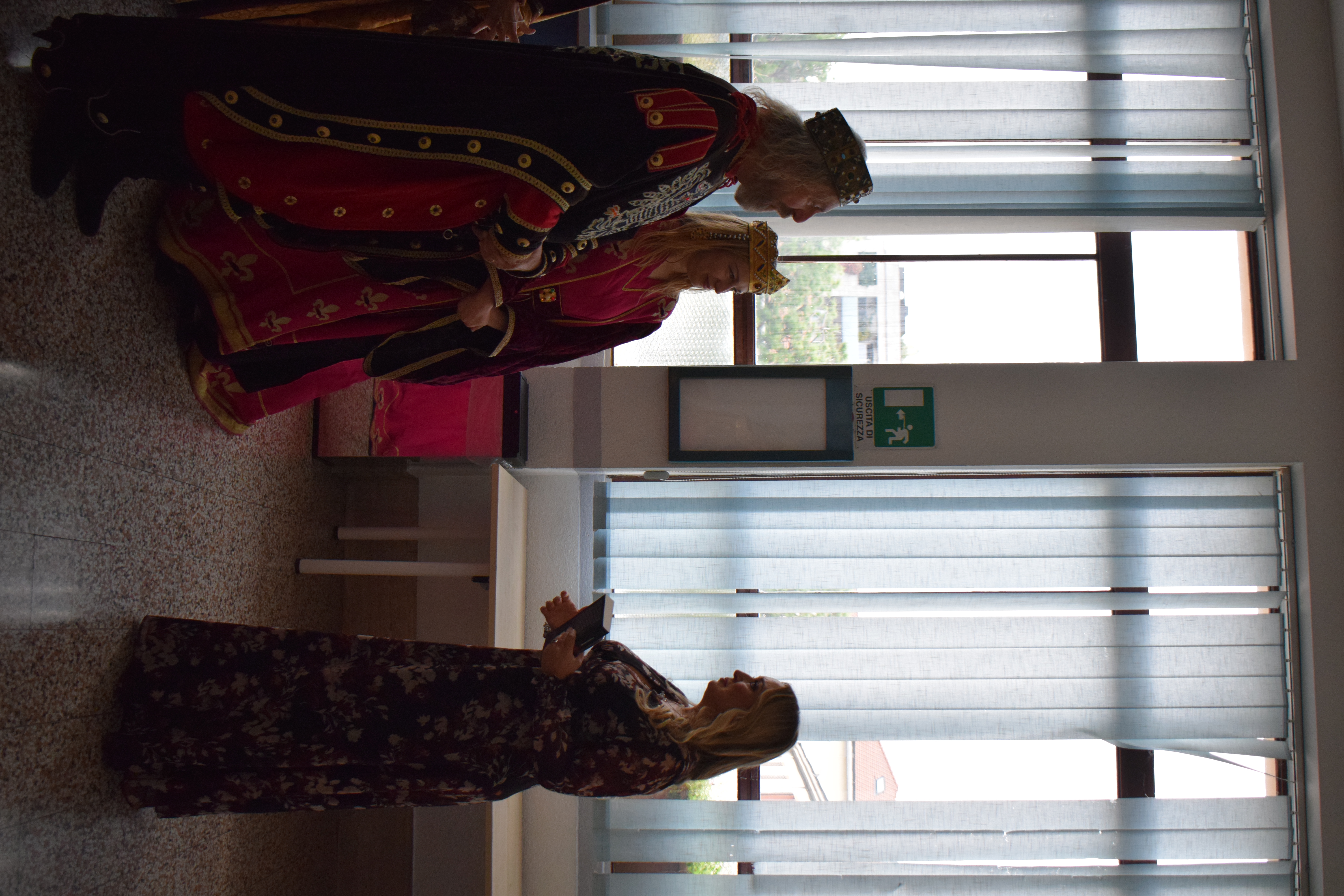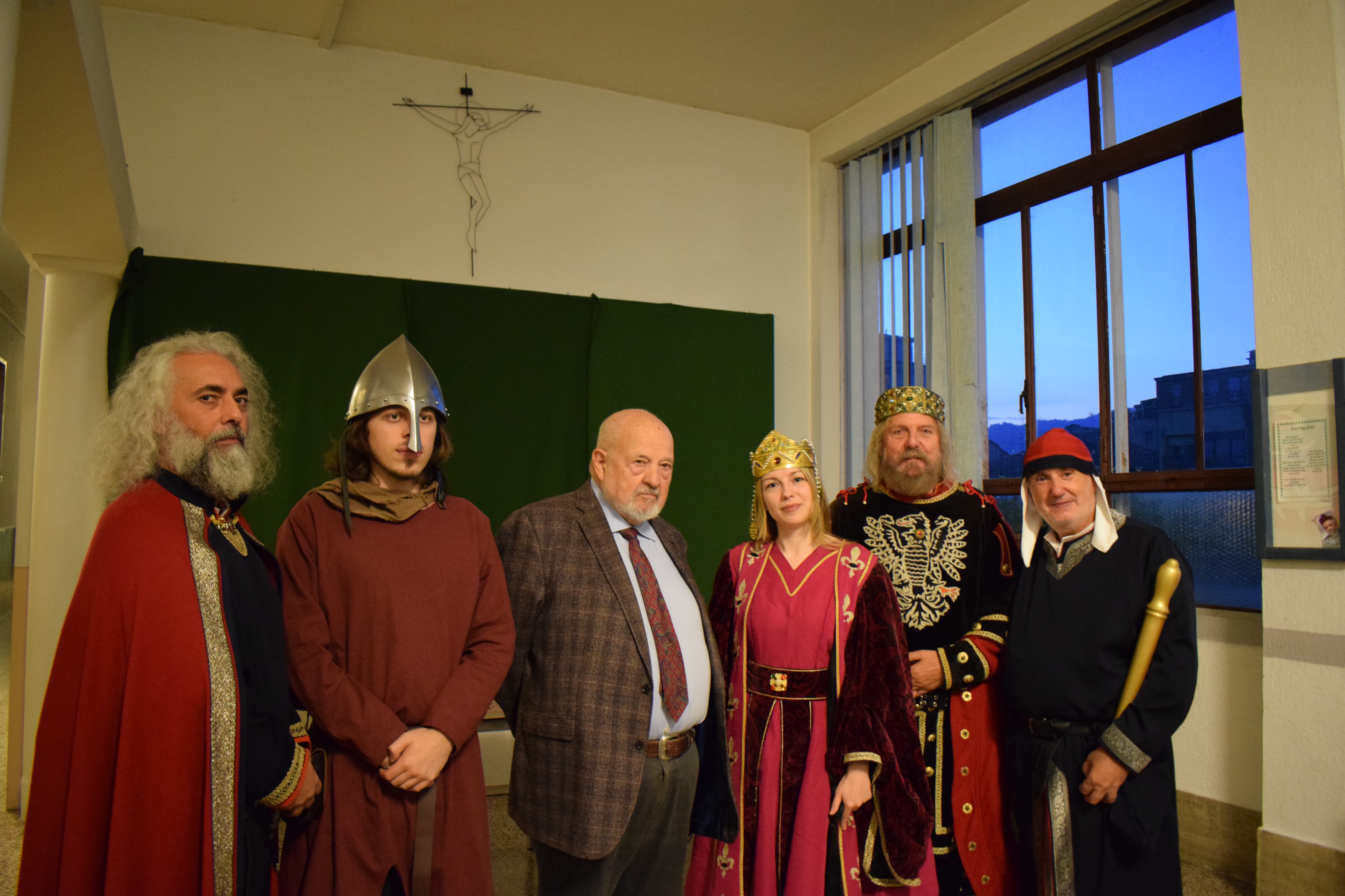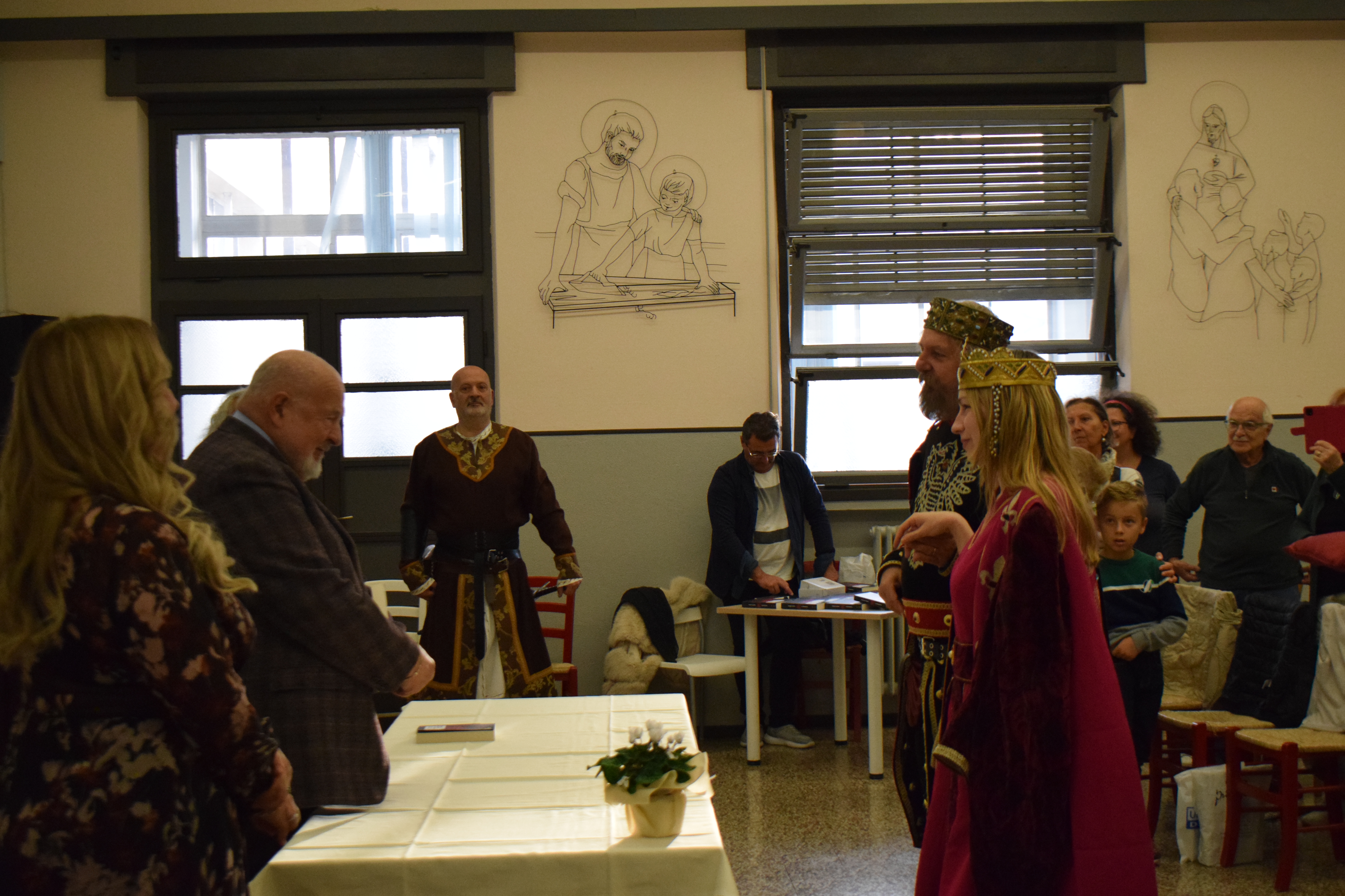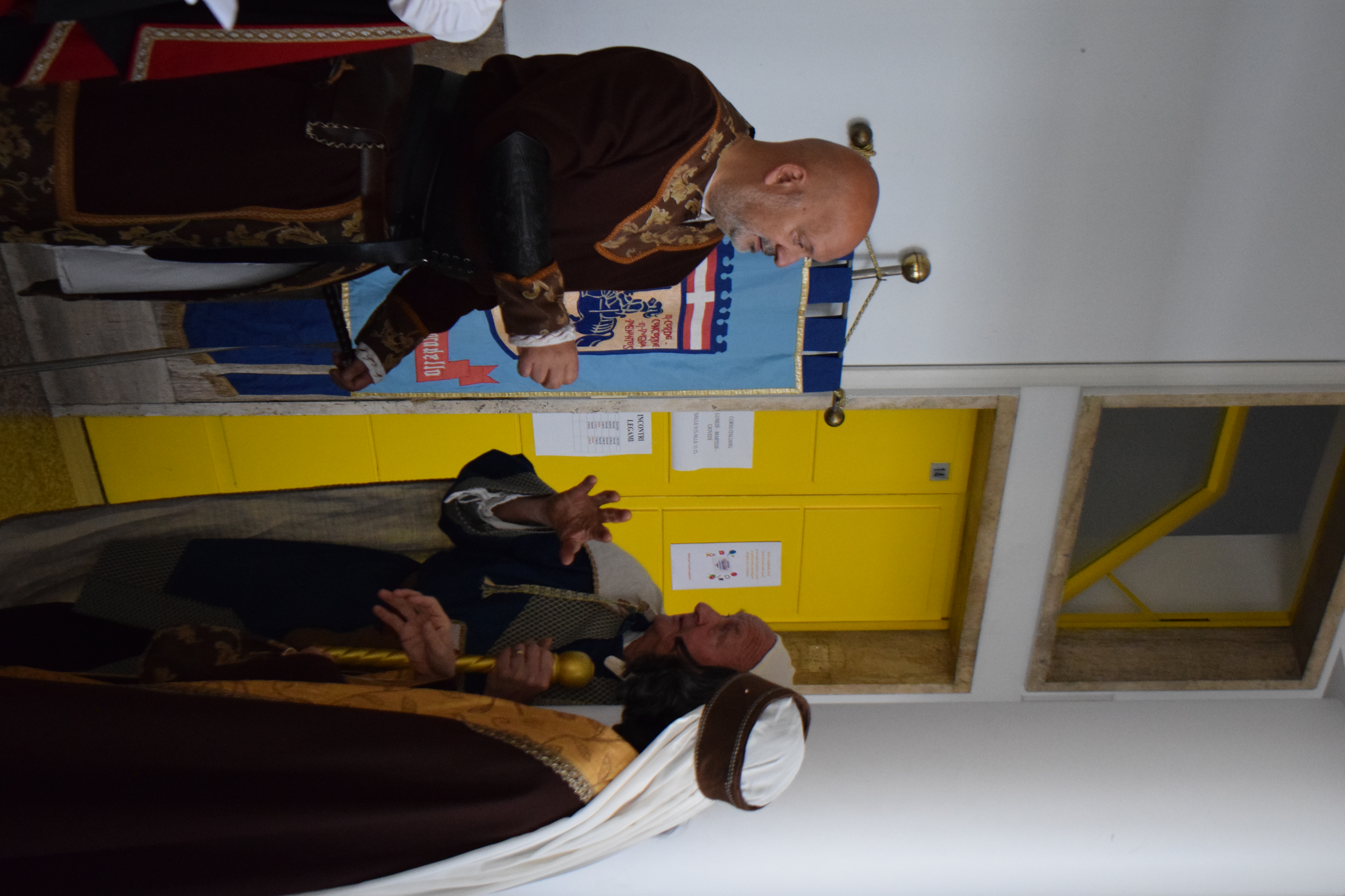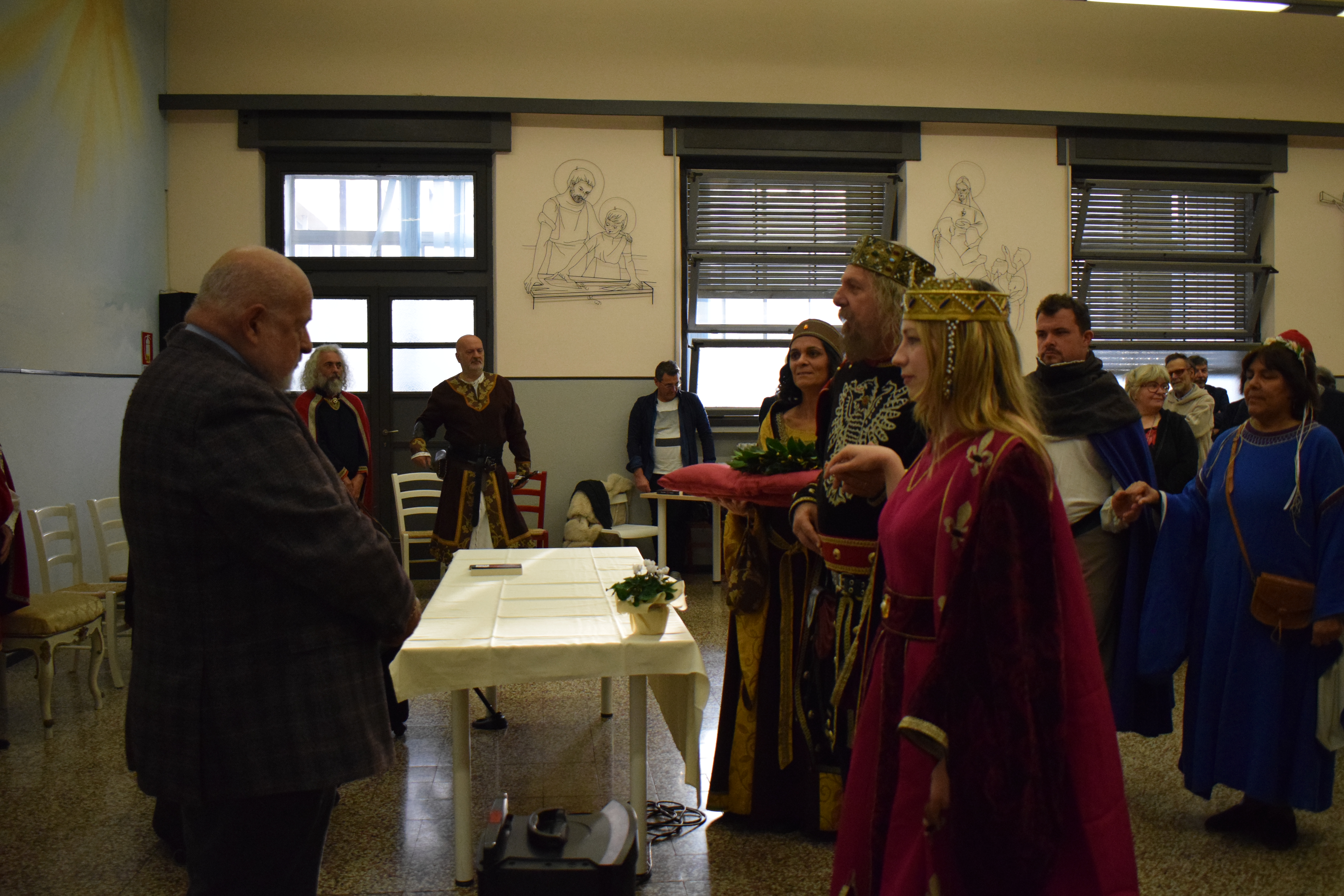 di intrecciare rigore scientifico e sensibilità narrativa, restituendo al pubblico figure storiche complesse con profondità e chiarezza. Ritrovarsi al suo cospetto con l’imperatore e l’imperatrice impersonati dai rievocatori del Palio del Baradello ha creato un momento di forte suggestione, quasi un ponte simbolico tra la ricerca storica e la storia rievocata, tra studio e memoria viva.