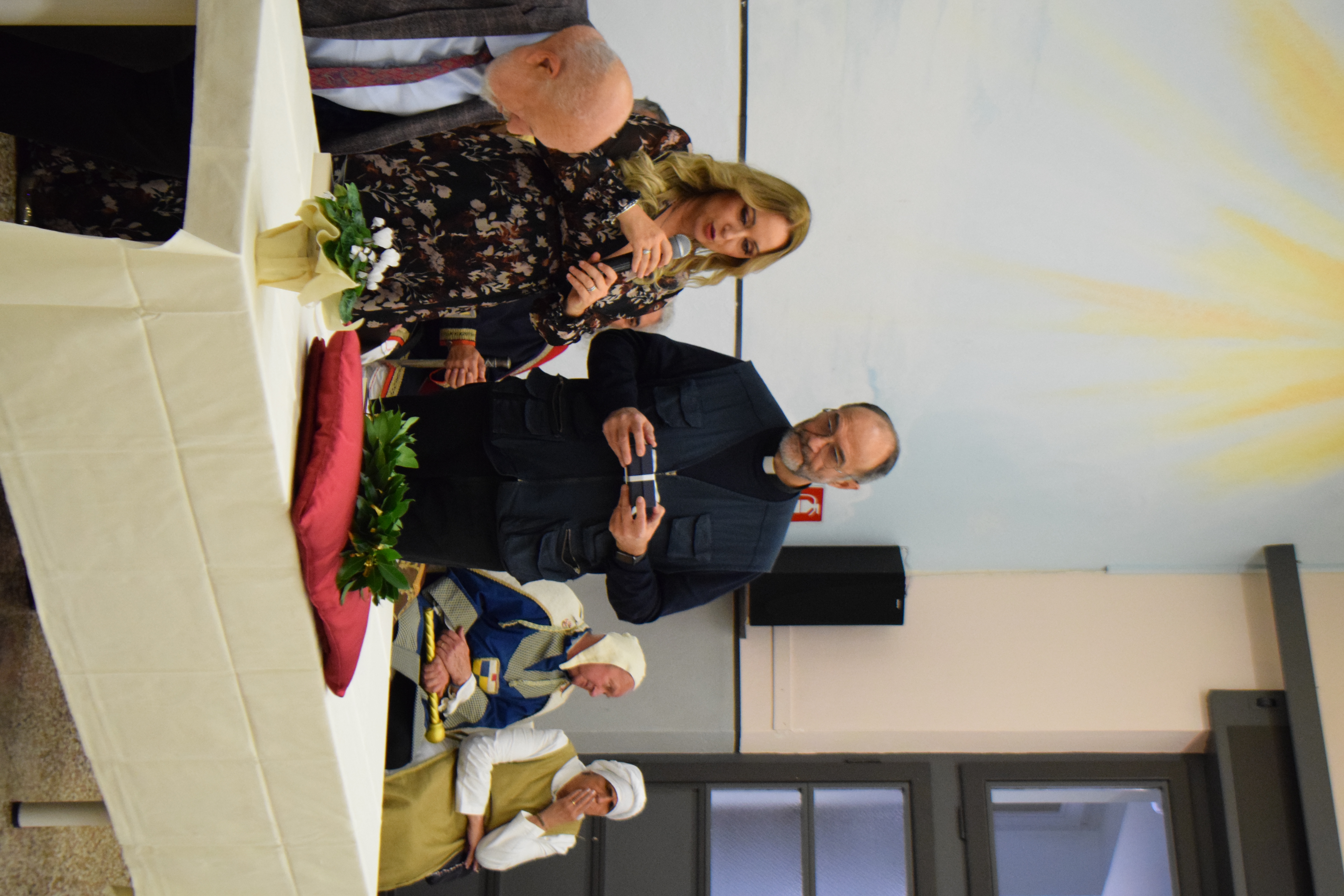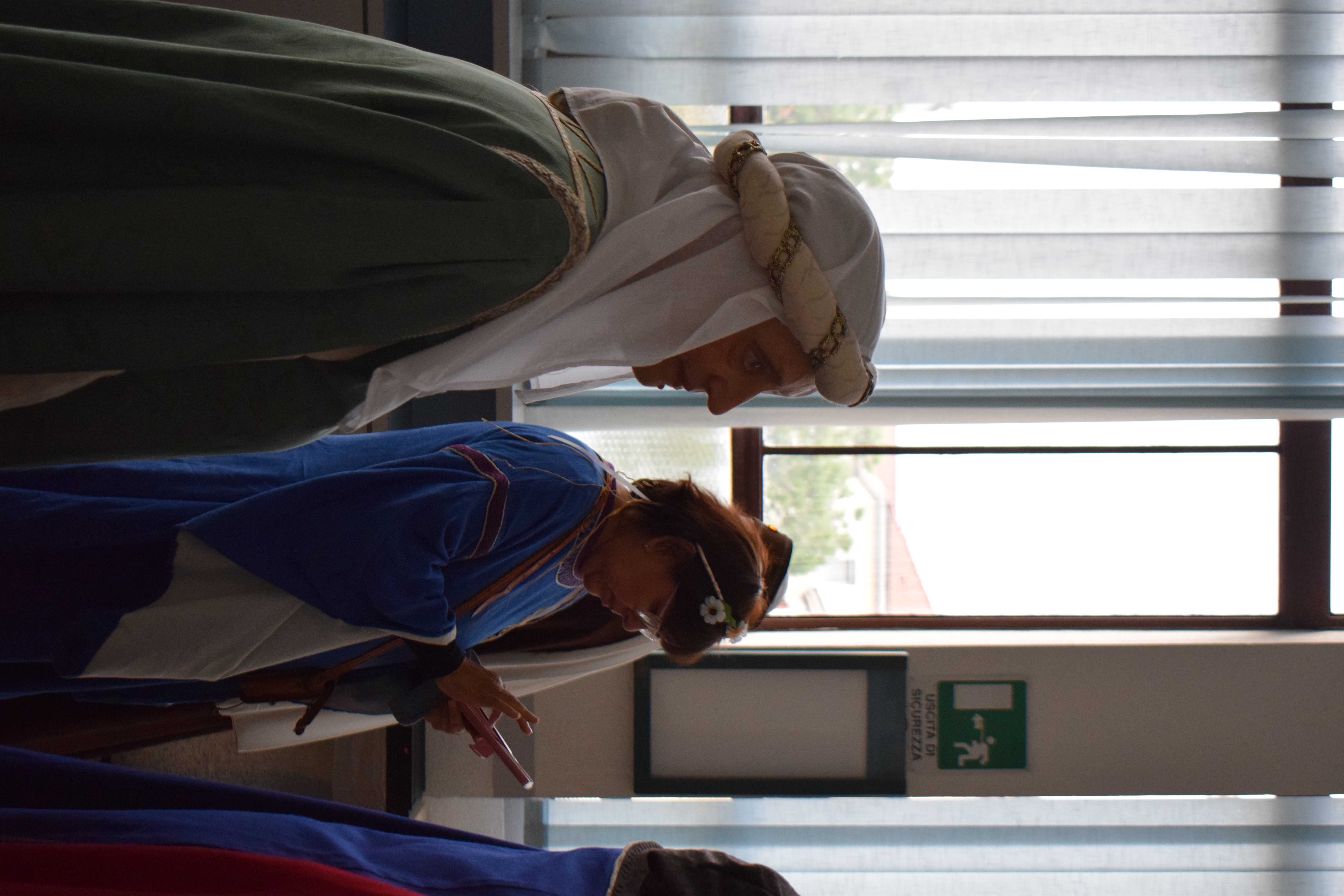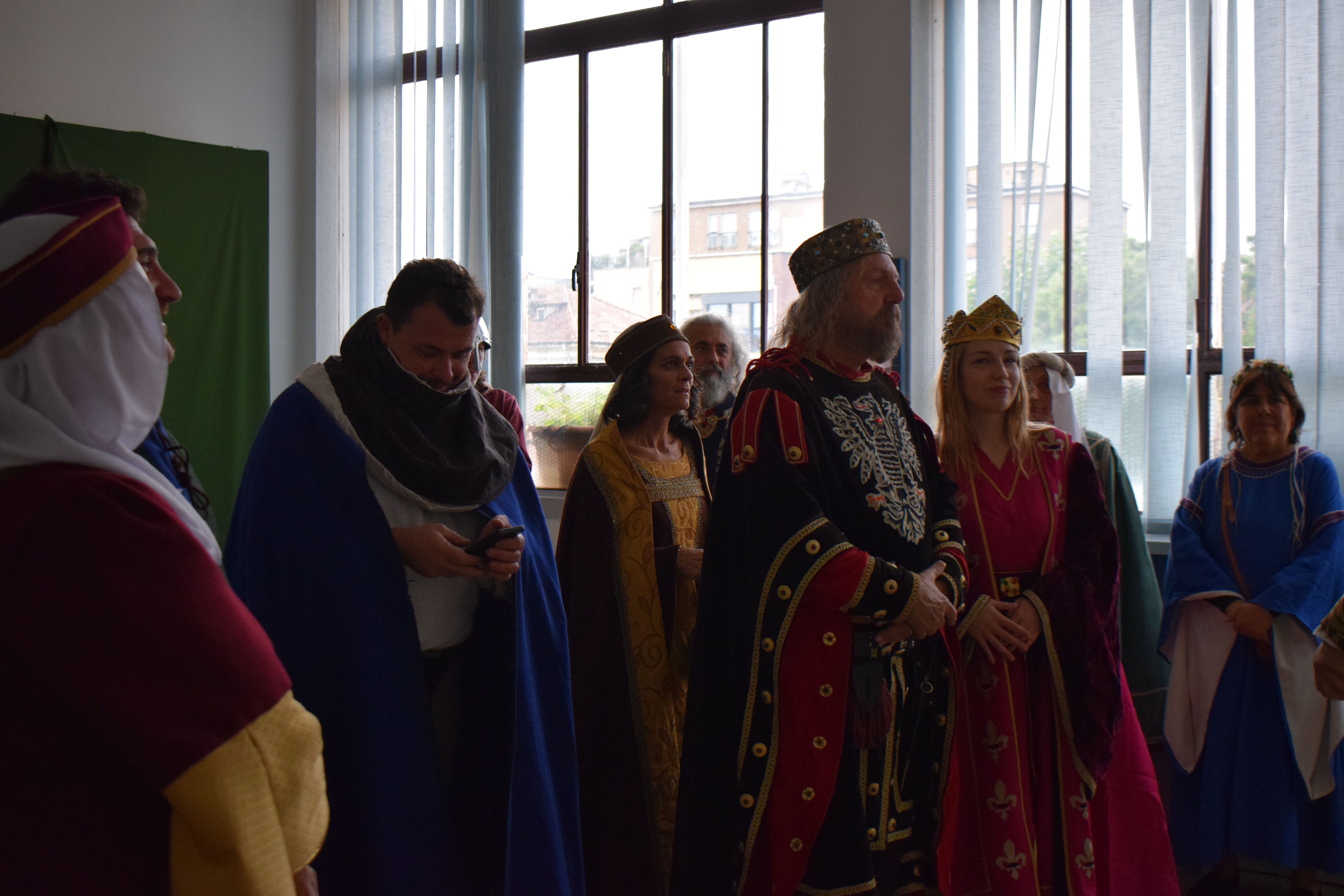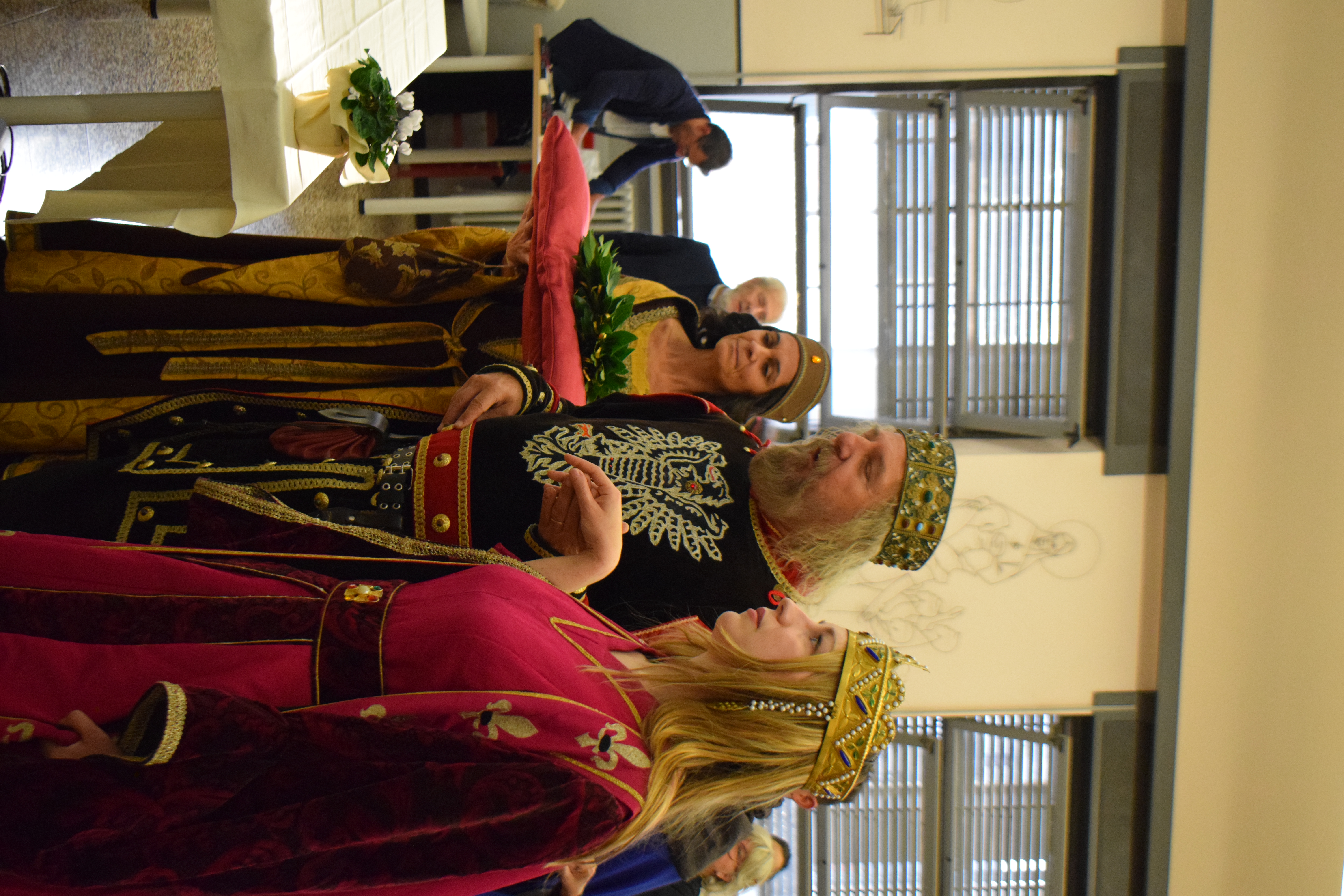 di intrecciare rigore scientifico e sensibilità narrativa, restituendo al pubblico figure storiche complesse con profondità e chiarezza. Ritrovarsi al suo cospetto con l’imperatore e l’imperatrice impersonati dai rievocatori del Palio del Baradello ha creato un momento di forte suggestione, quasi un ponte simbolico tra la ricerca storica e la storia rievocata, tra studio e memoria viva.