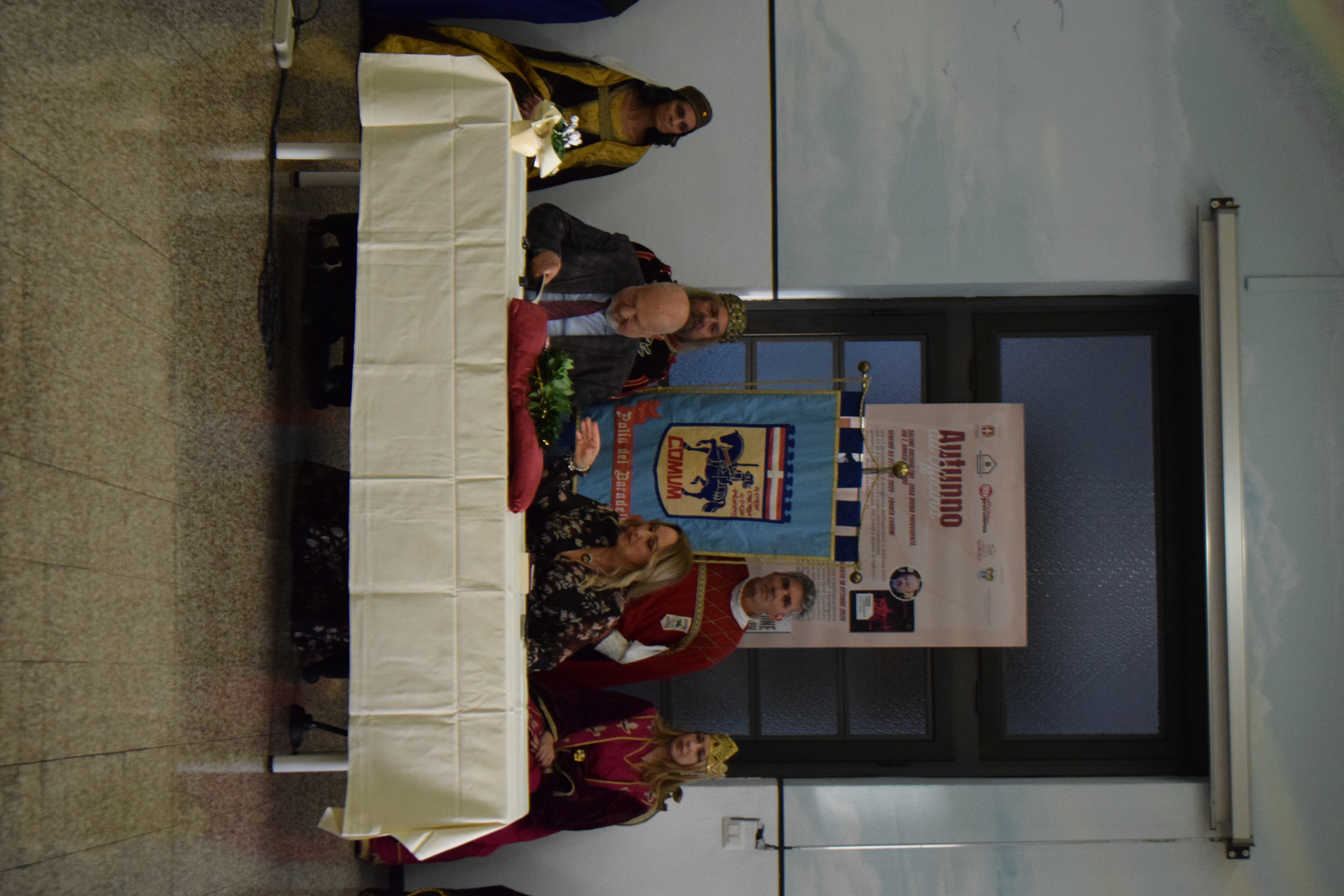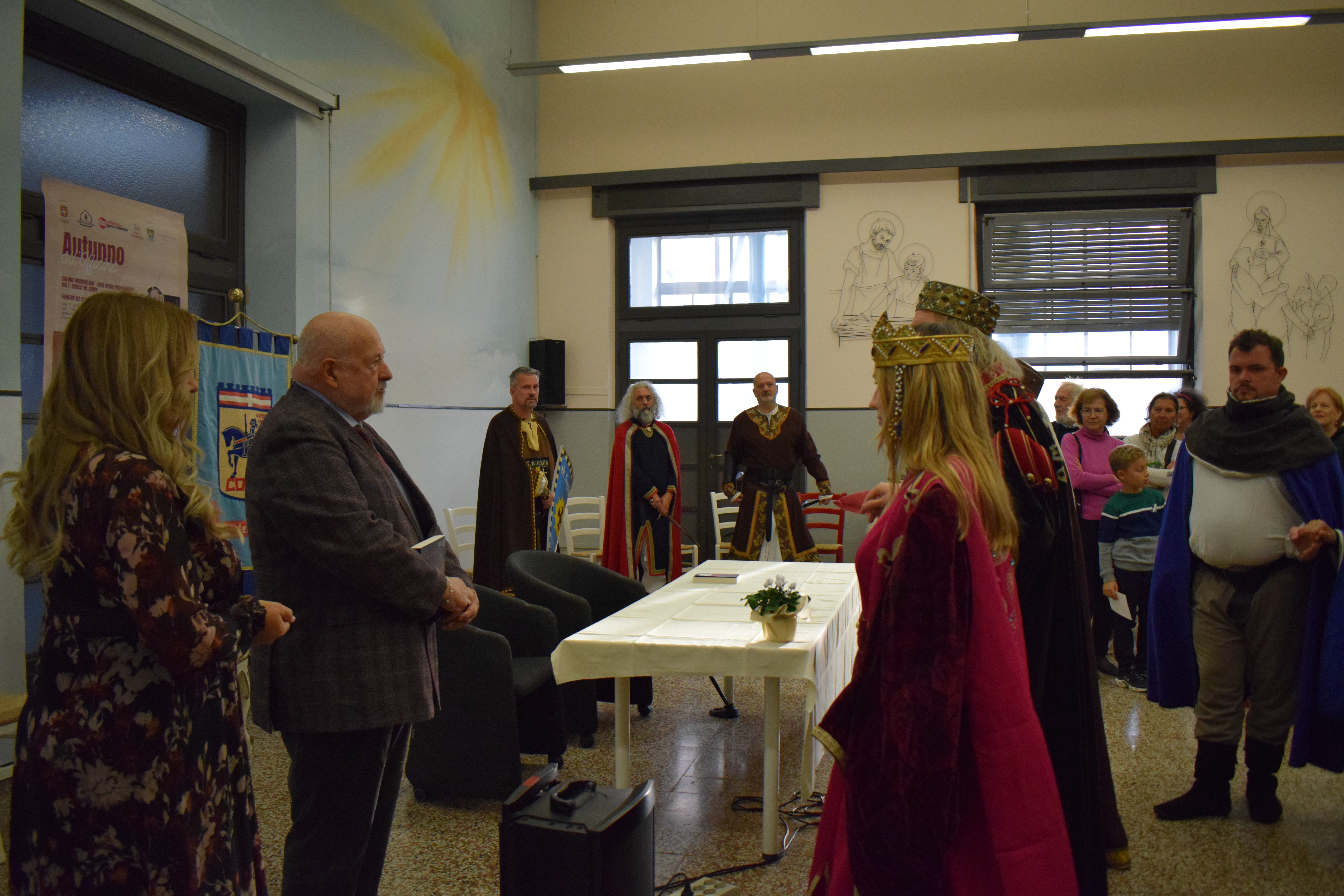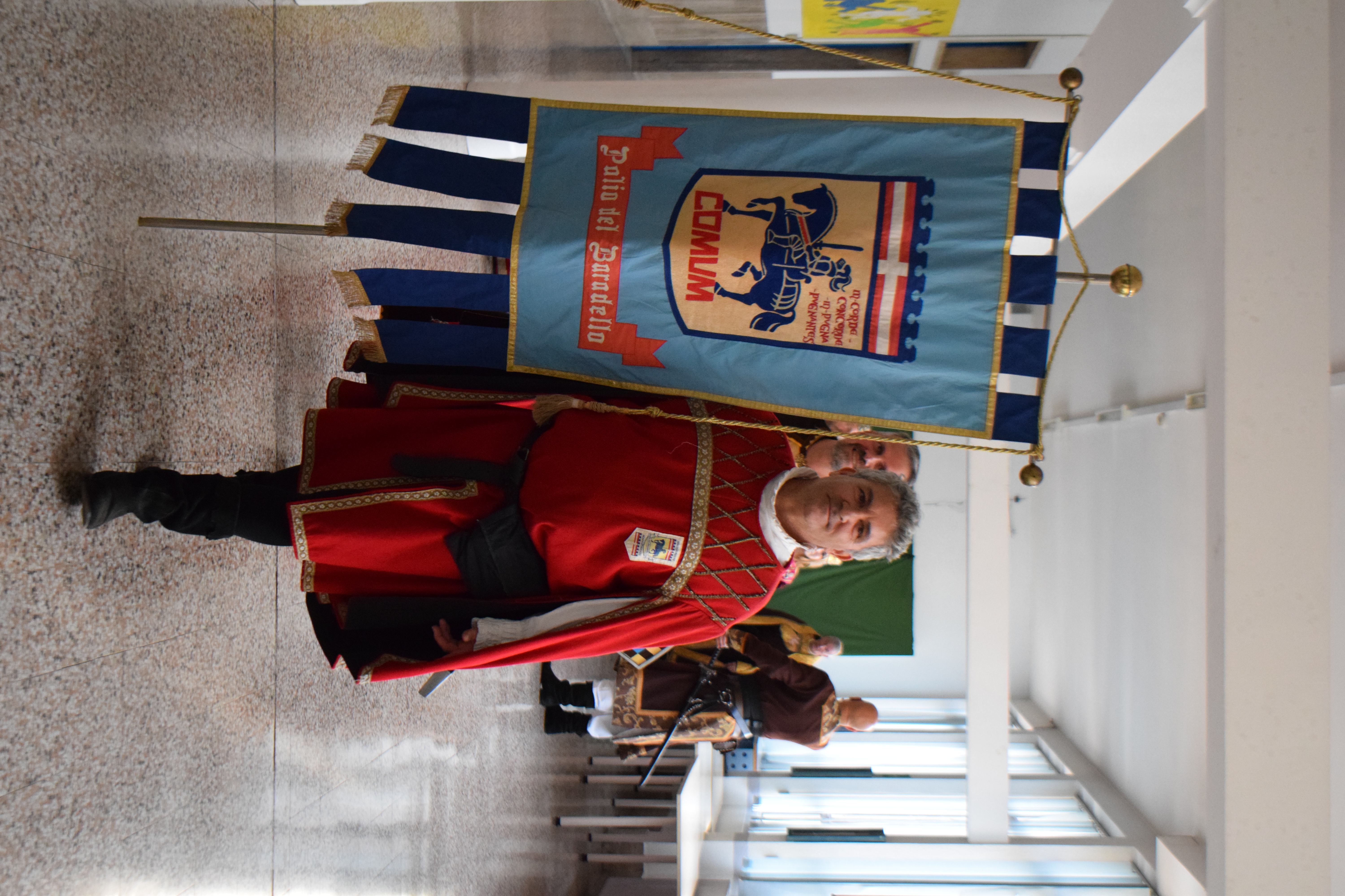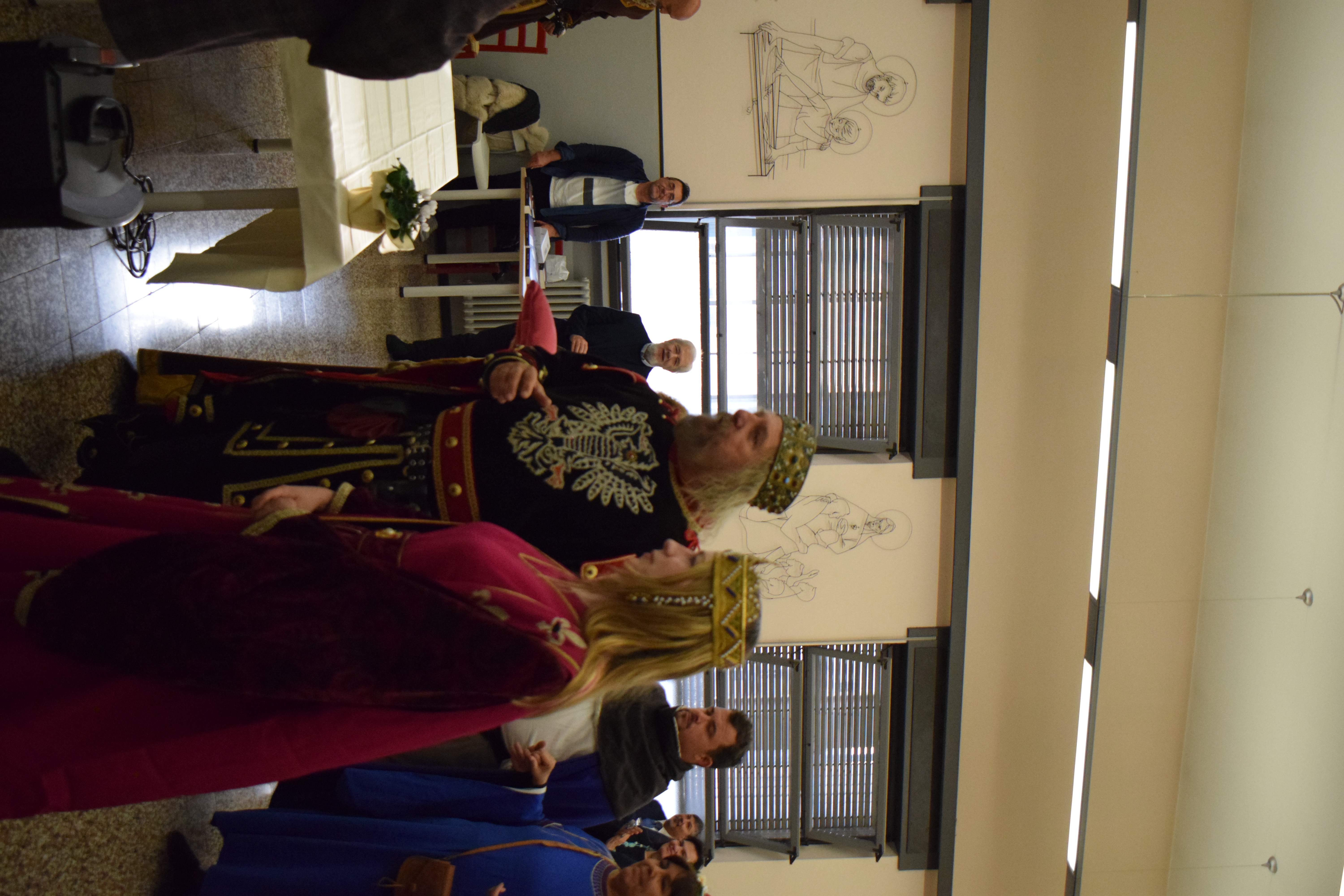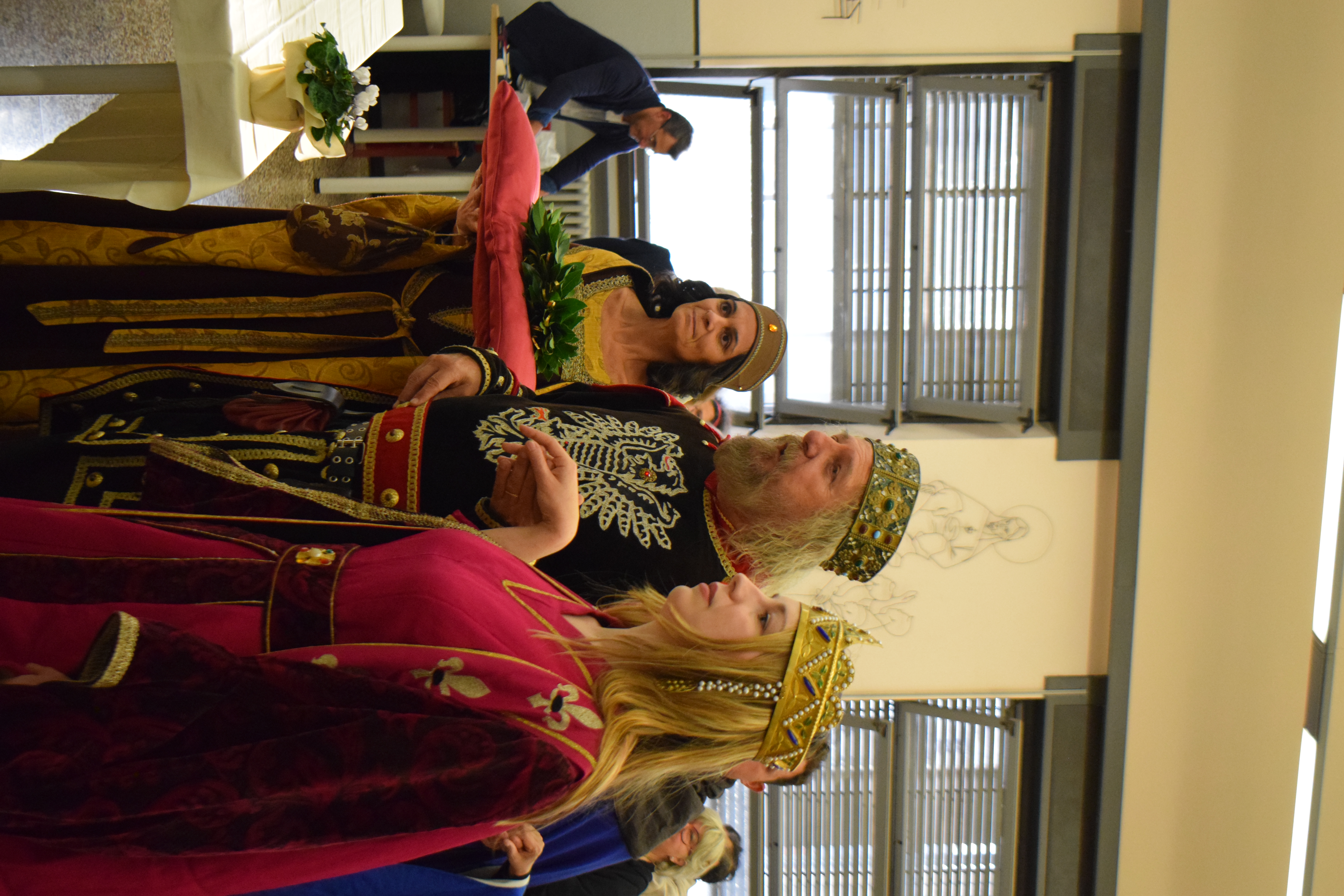 di intrecciare rigore scientifico e sensibilità narrativa, restituendo al pubblico figure storiche complesse con profondità e chiarezza. Ritrovarsi al suo cospetto con l’imperatore e l’imperatrice impersonati dai rievocatori del Palio del Baradello ha creato un momento di forte suggestione, quasi un ponte simbolico tra la ricerca storica e la storia rievocata, tra studio e memoria viva.