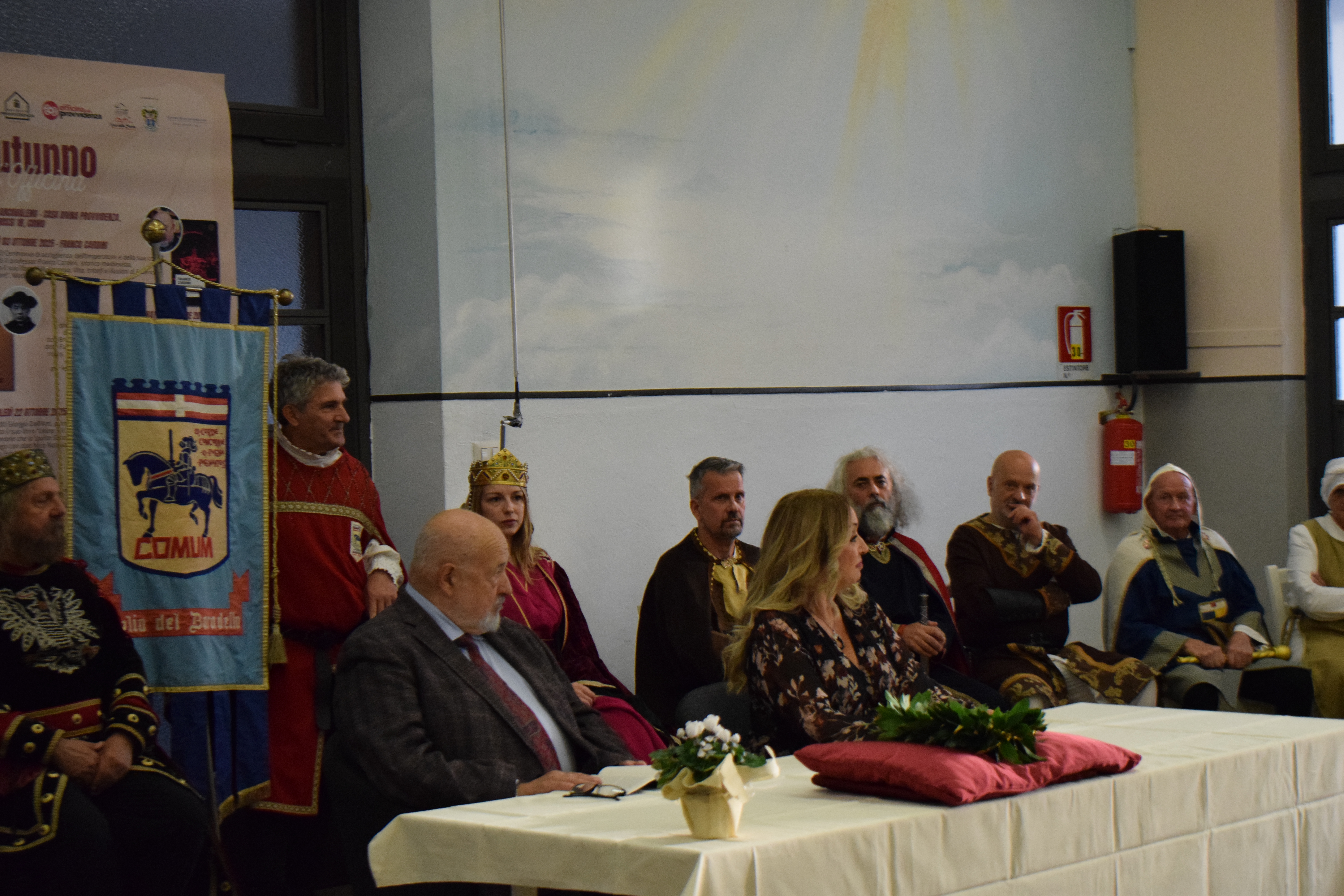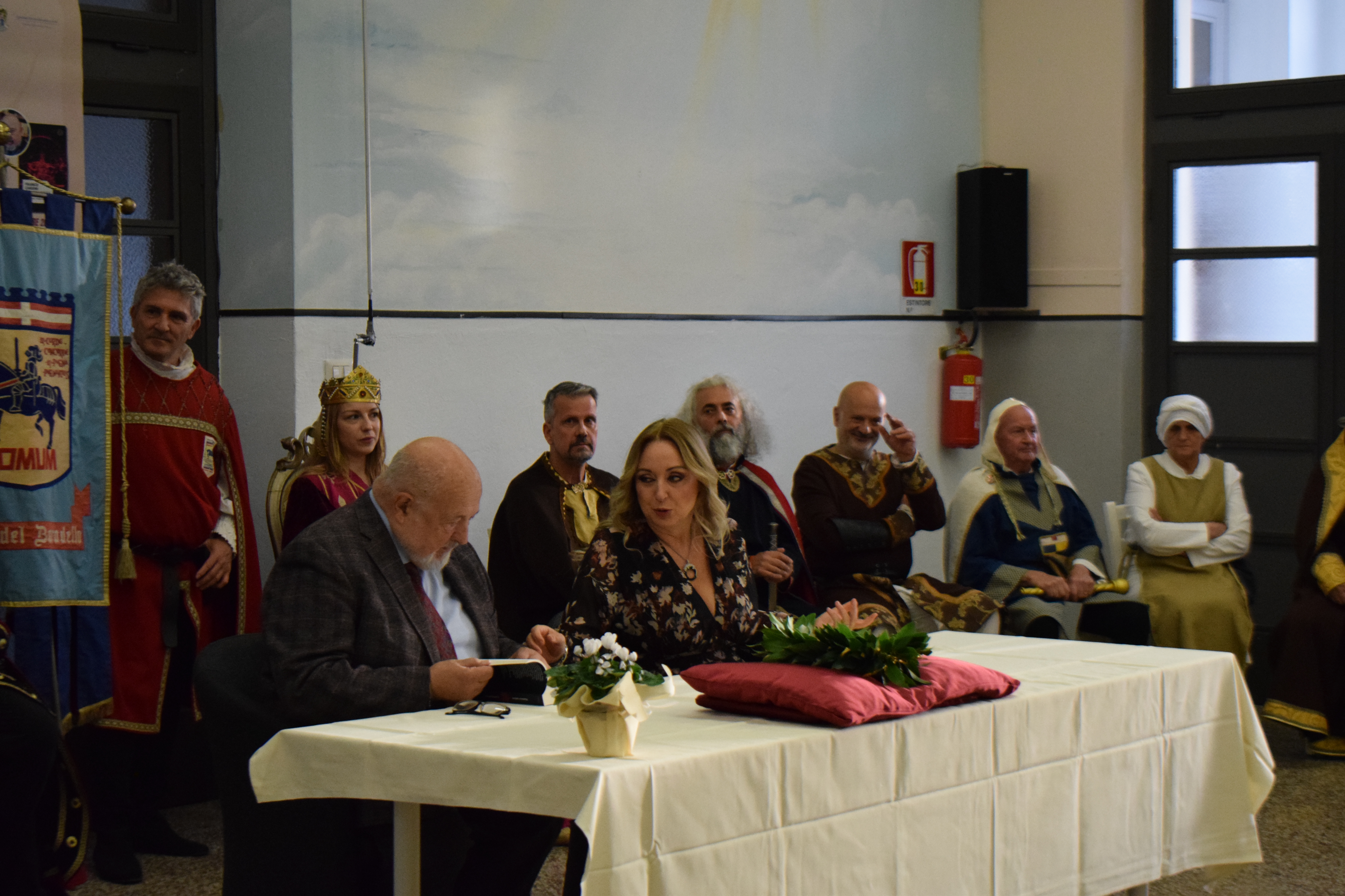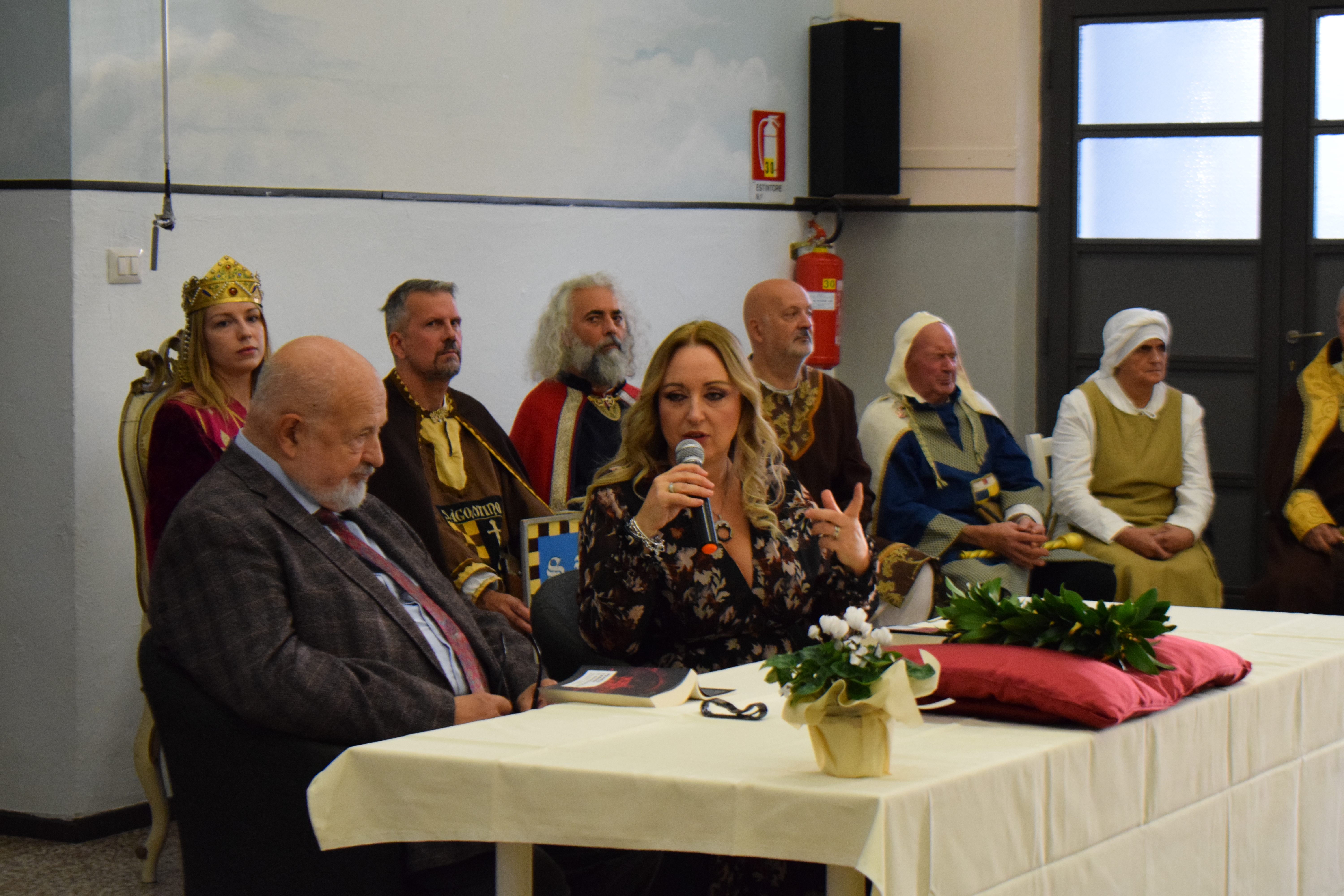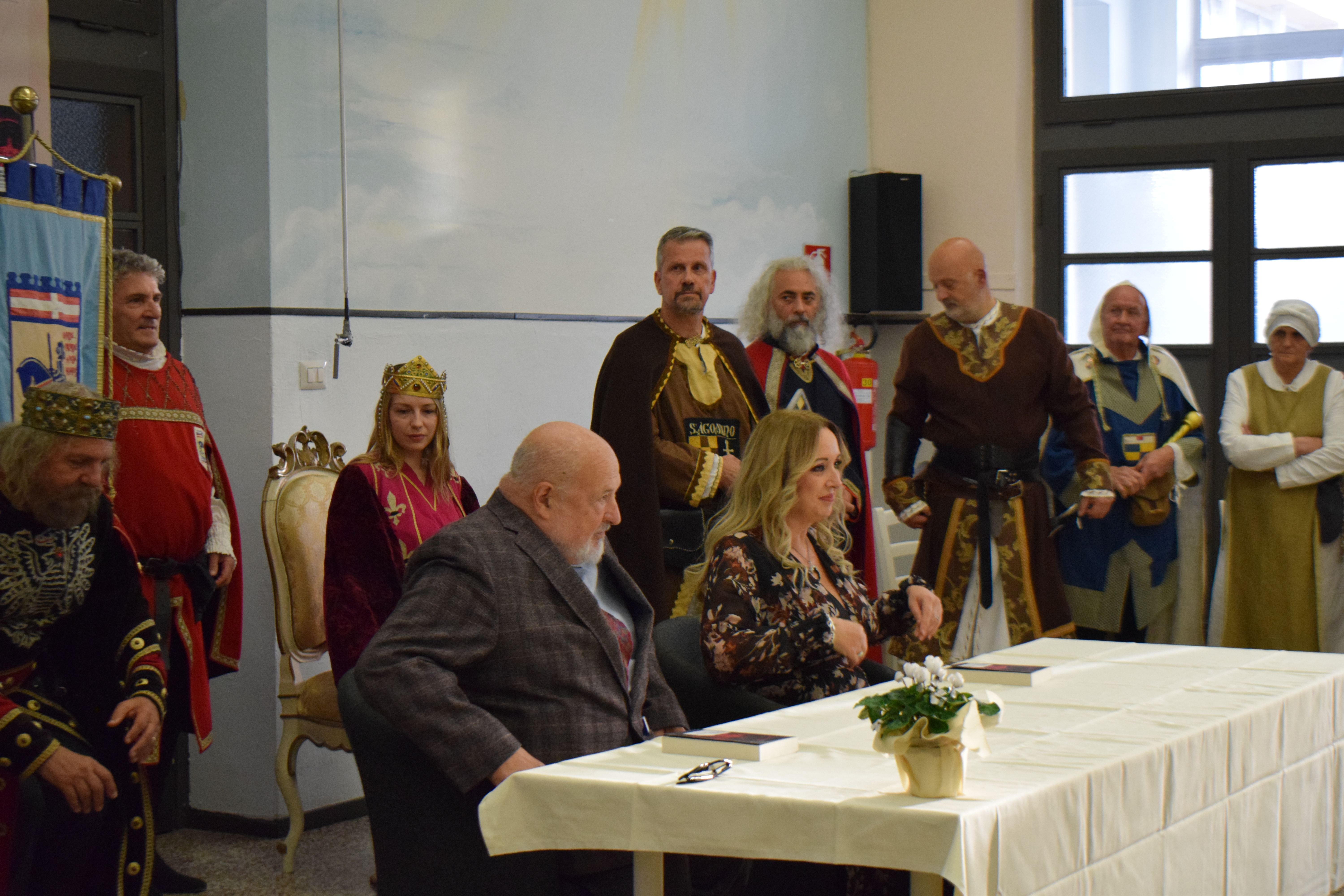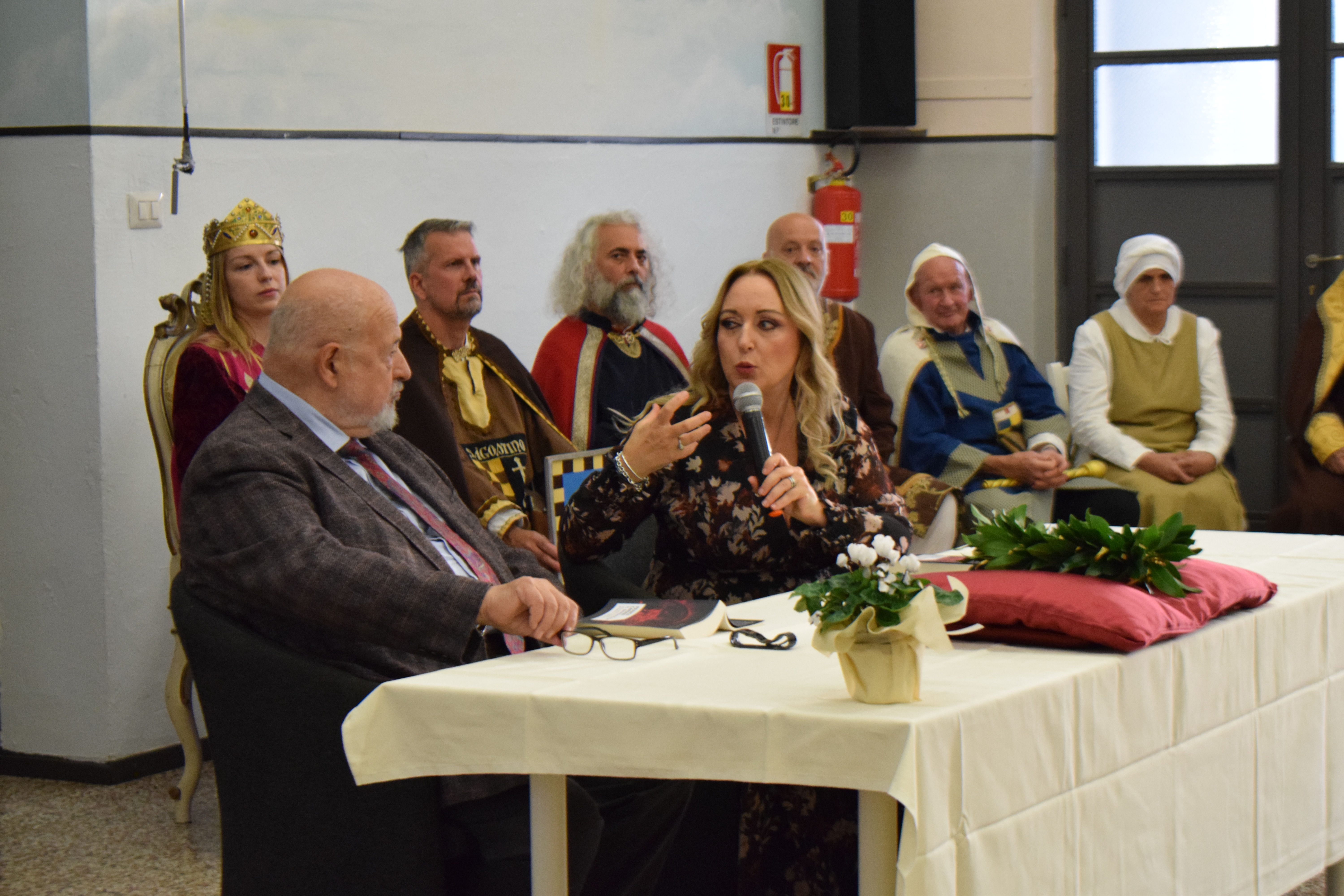 Uno dei passaggi più emozionanti dell’incontro è stato l’atto solenne con cui Federico Barbarossa ha “incoronato” Franco Cardini con una corona d’alloro, gesto carico di significato.