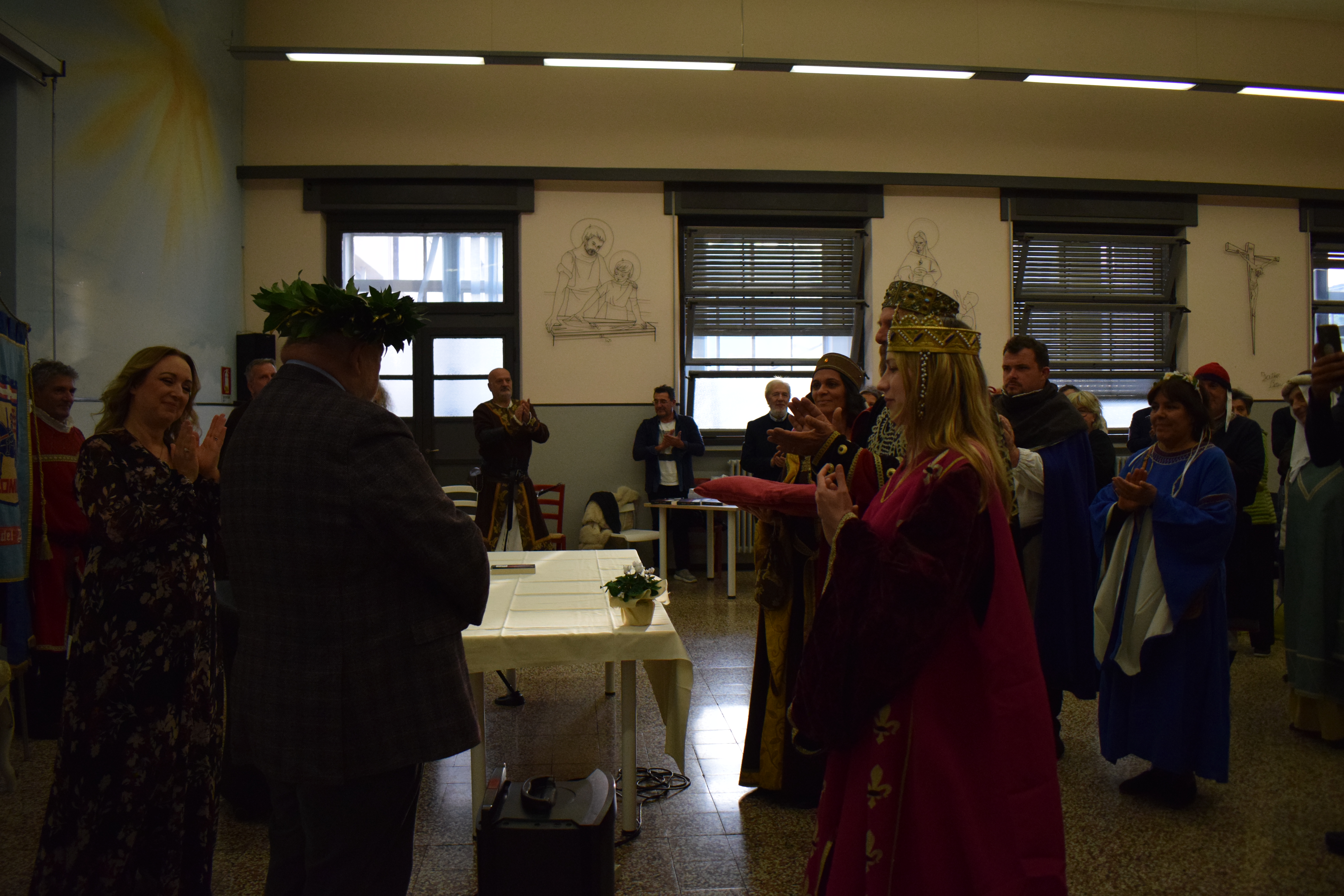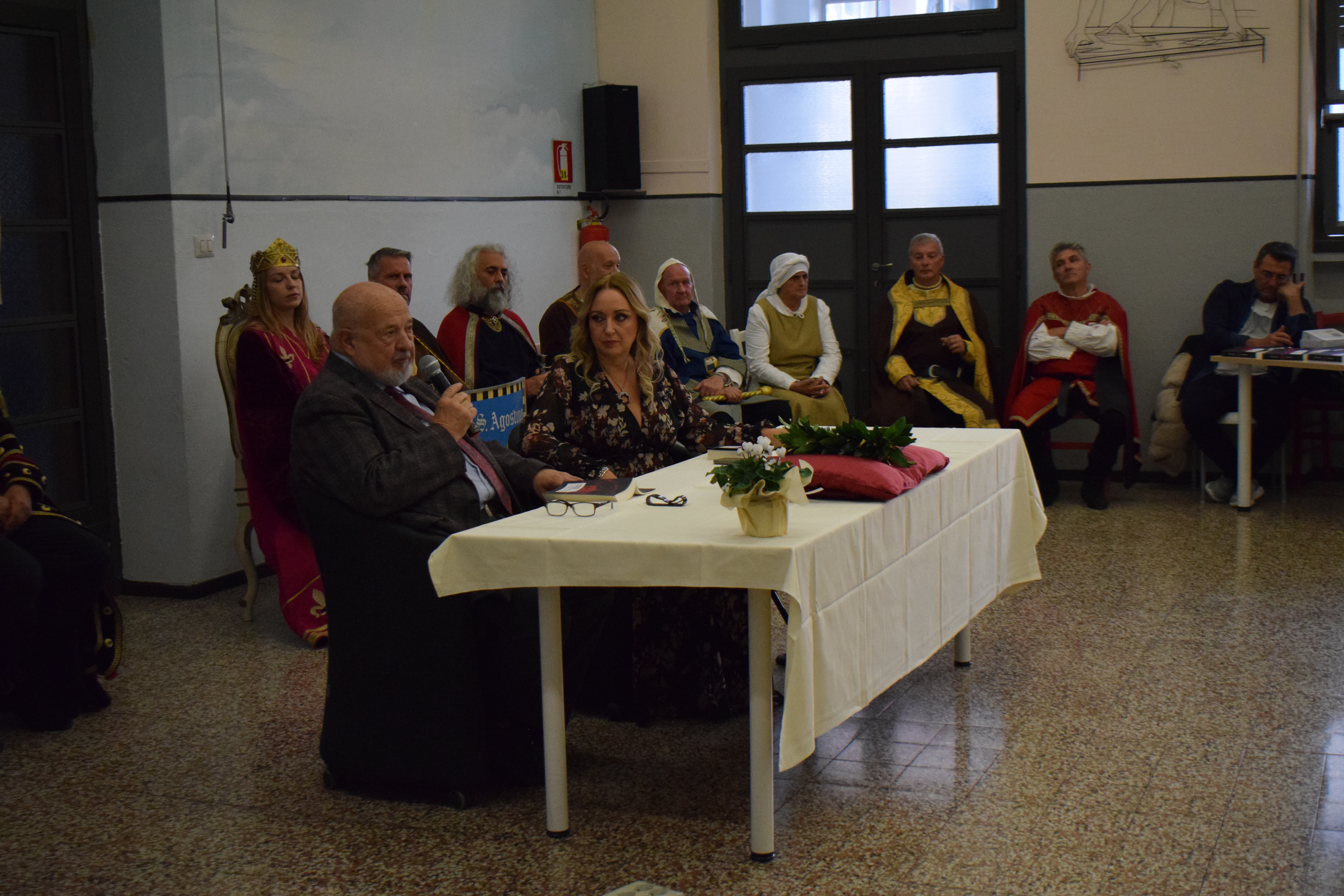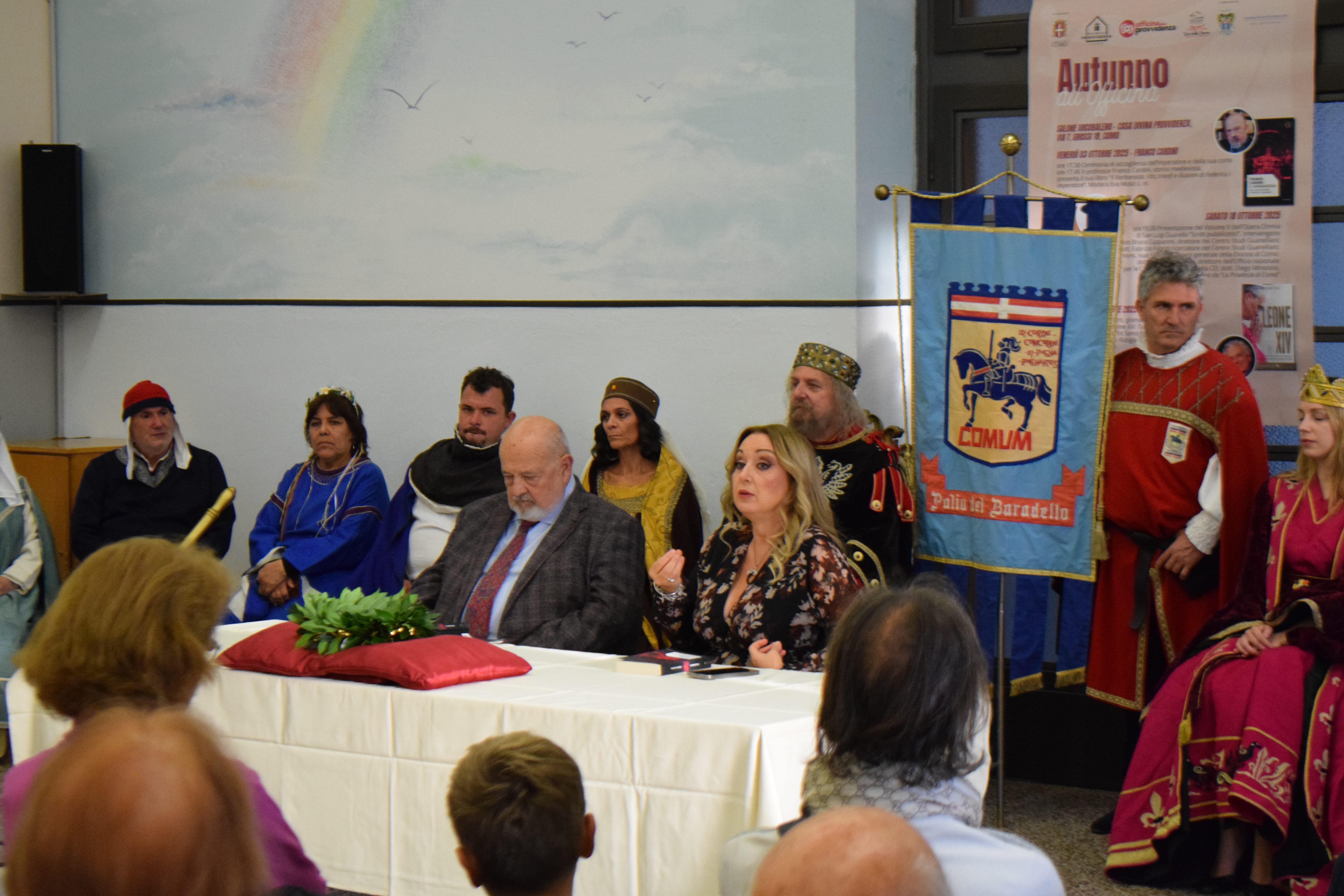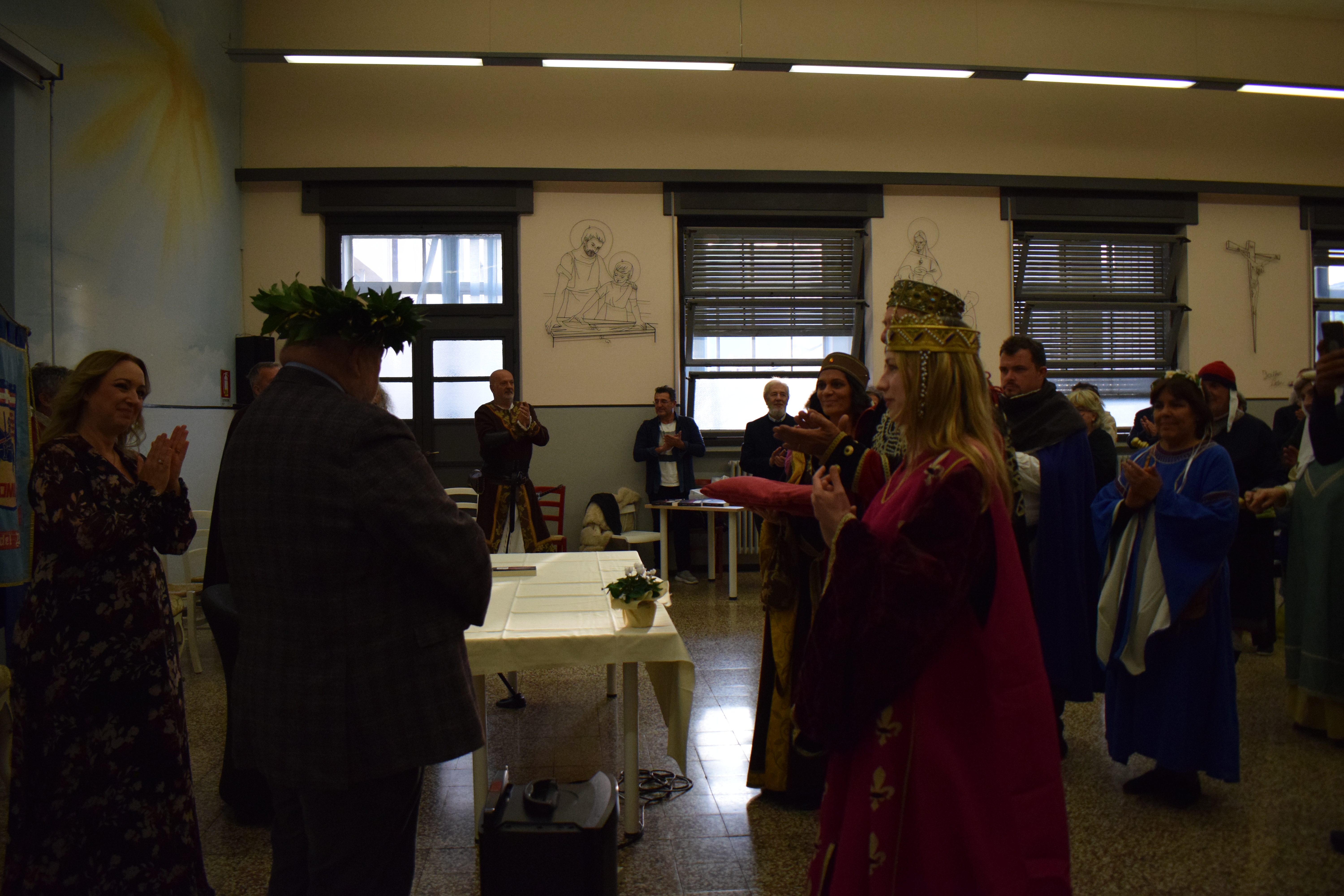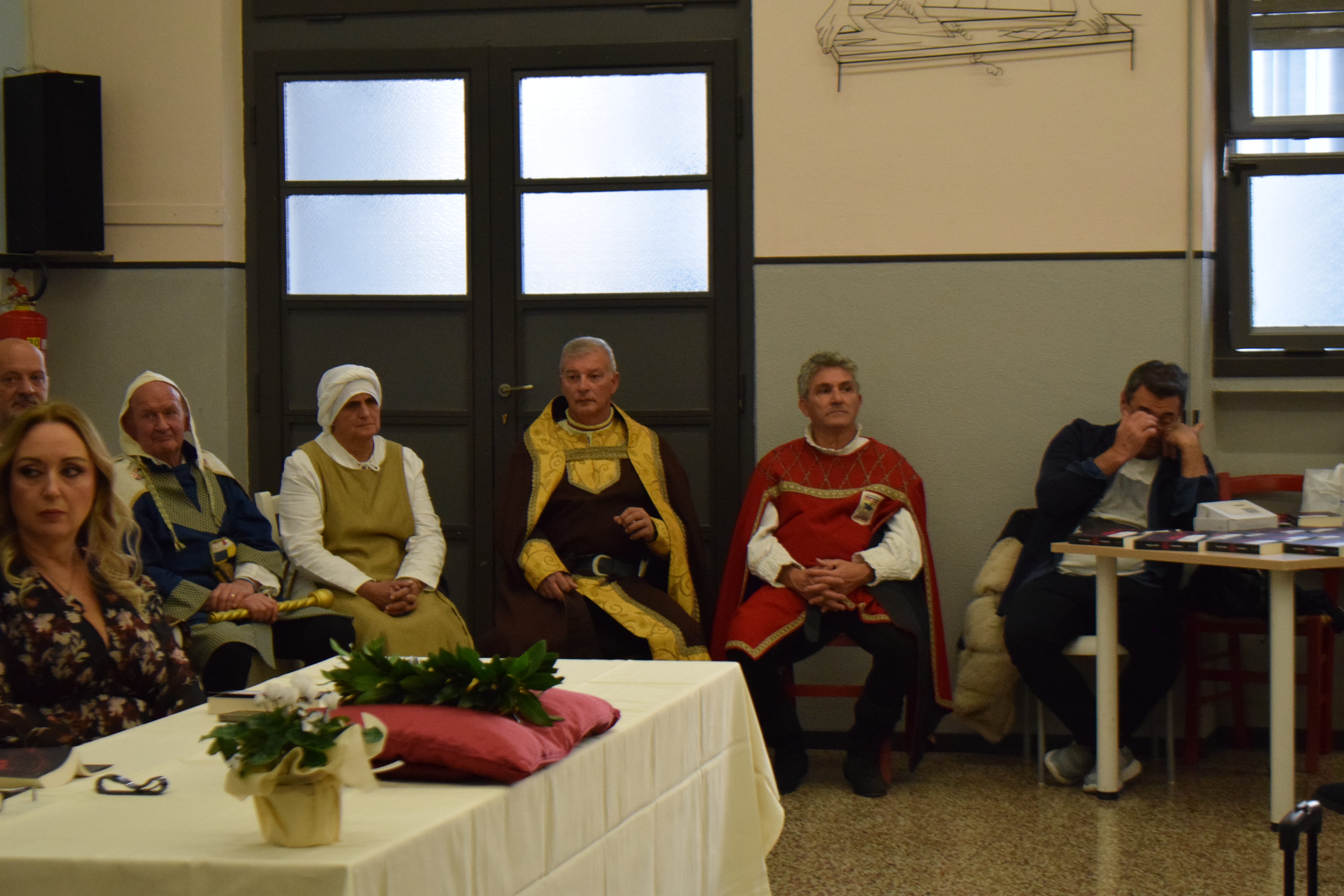 Uno dei passaggi più emozionanti dell’incontro è stato l’atto solenne con cui Federico Barbarossa ha “incoronato” Franco Cardini con una corona d’alloro, gesto carico di significato.