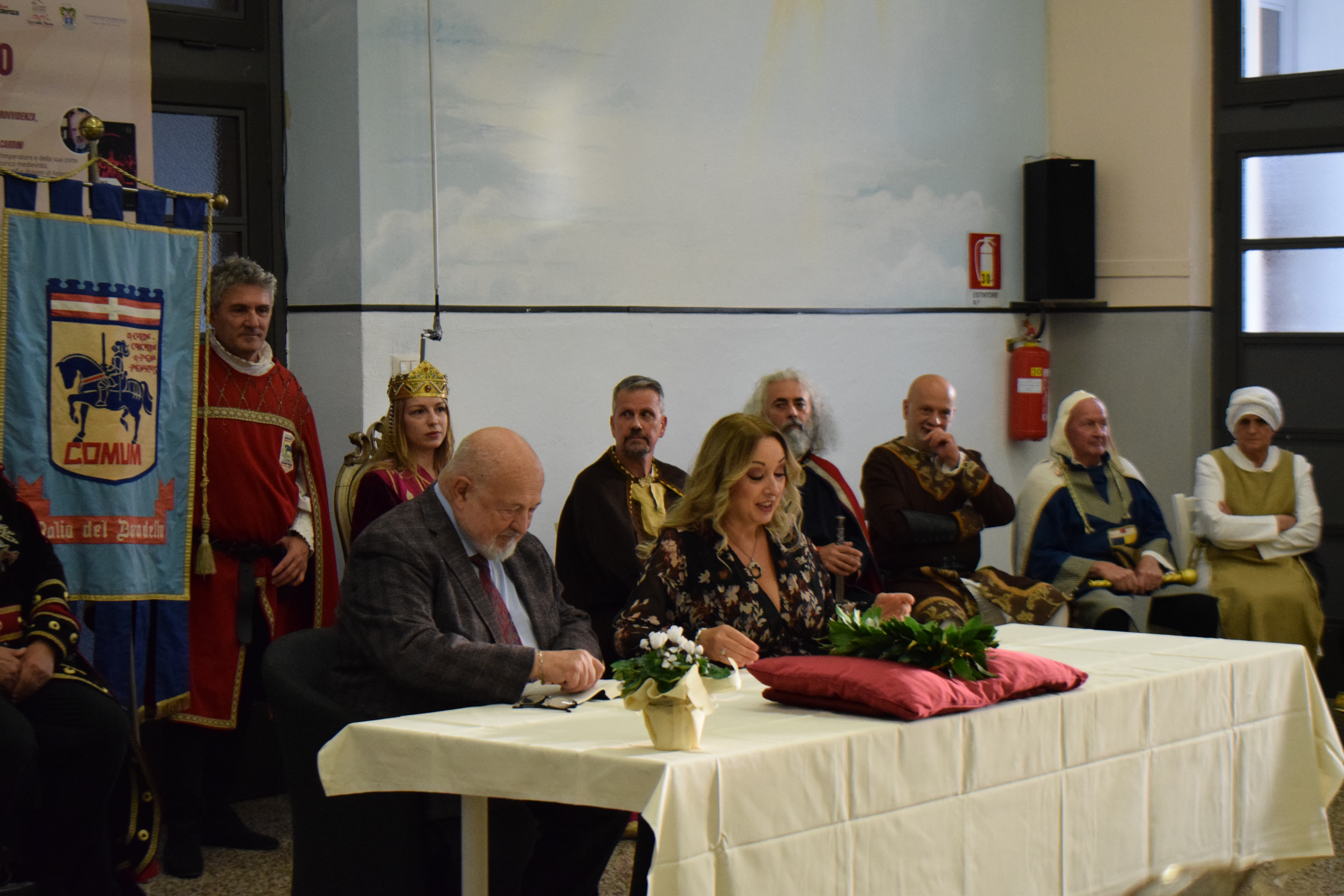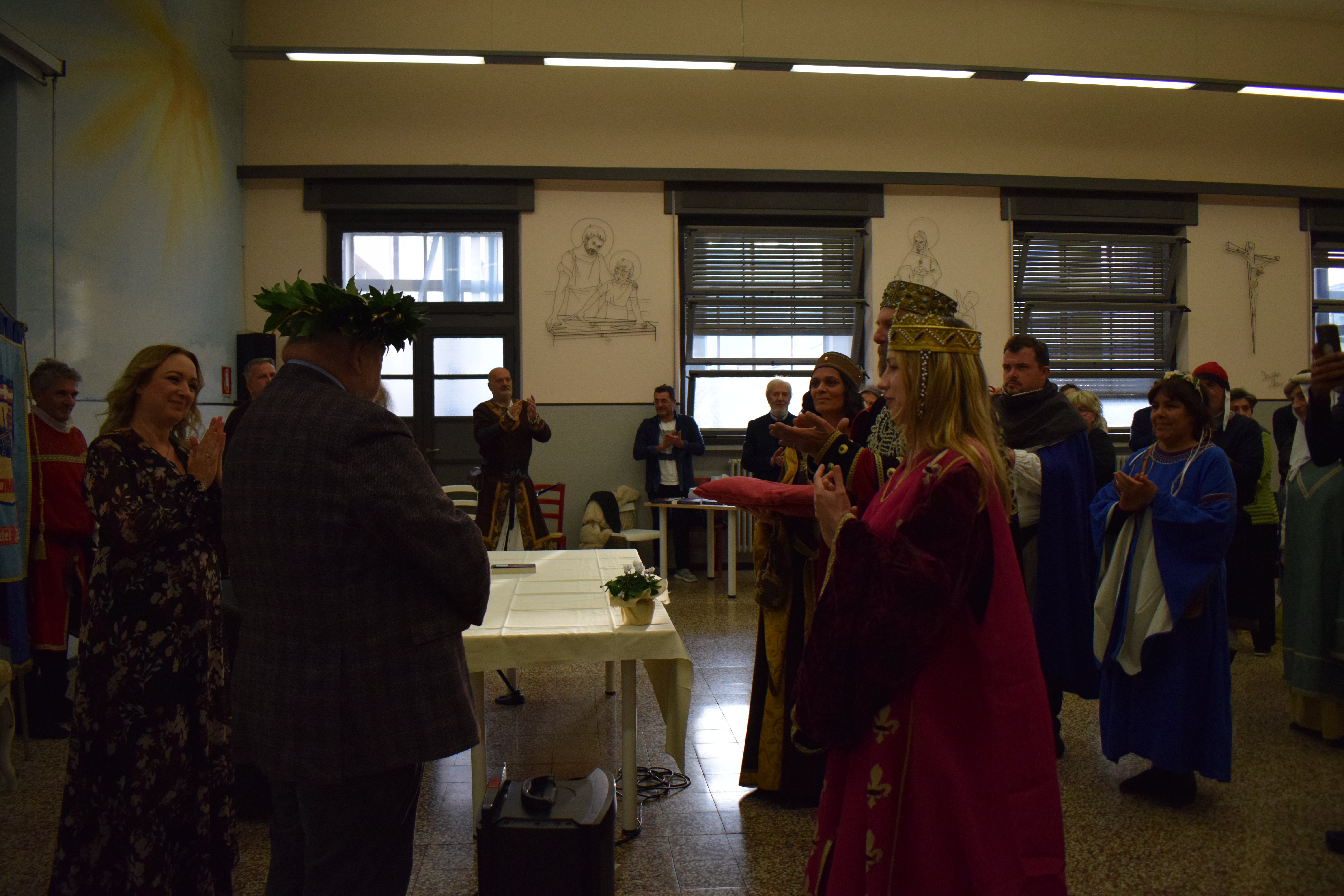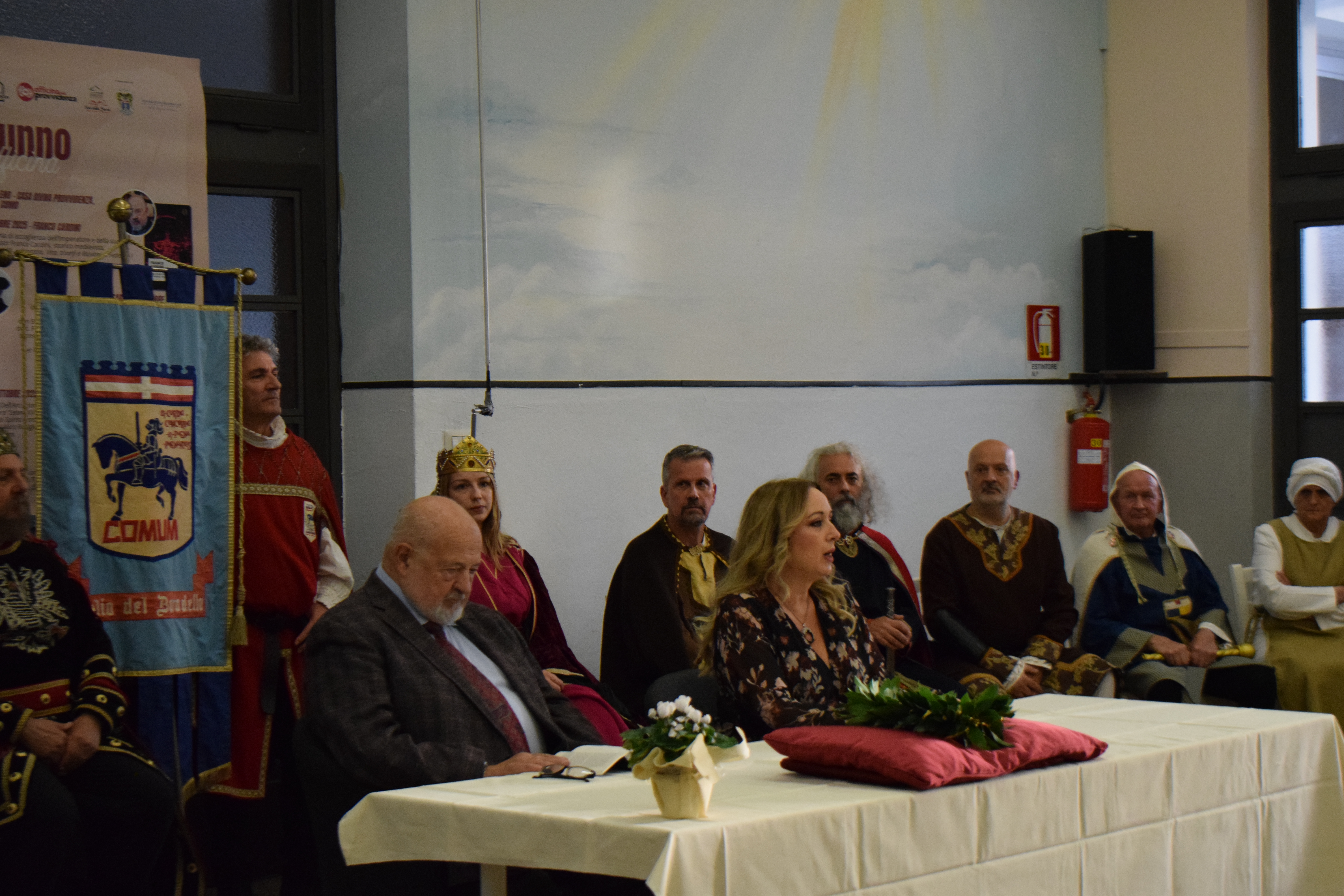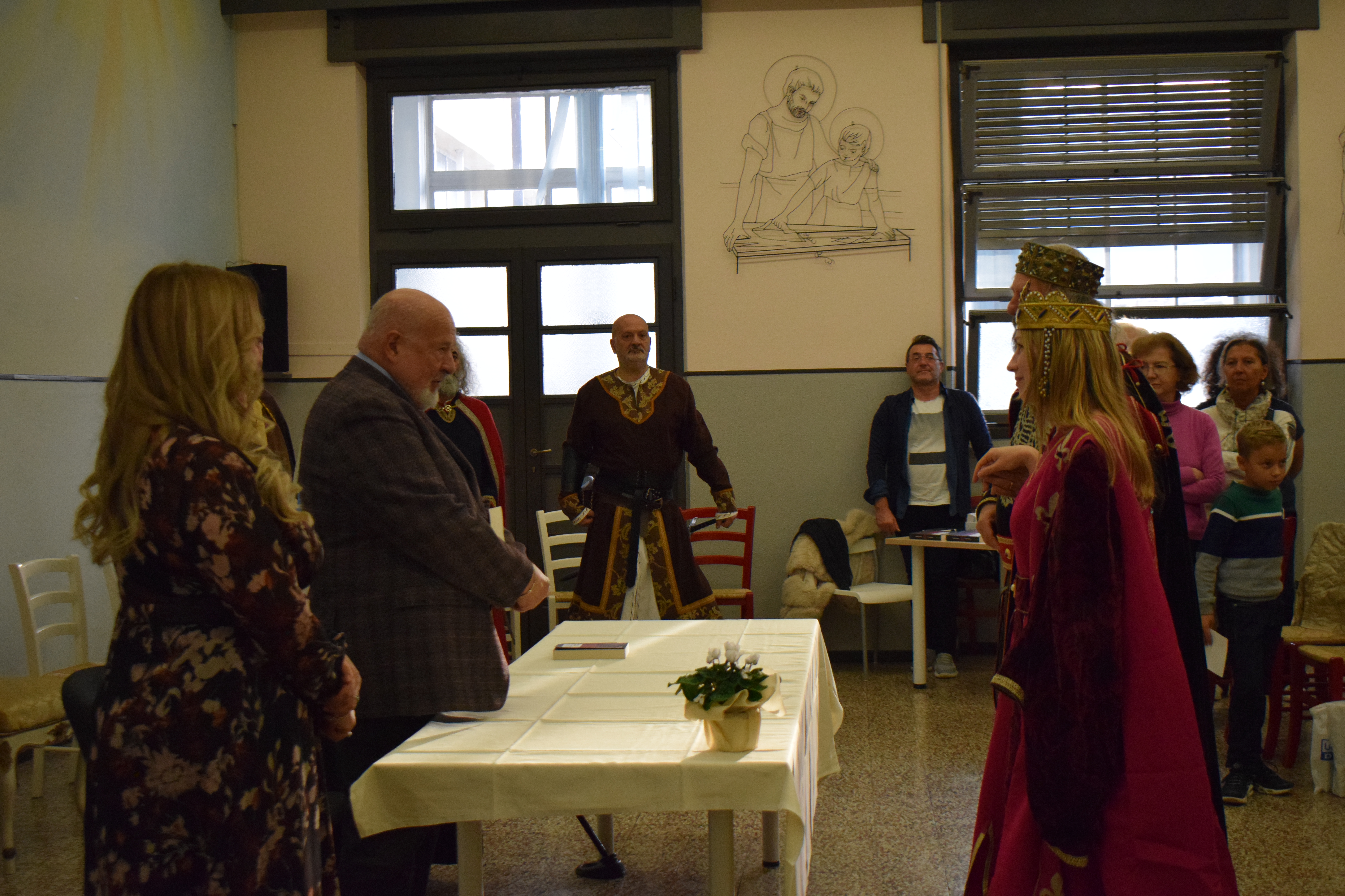 Uno dei passaggi più emozionanti dell’incontro è stato l’atto solenne con cui Federico Barbarossa ha “incoronato” Franco Cardini con una corona d’alloro, gesto carico di significato.