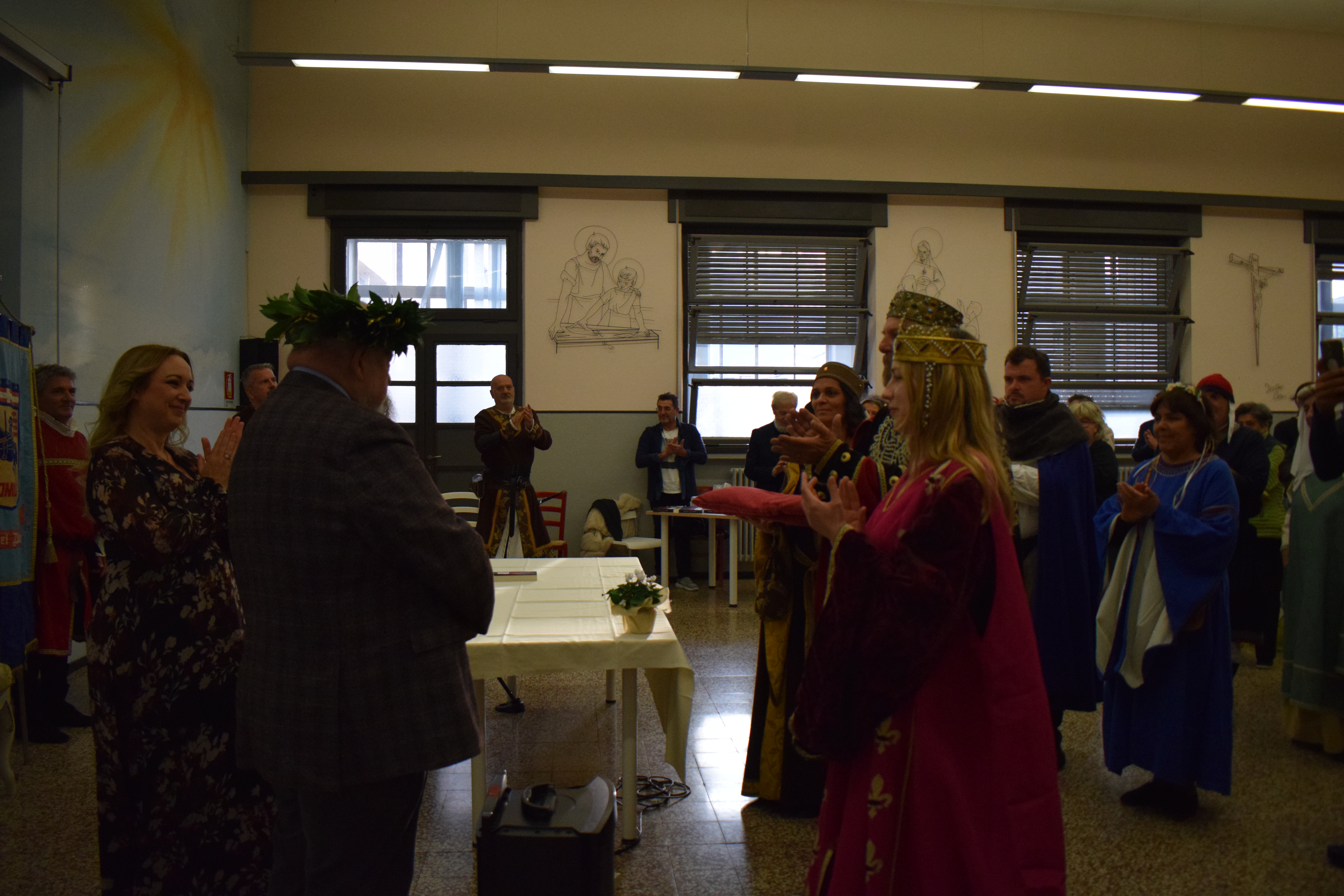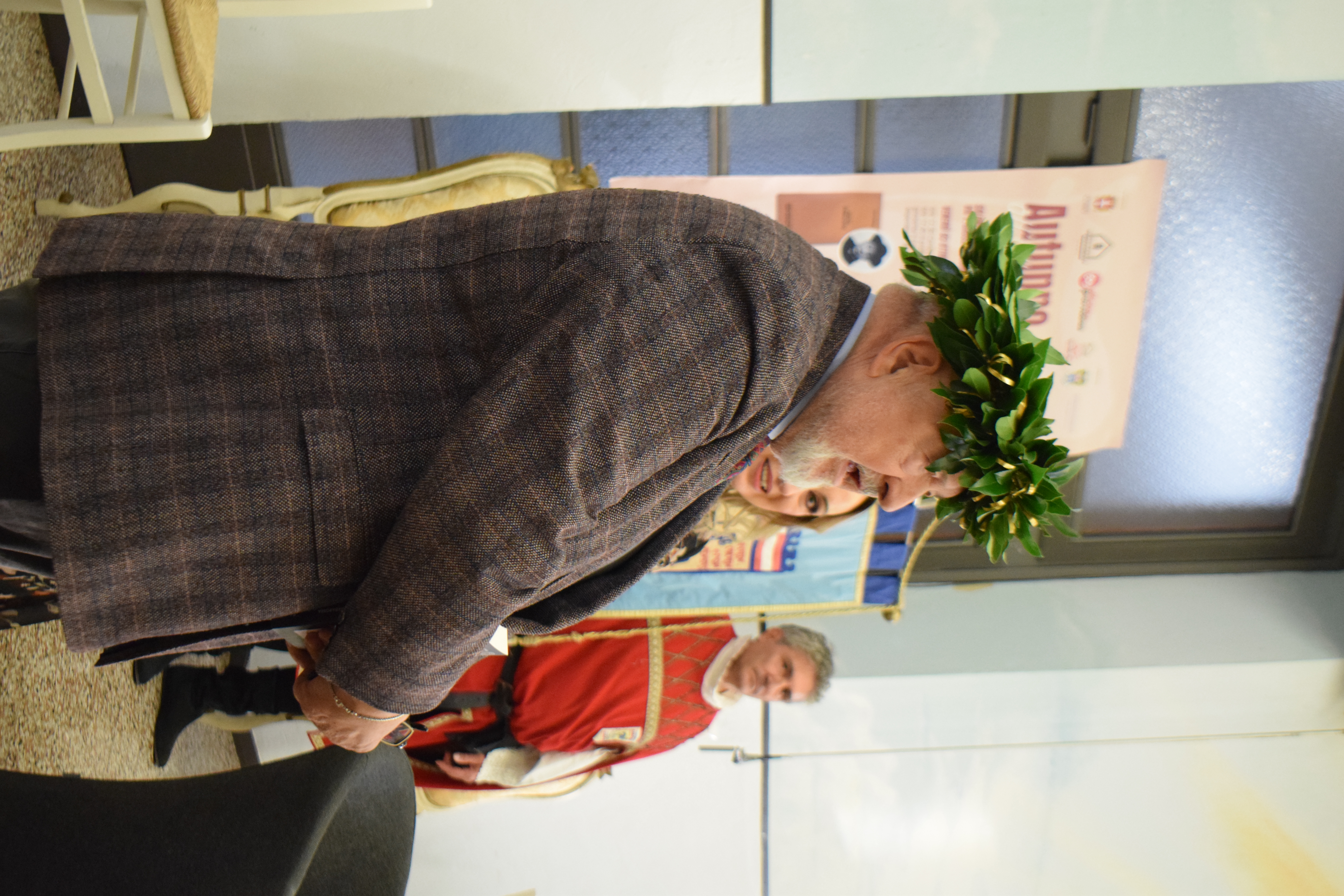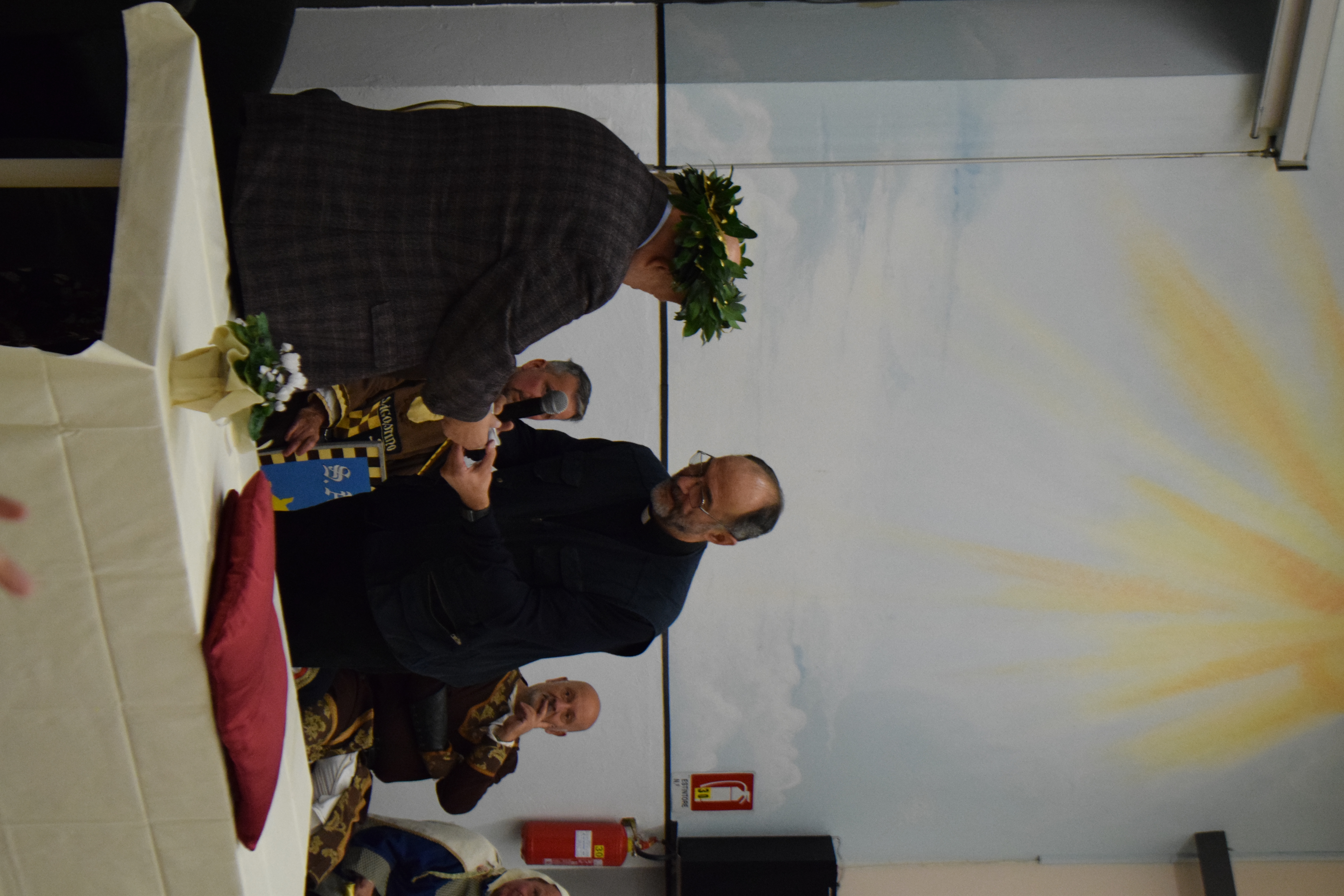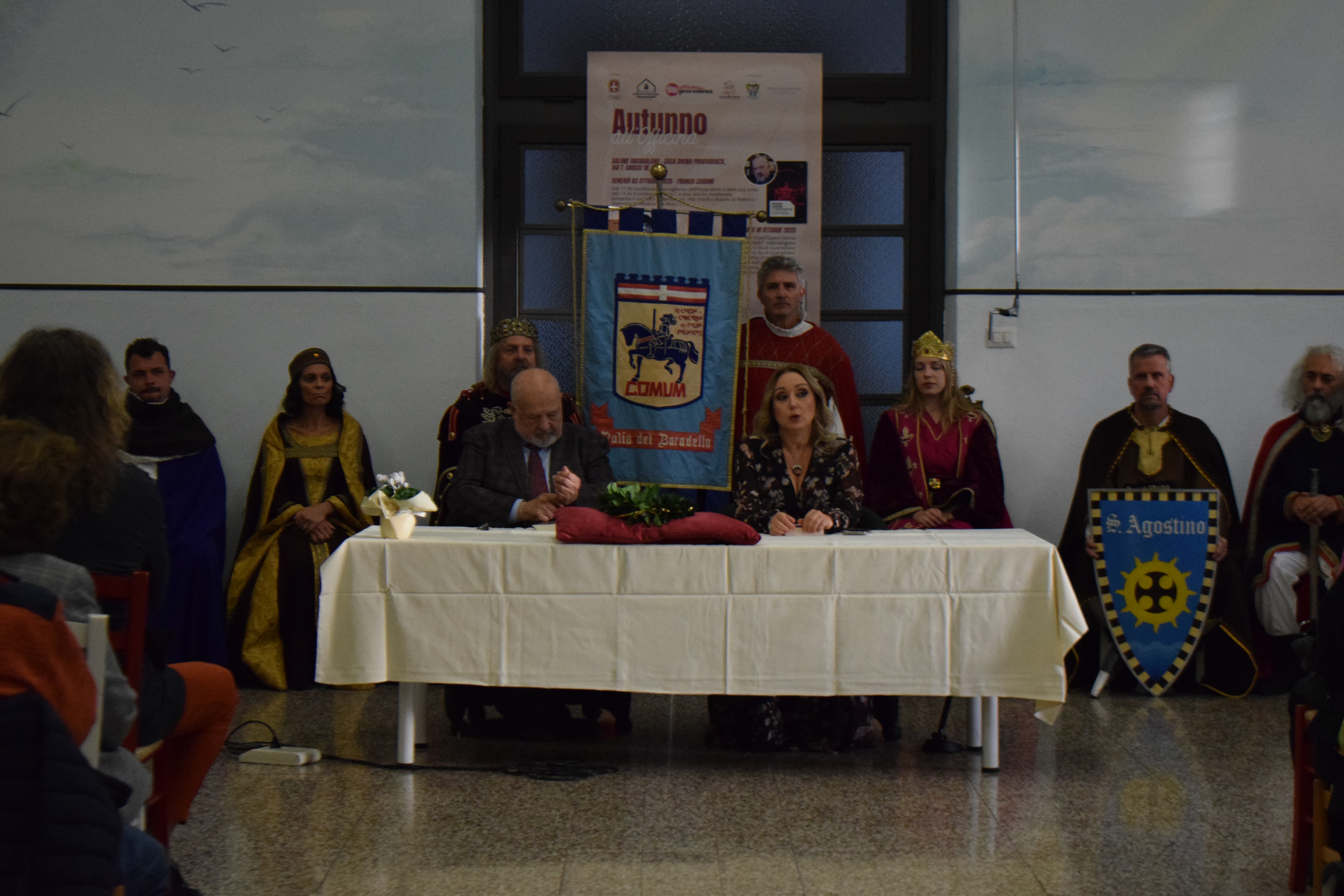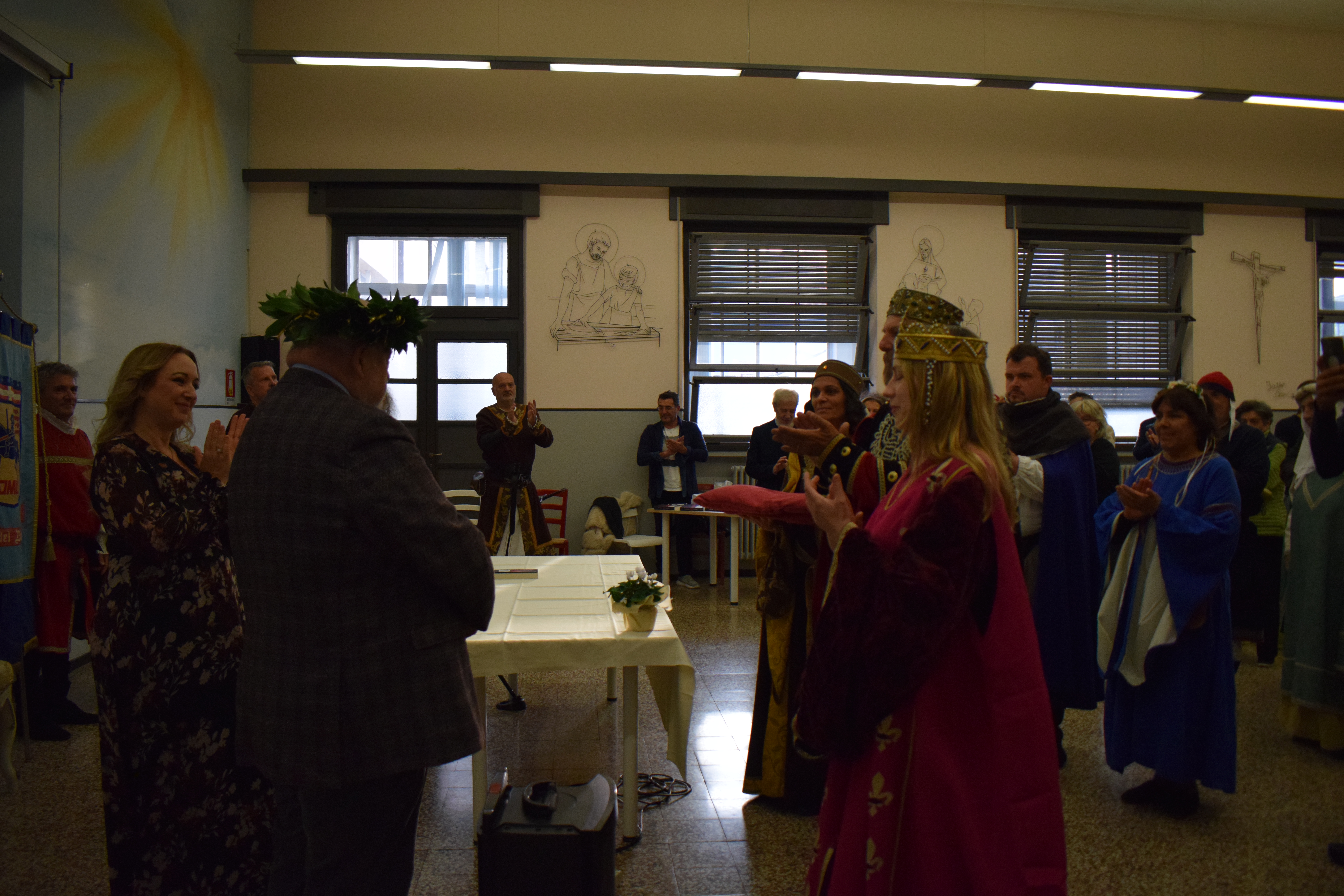 Uno dei passaggi più emozionanti dell’incontro è stato l’atto solenne con cui Federico Barbarossa ha “incoronato” Franco Cardini con una corona d’alloro, gesto carico di significato.