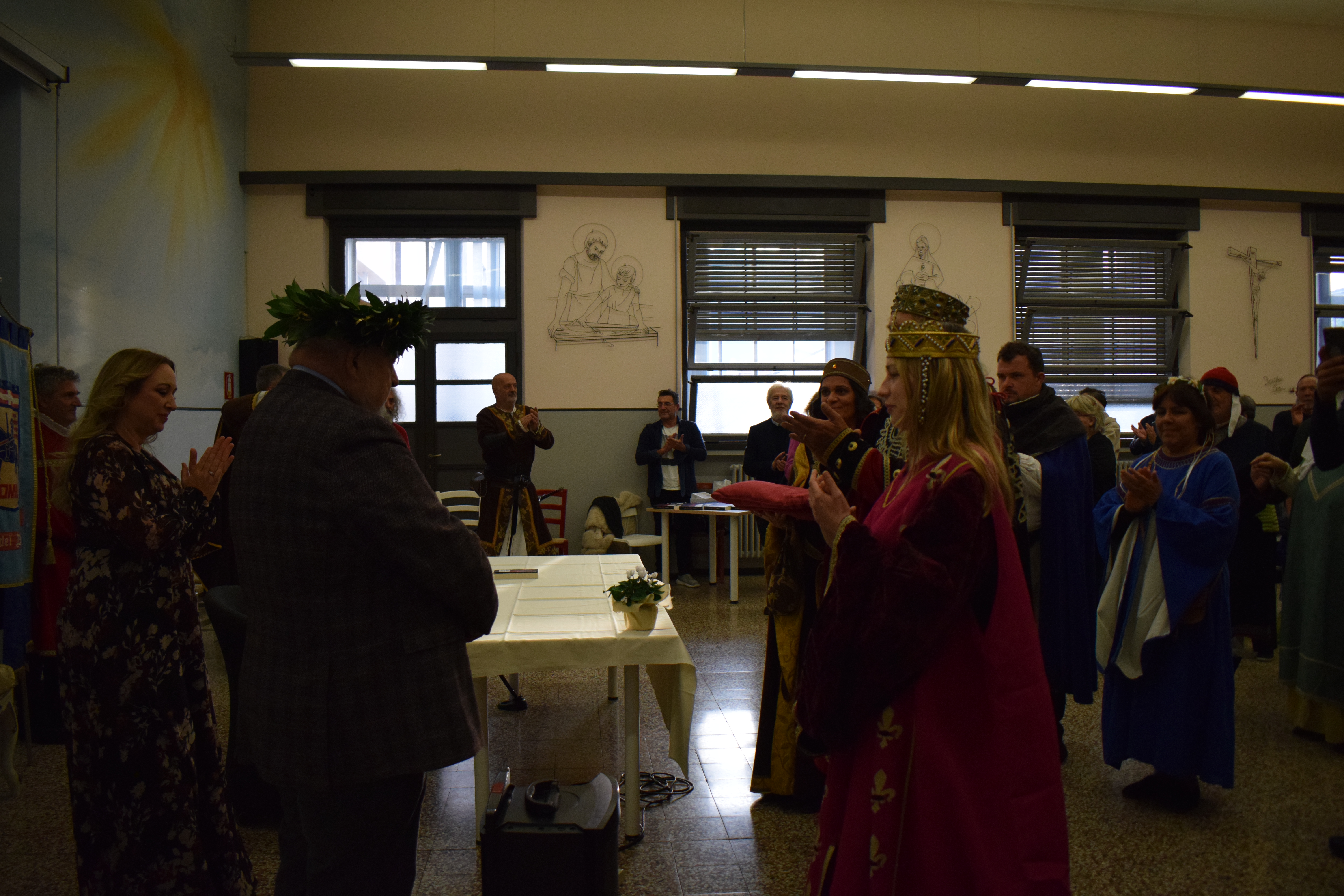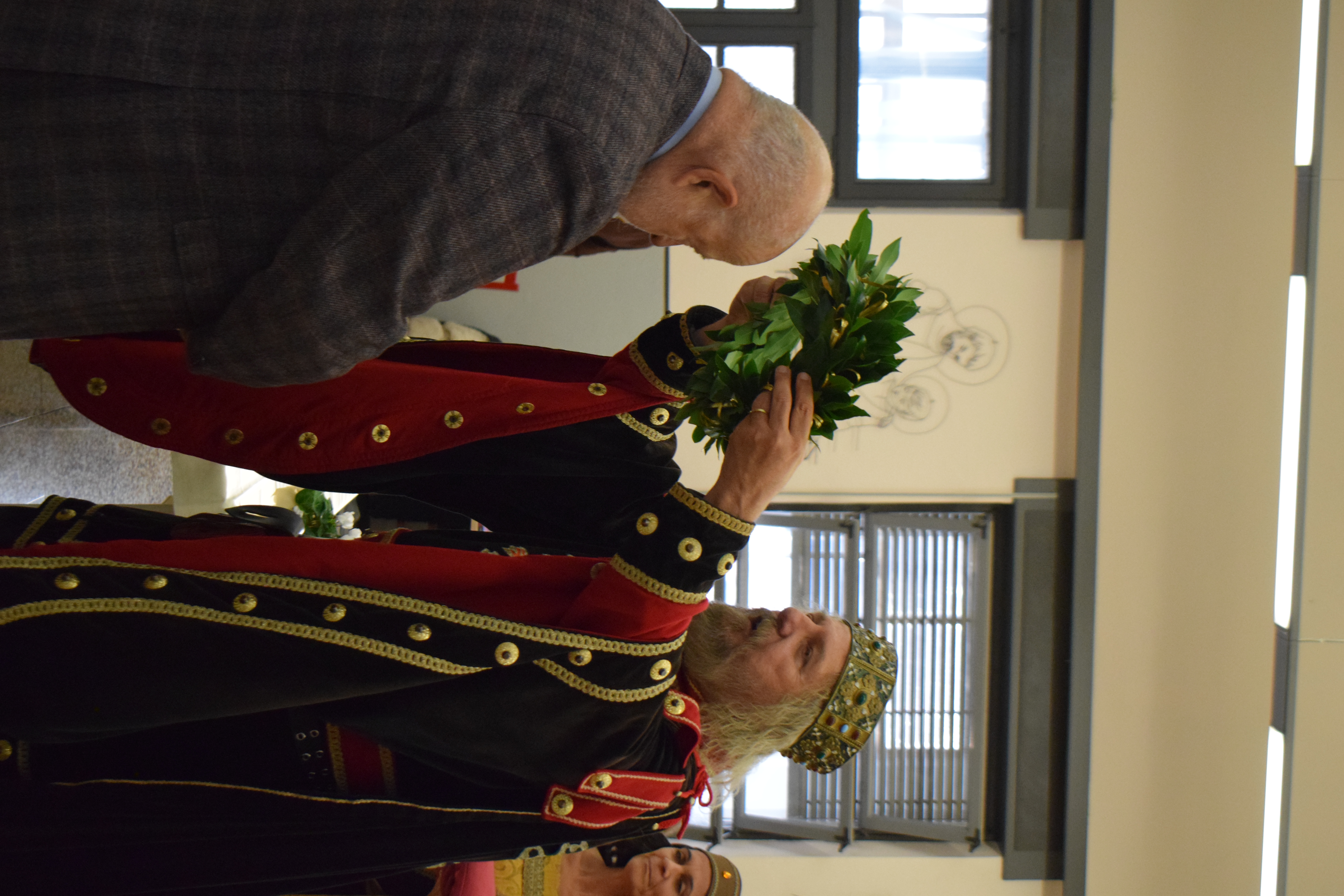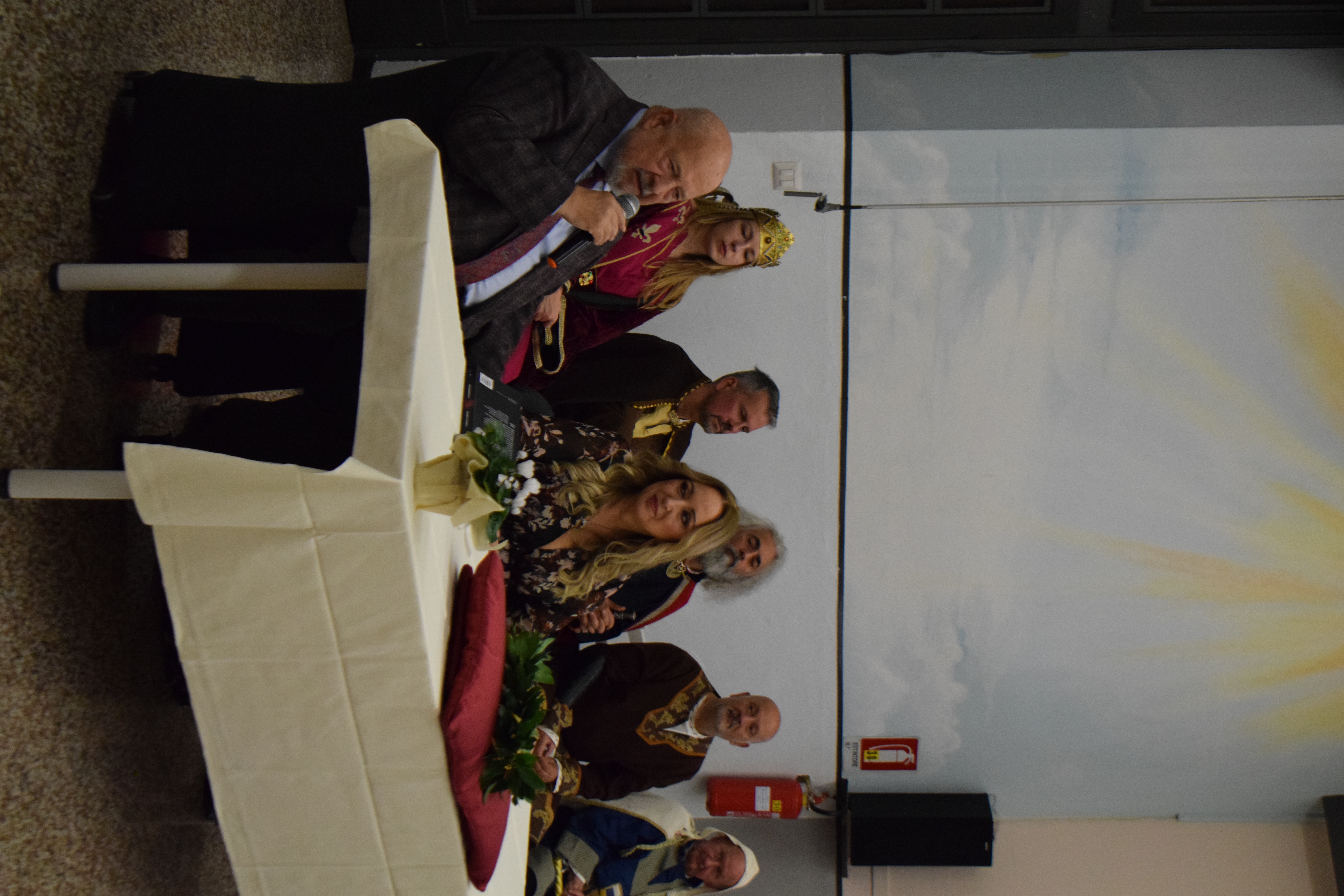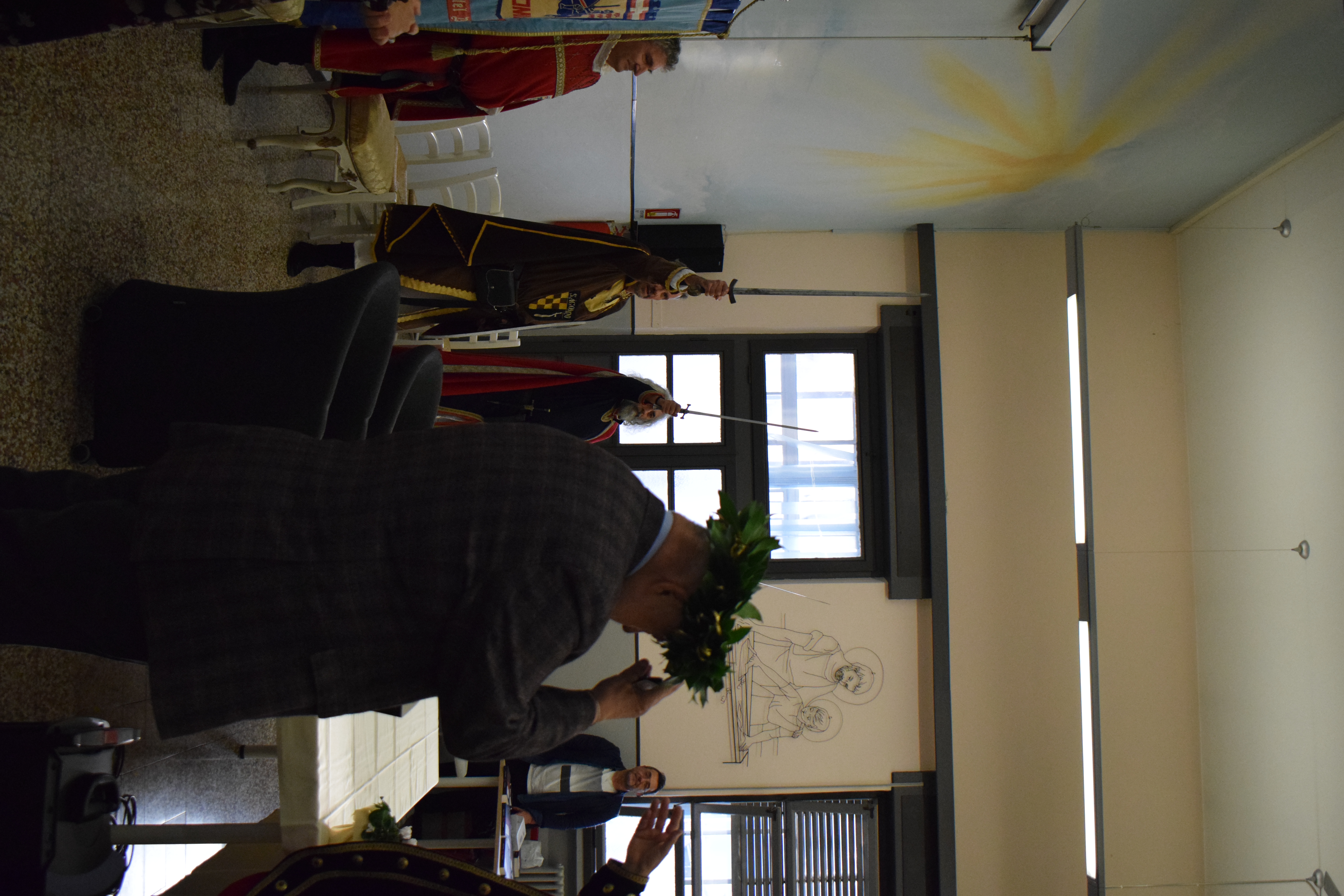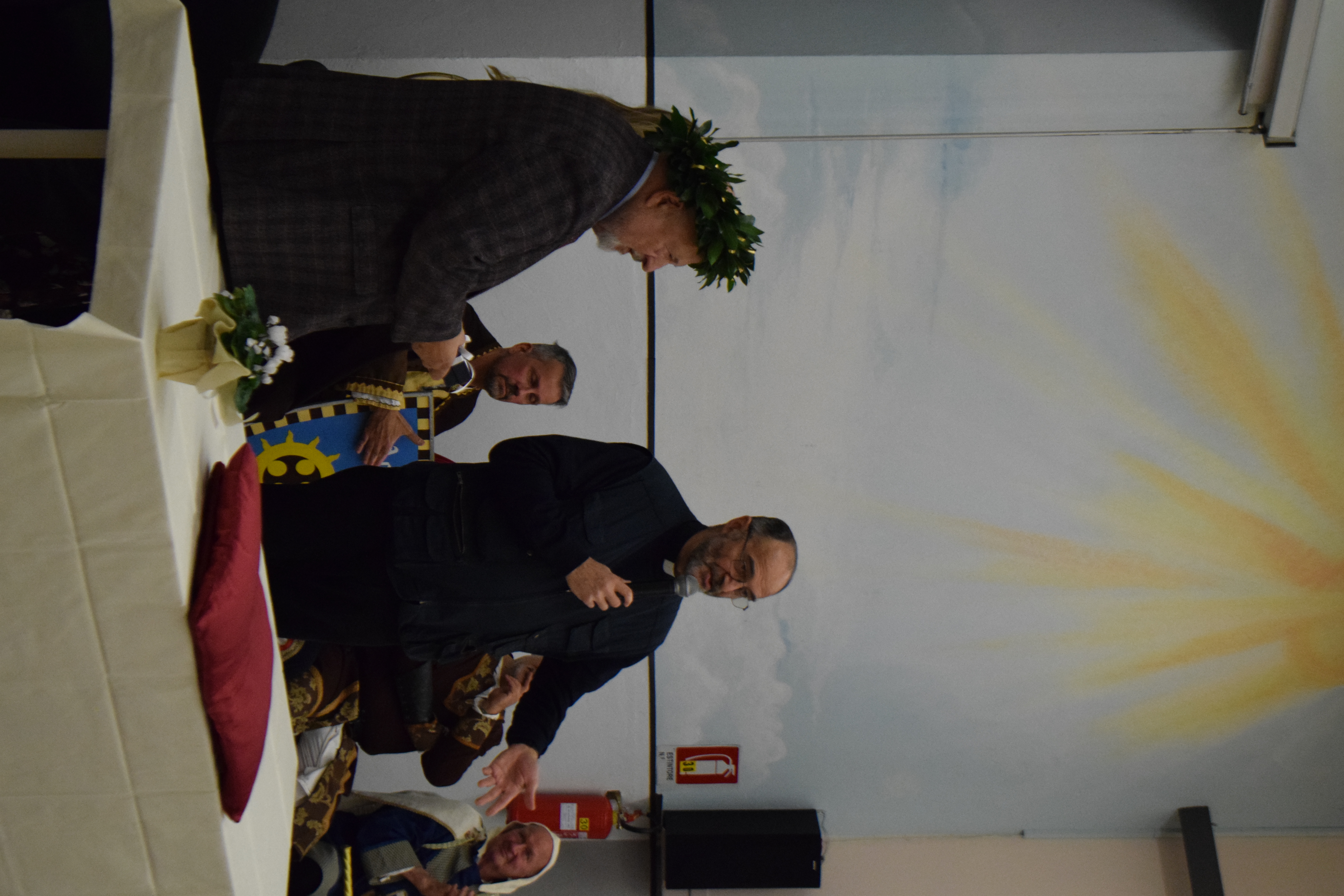 Uno dei passaggi più emozionanti dell’incontro è stato l’atto solenne con cui Federico Barbarossa ha “incoronato” Franco Cardini con una corona d’alloro, gesto carico di significato.