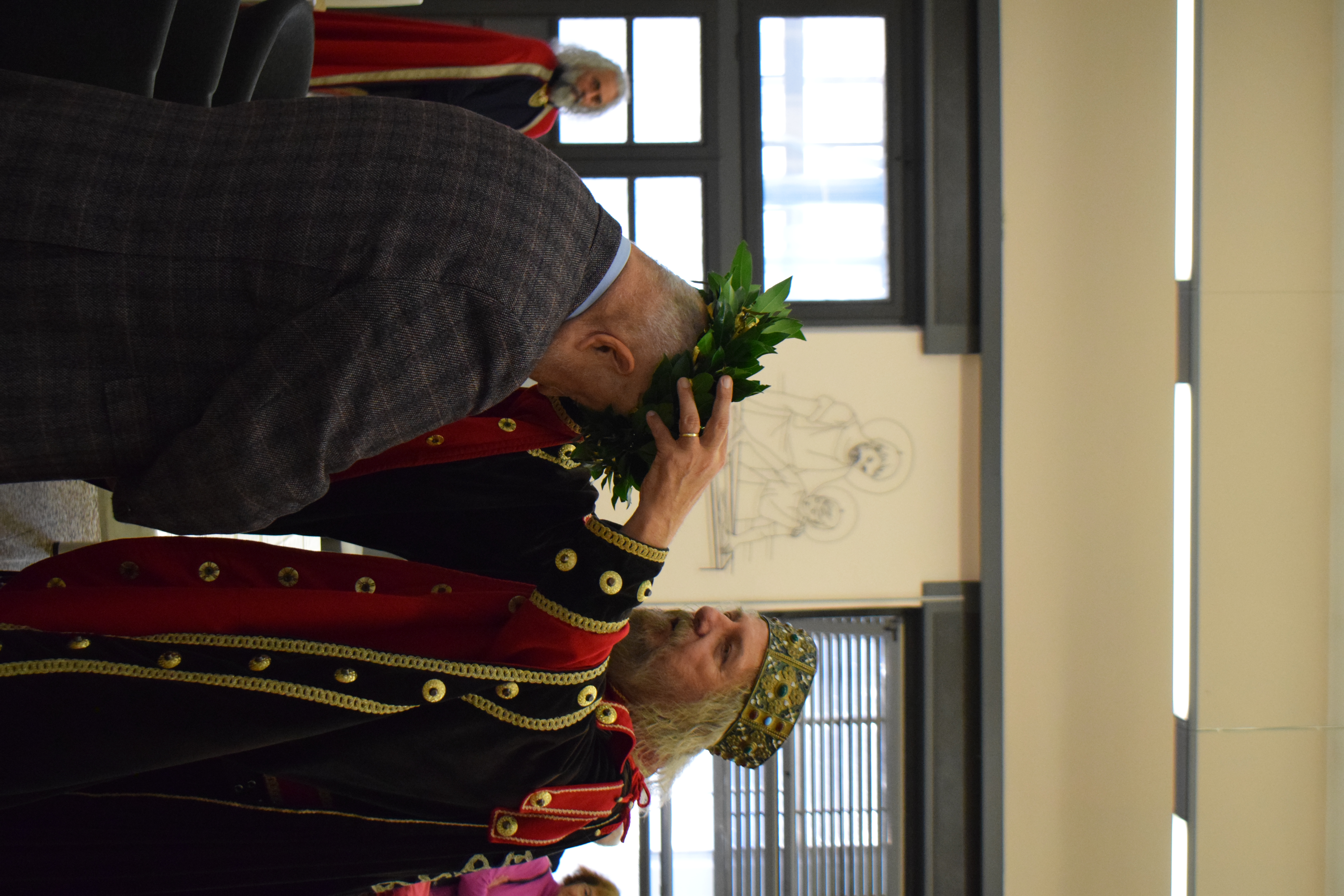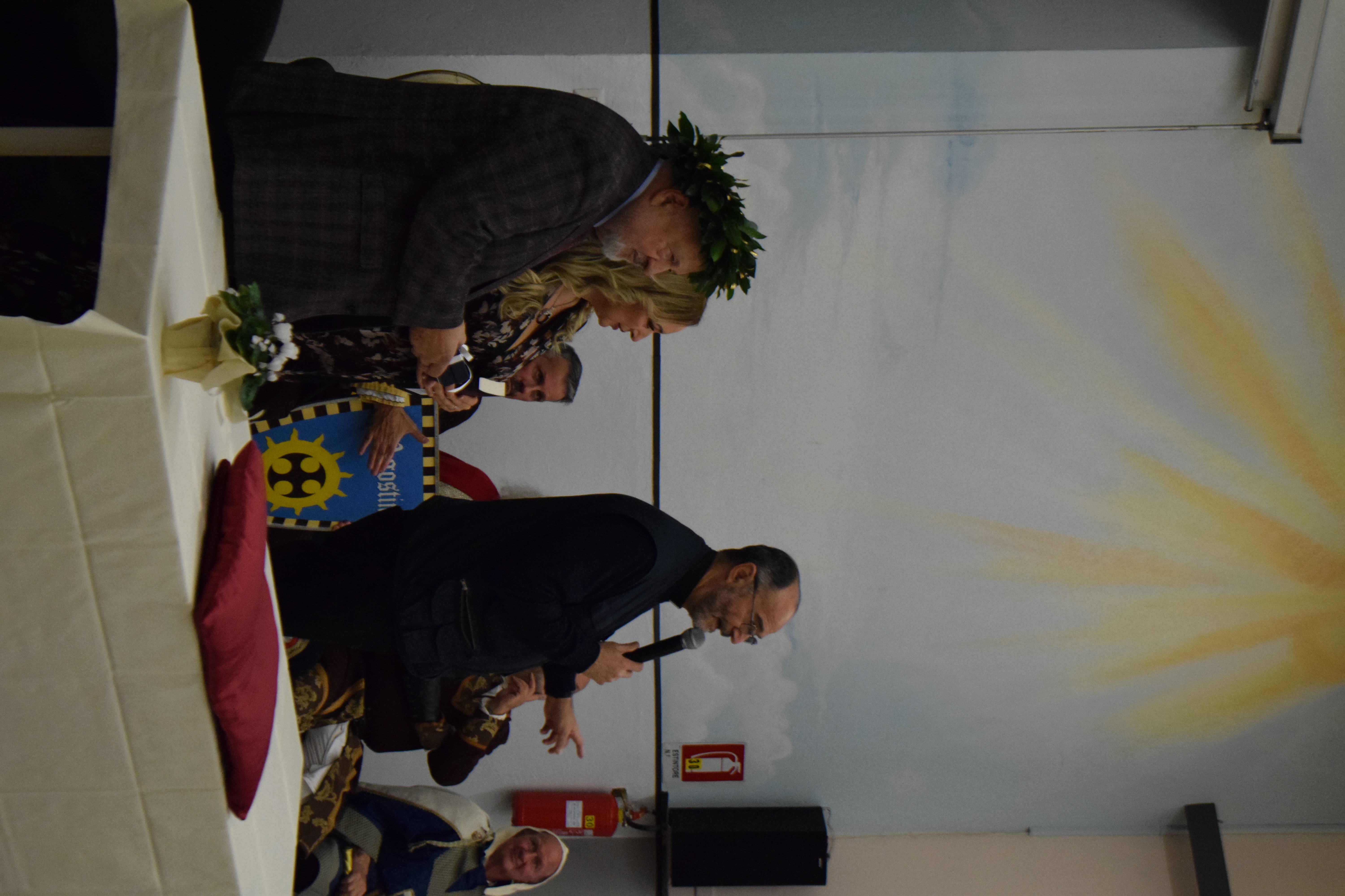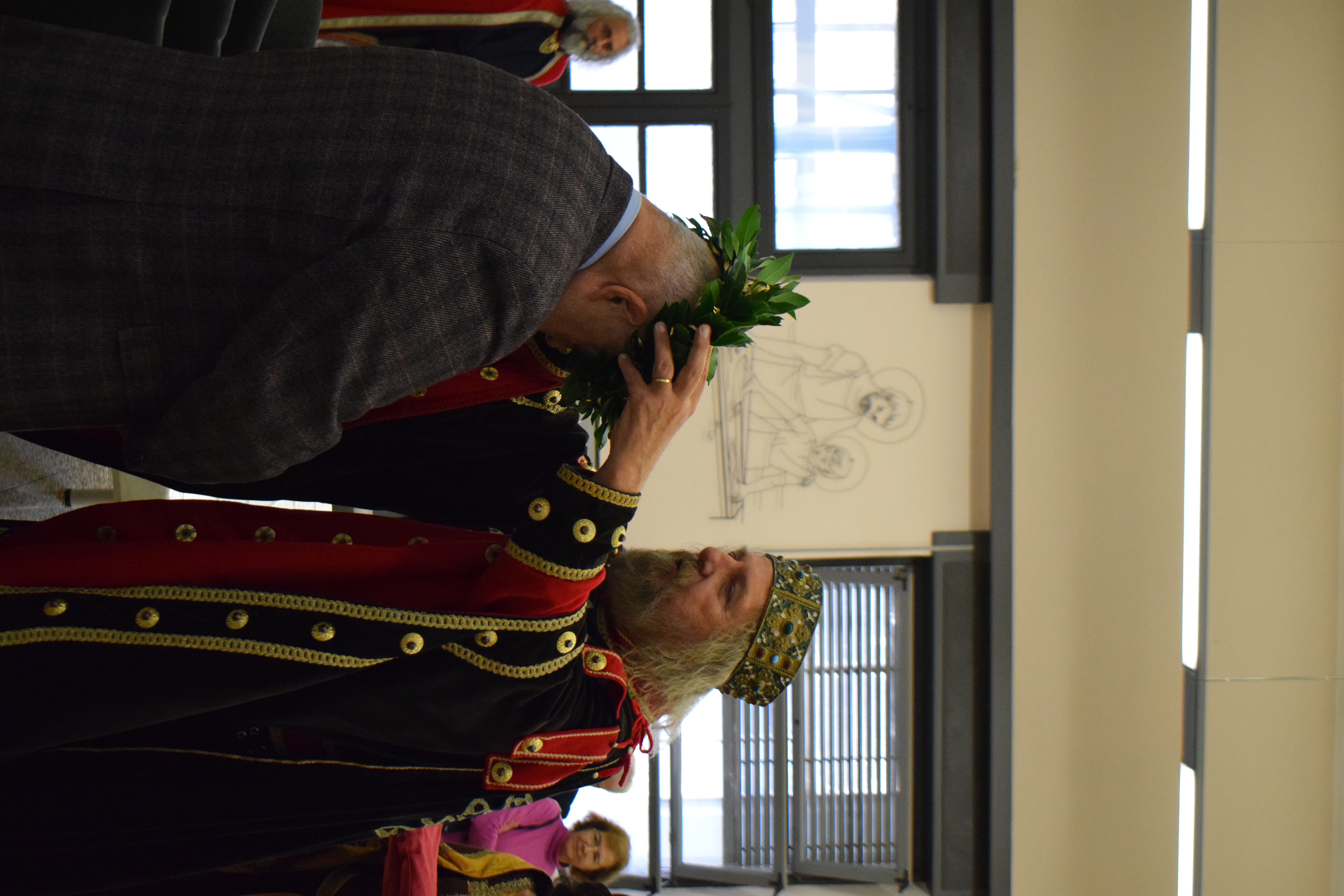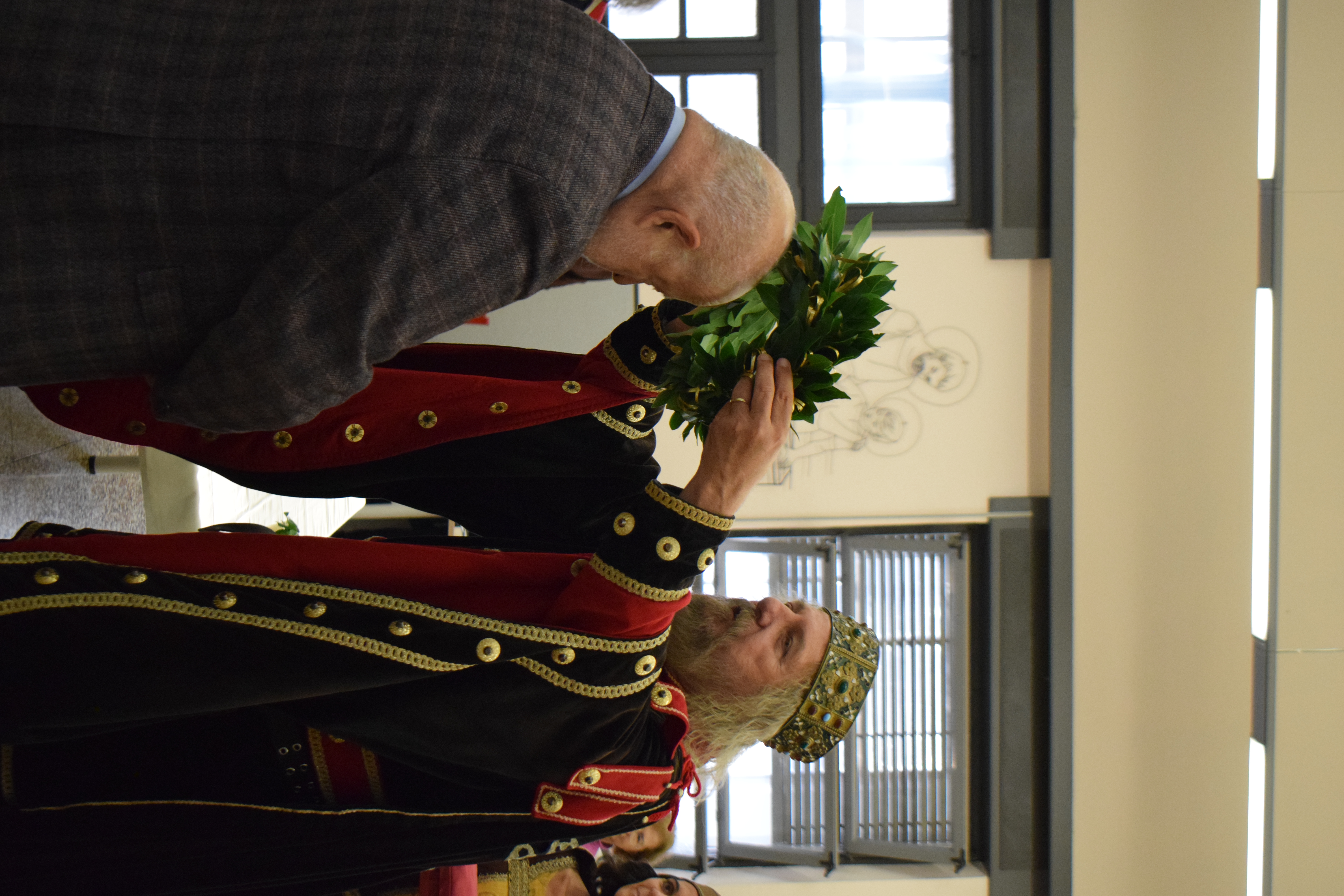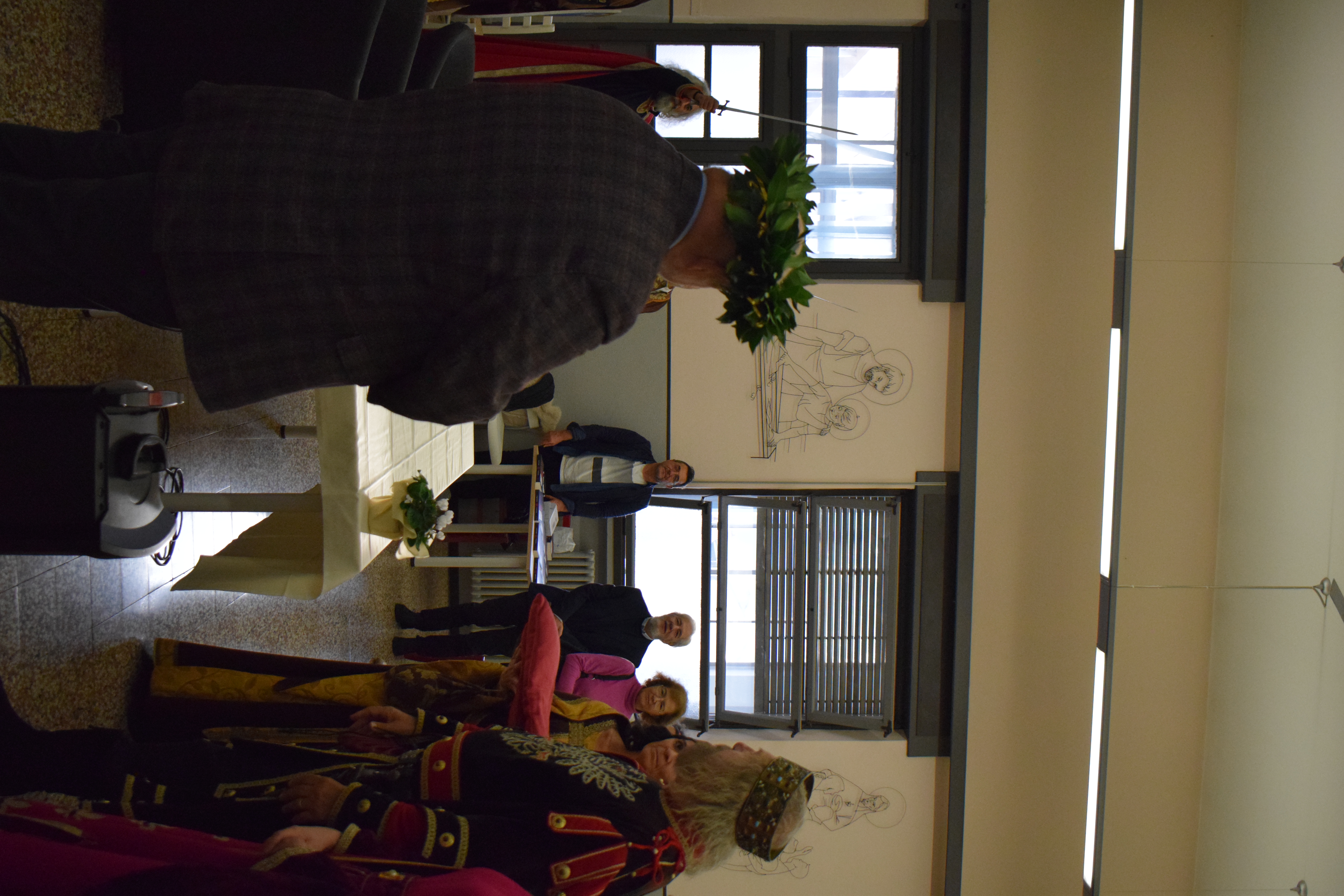 Uno dei passaggi più emozionanti dell’incontro è stato l’atto solenne con cui Federico Barbarossa ha “incoronato” Franco Cardini con una corona d’alloro, gesto carico di significato.