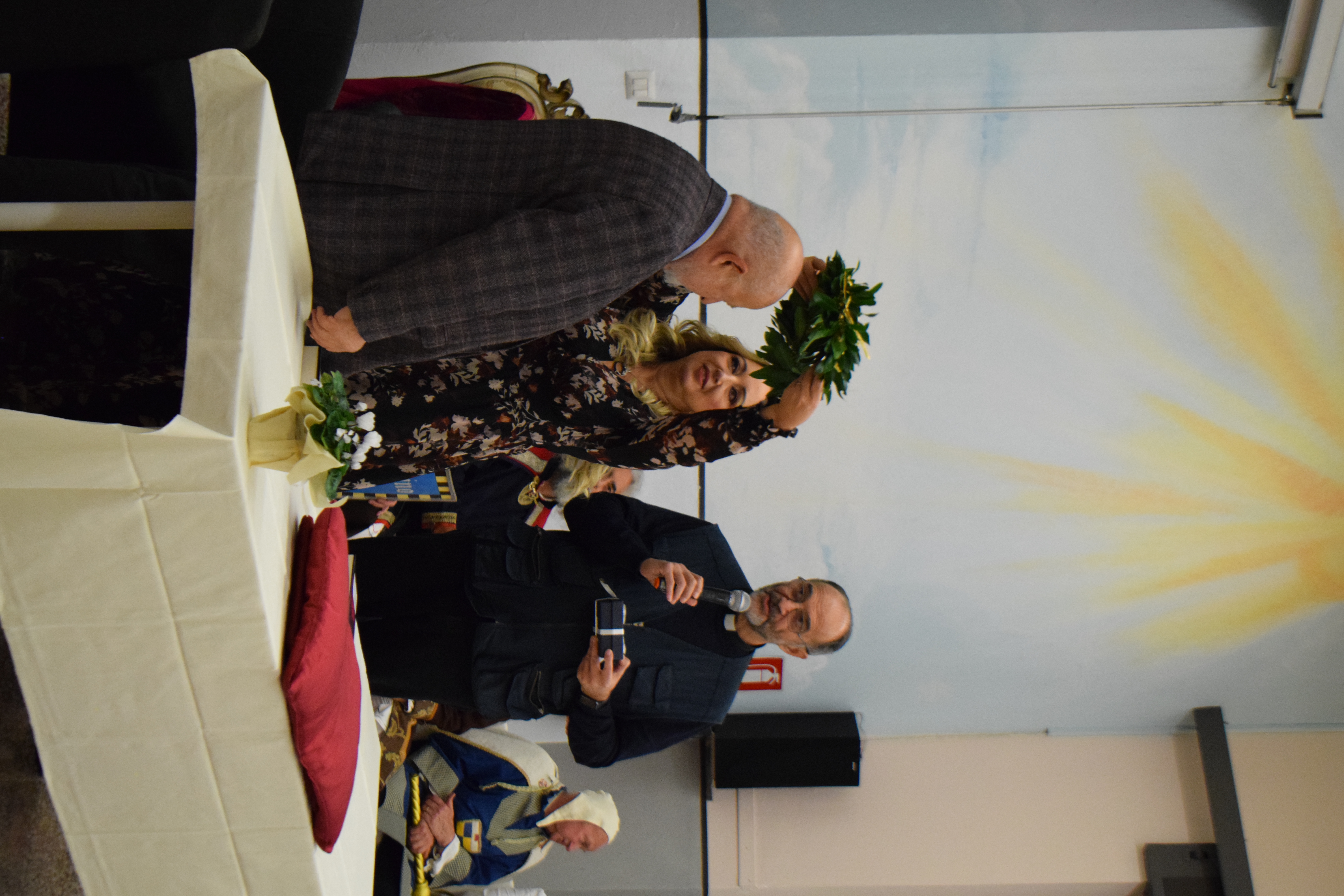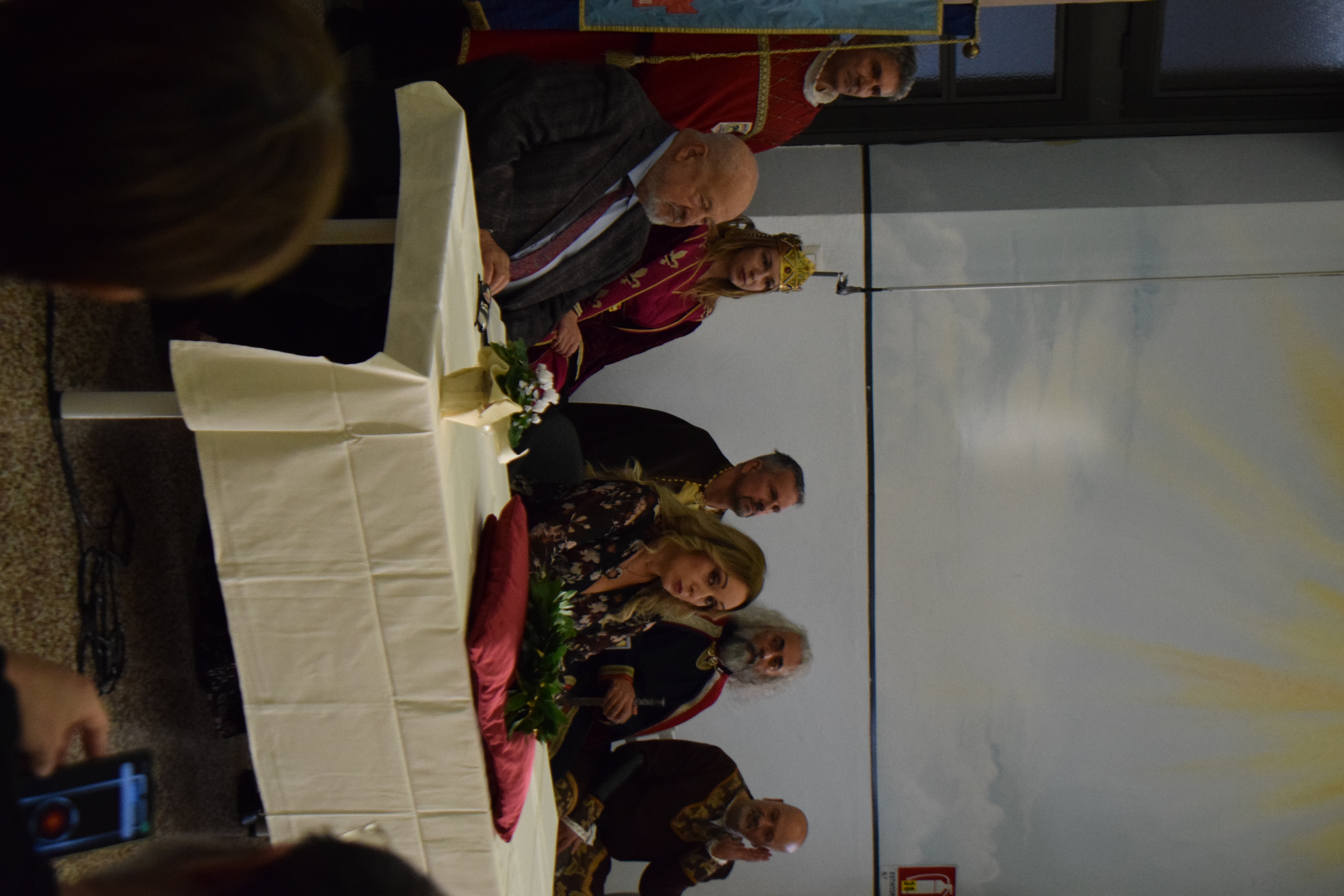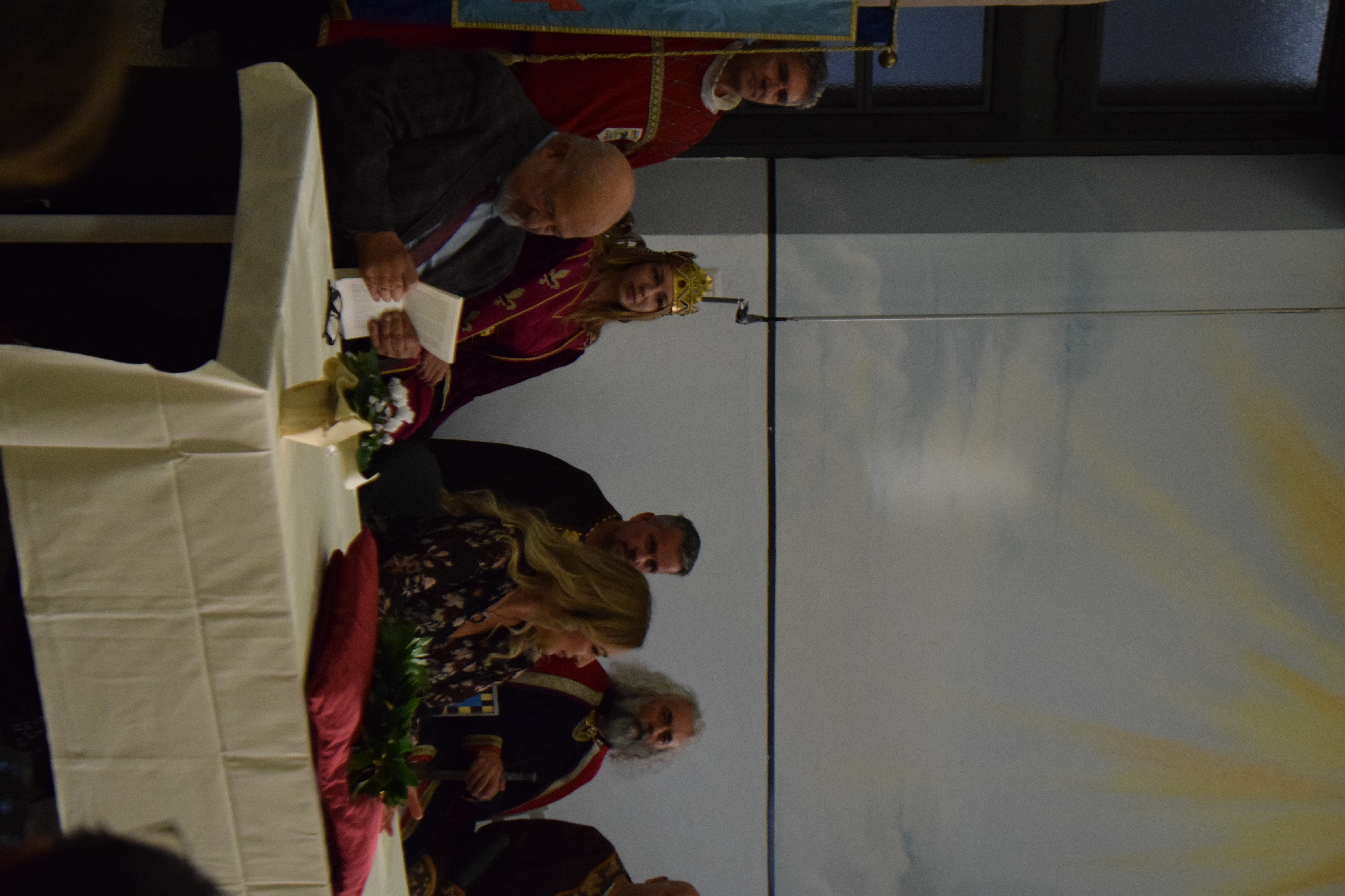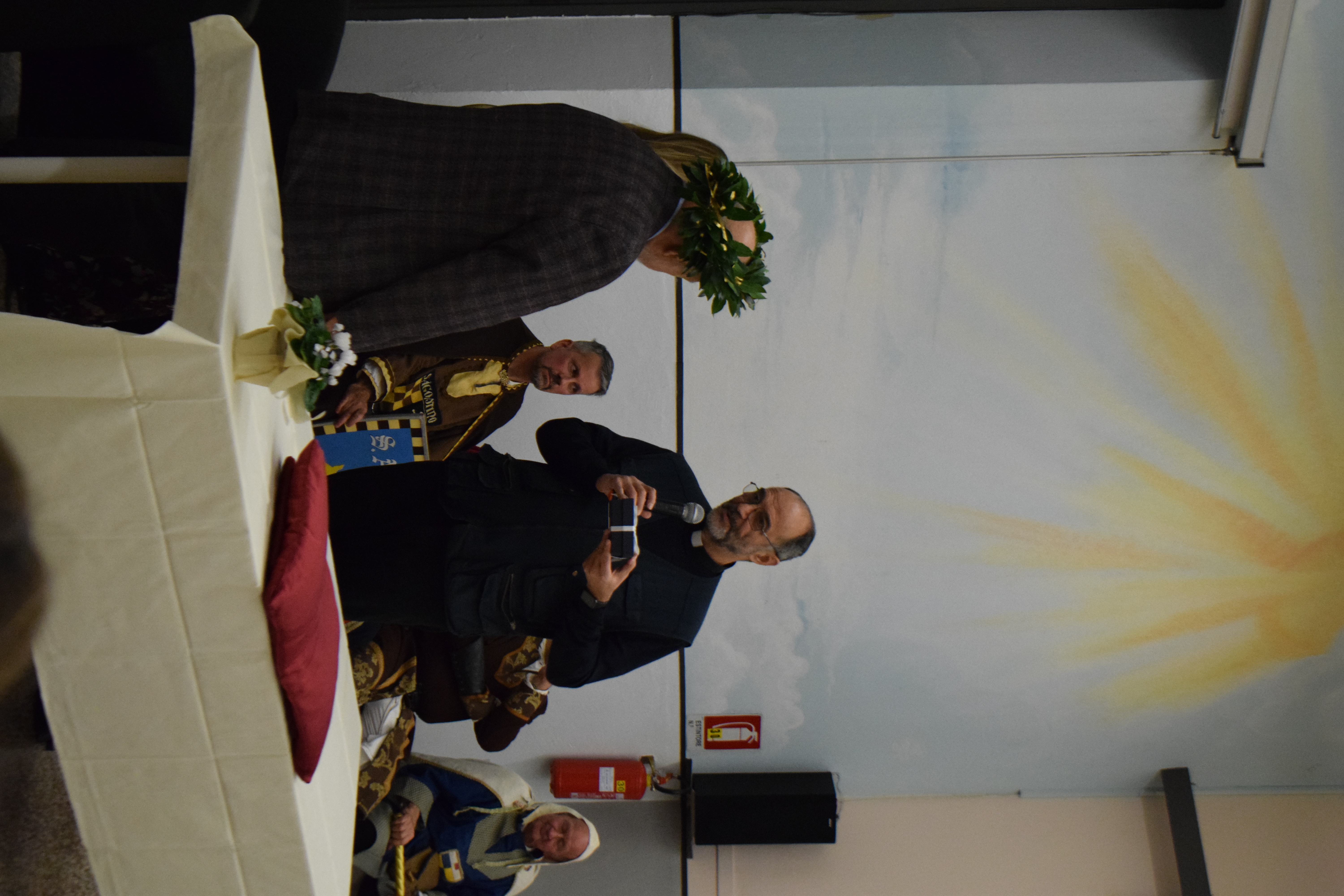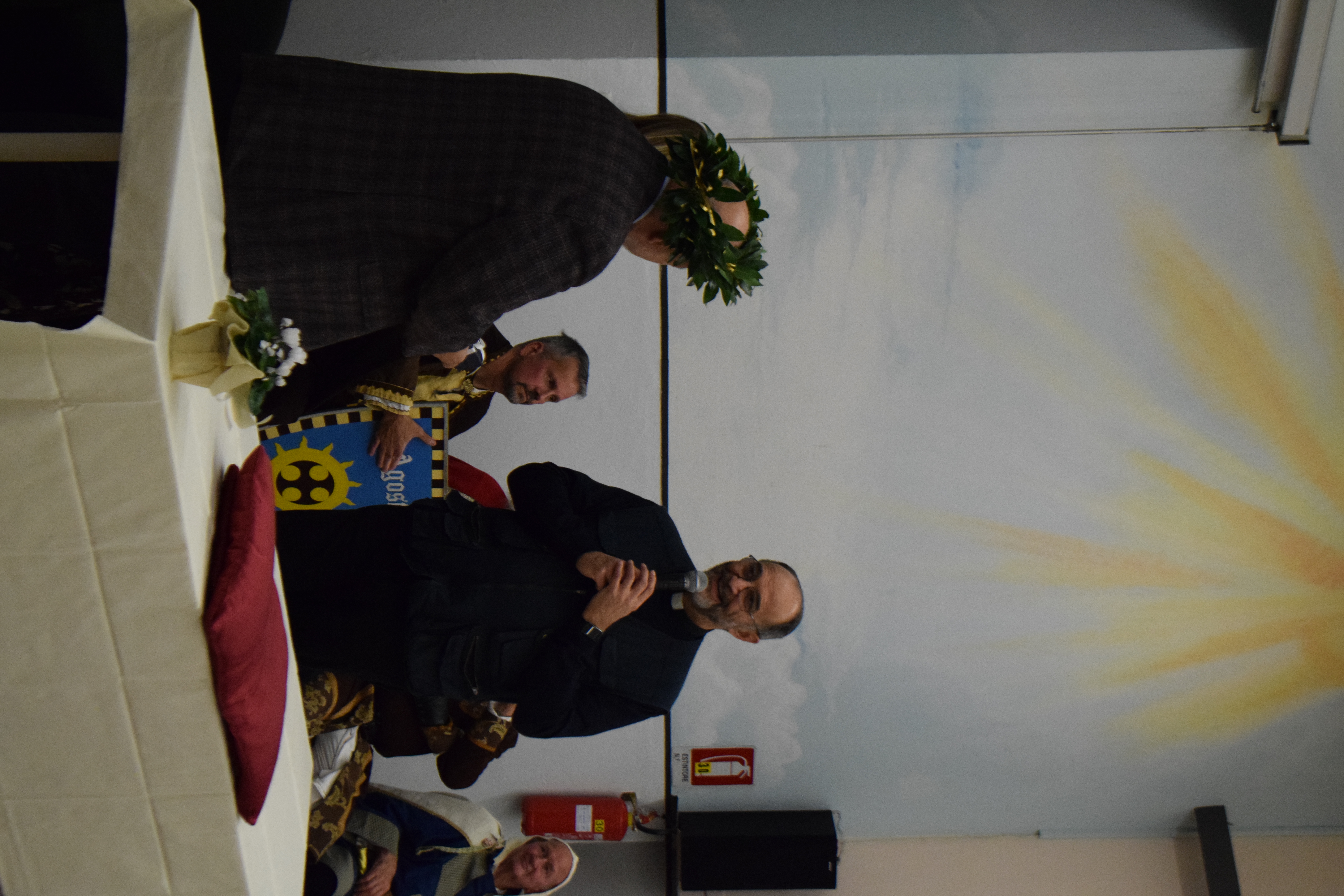 Uno dei passaggi più emozionanti dell’incontro è stato l’atto solenne con cui Federico Barbarossa ha “incoronato” Franco Cardini con una corona d’alloro, gesto carico di significato.