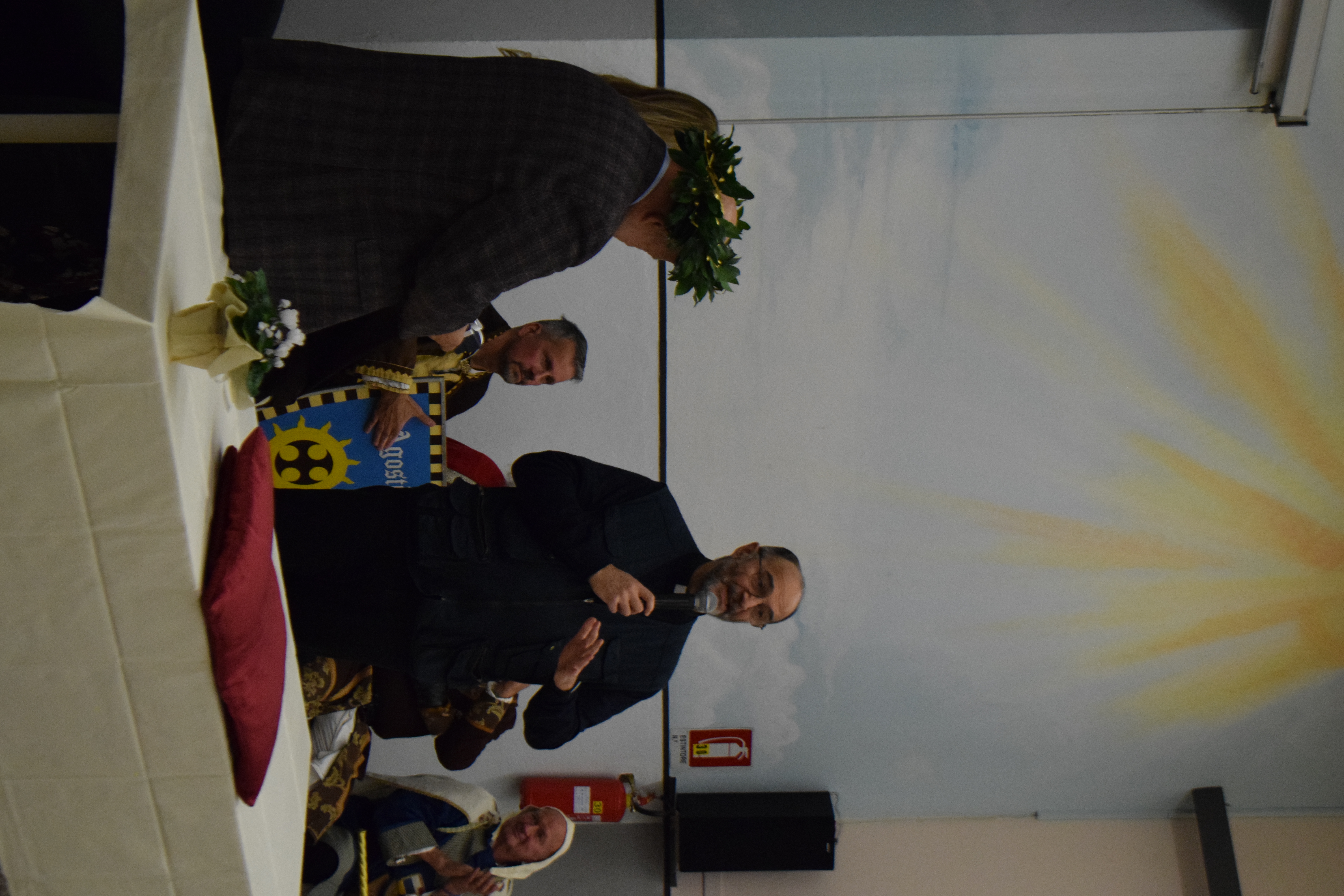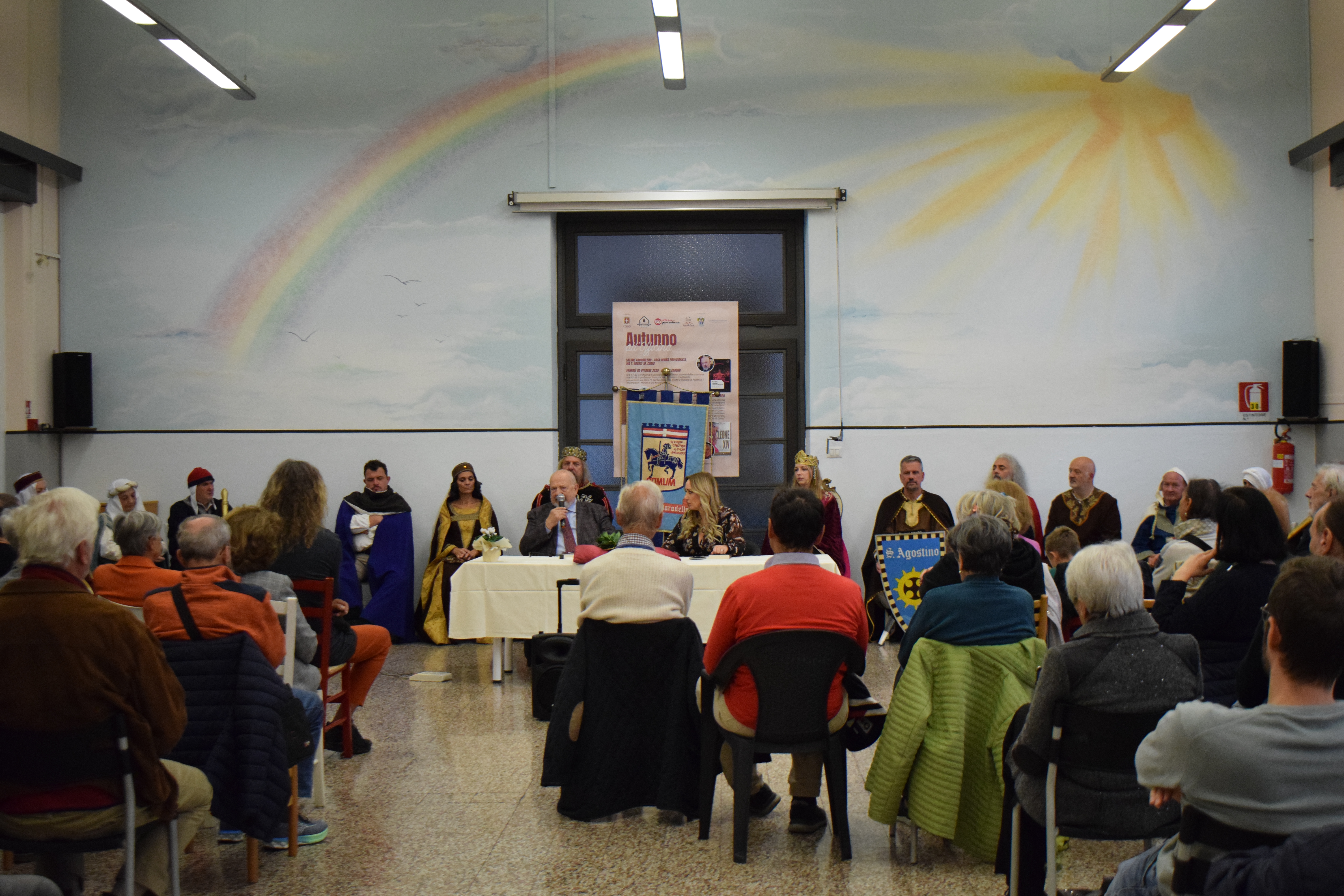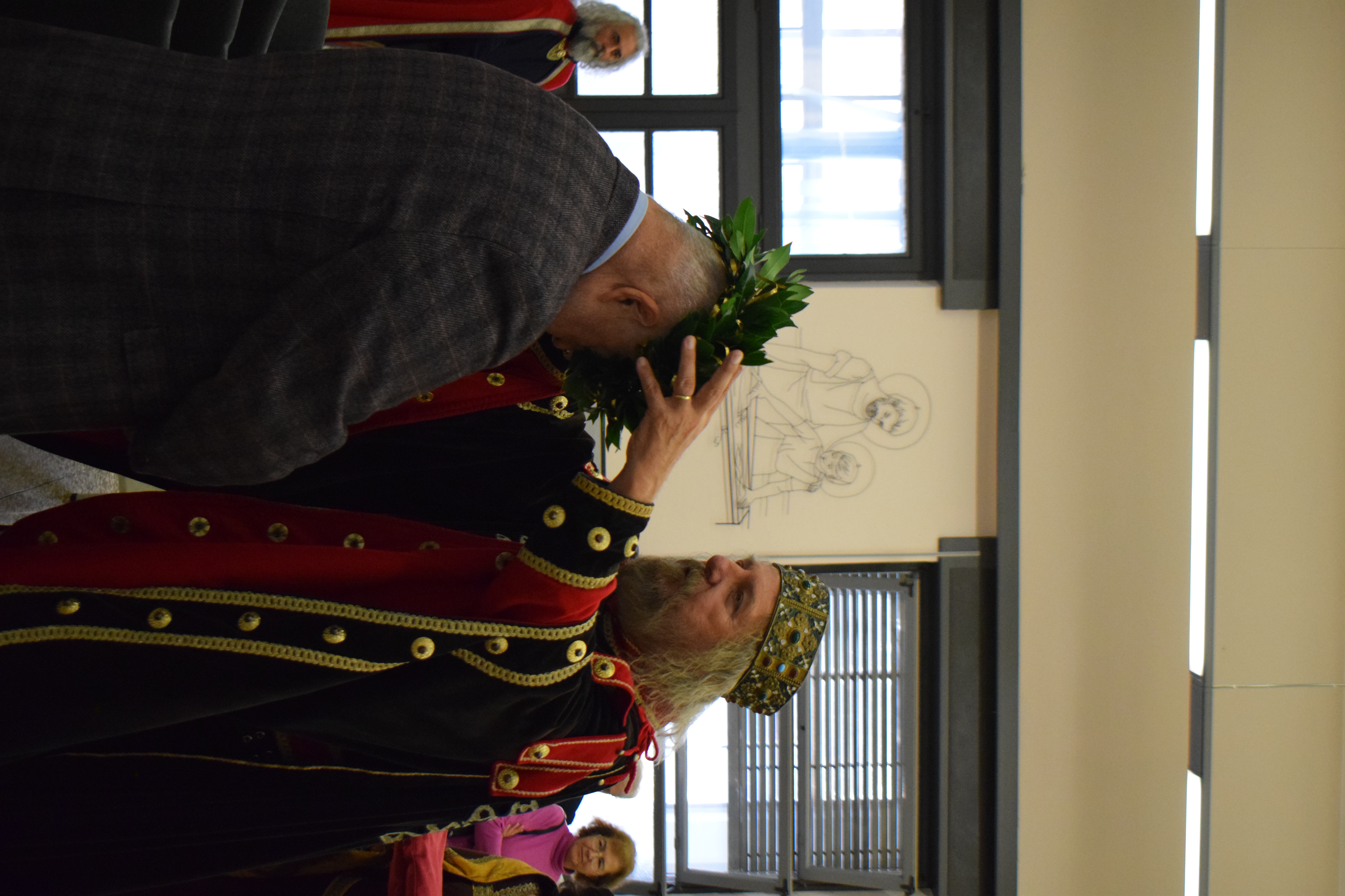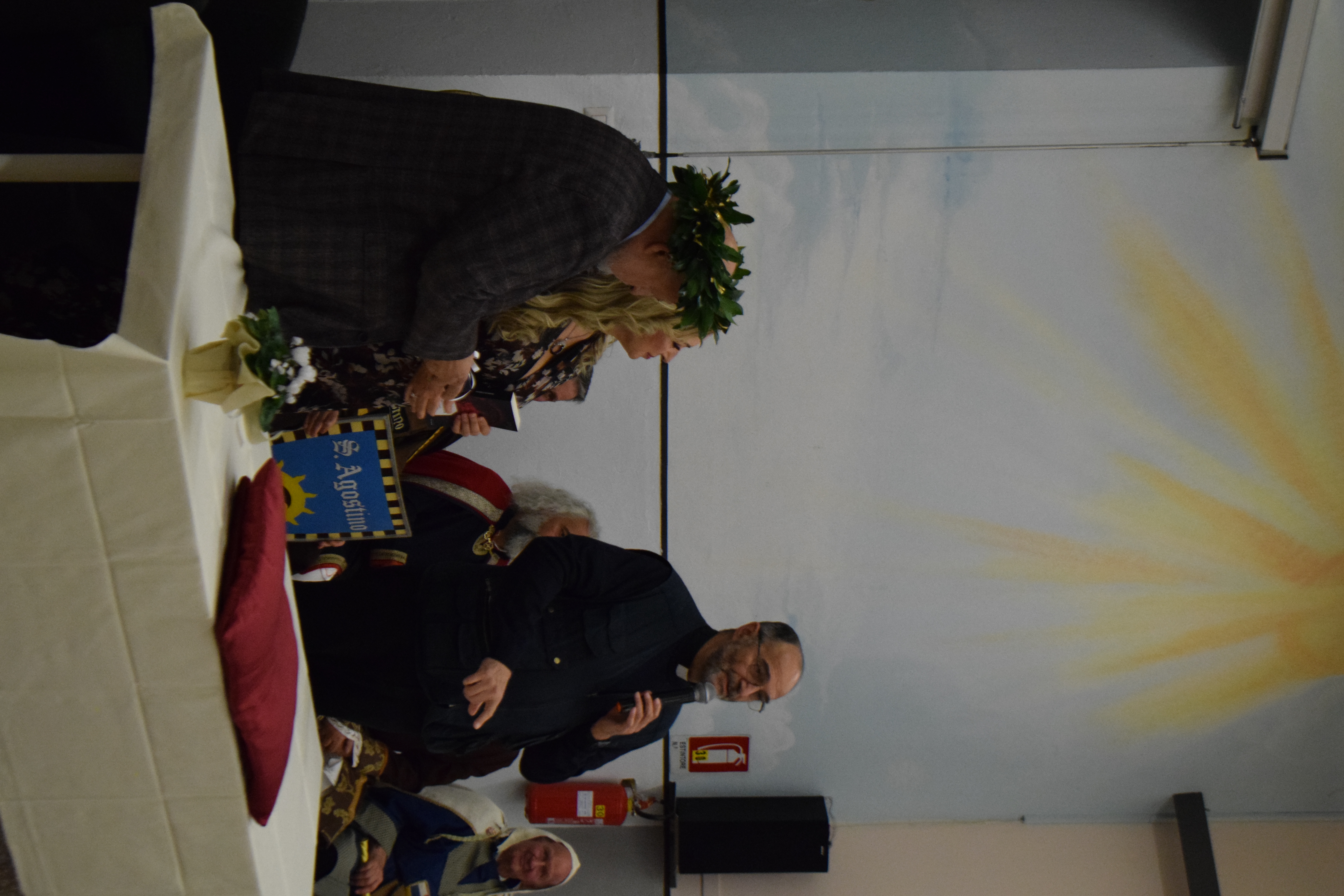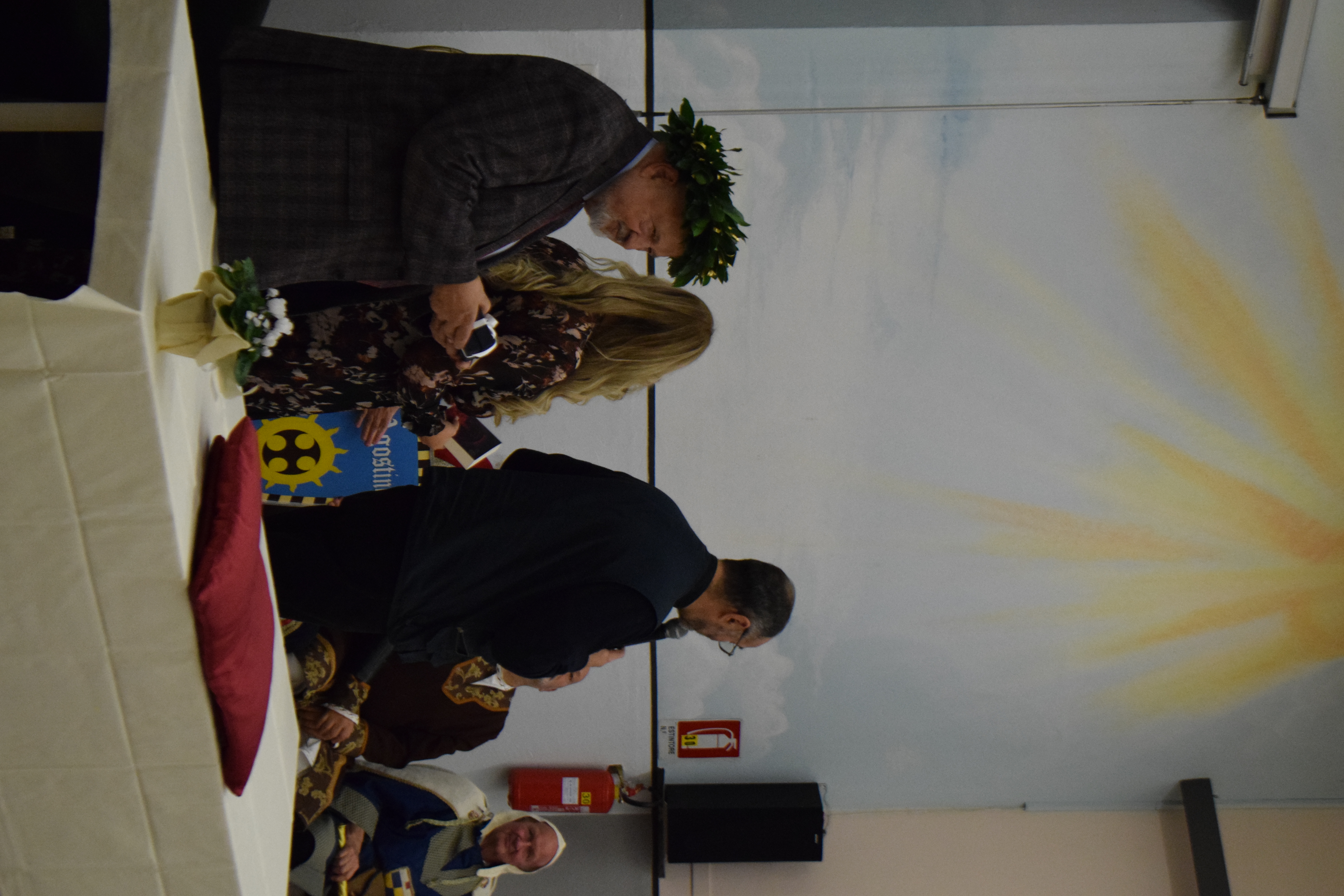 Uno dei passaggi più emozionanti dell’incontro è stato l’atto solenne con cui Federico Barbarossa ha “incoronato” Franco Cardini con una corona d’alloro, gesto carico di significato.