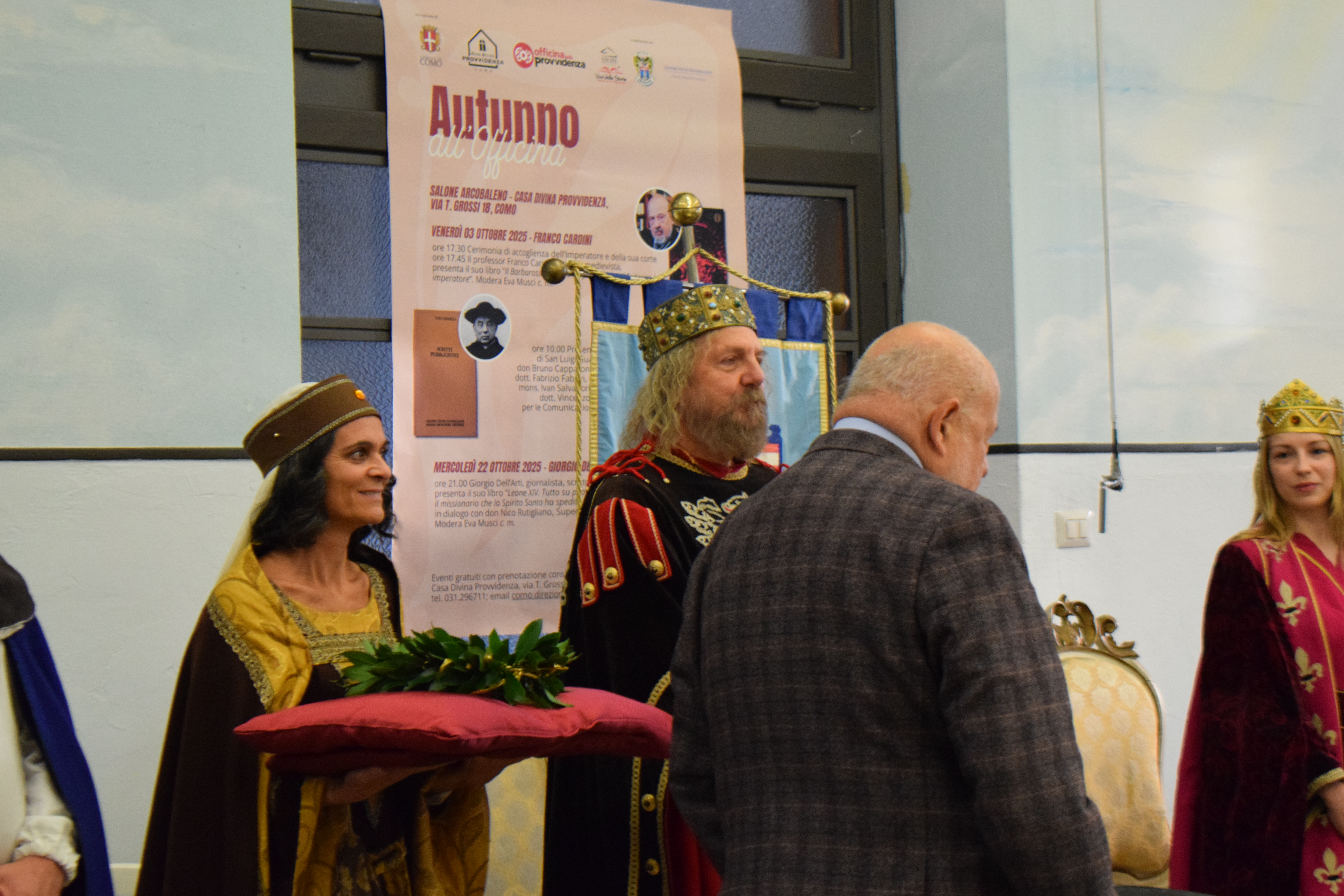 Presso la Fondazione della Casa della Divina Provvidenza di Como, un gruppo di figuranti in abiti storici ha accompagnato l’imperatore Federico I Barbarossa e l’imperatrice Beatrice di Borgogna in un incontro particolarmente significativo: la visita al professor Franco Cardini, uno dei più autorevoli storici italiani del Medioevo e studioso di fama internazionale.