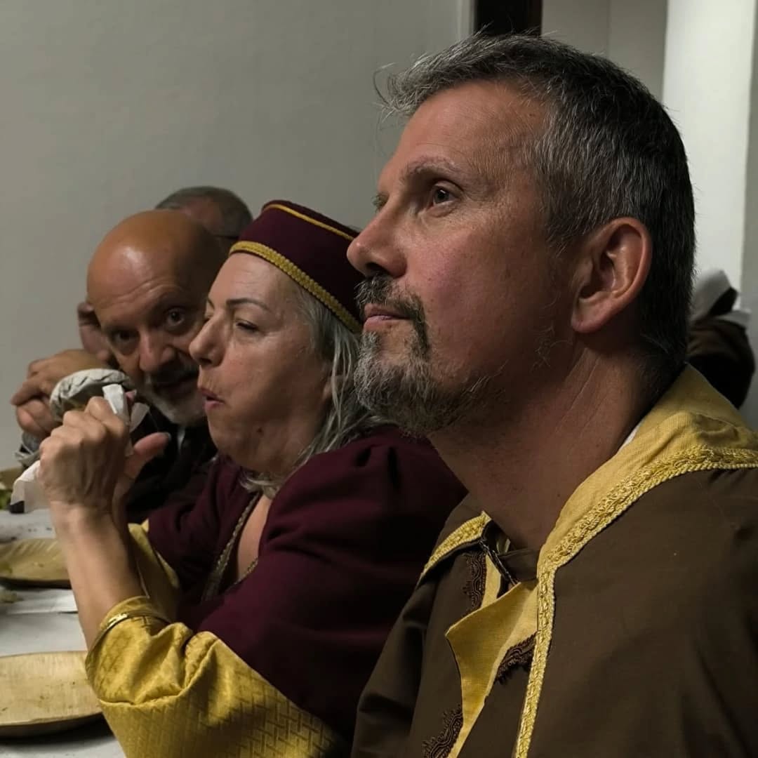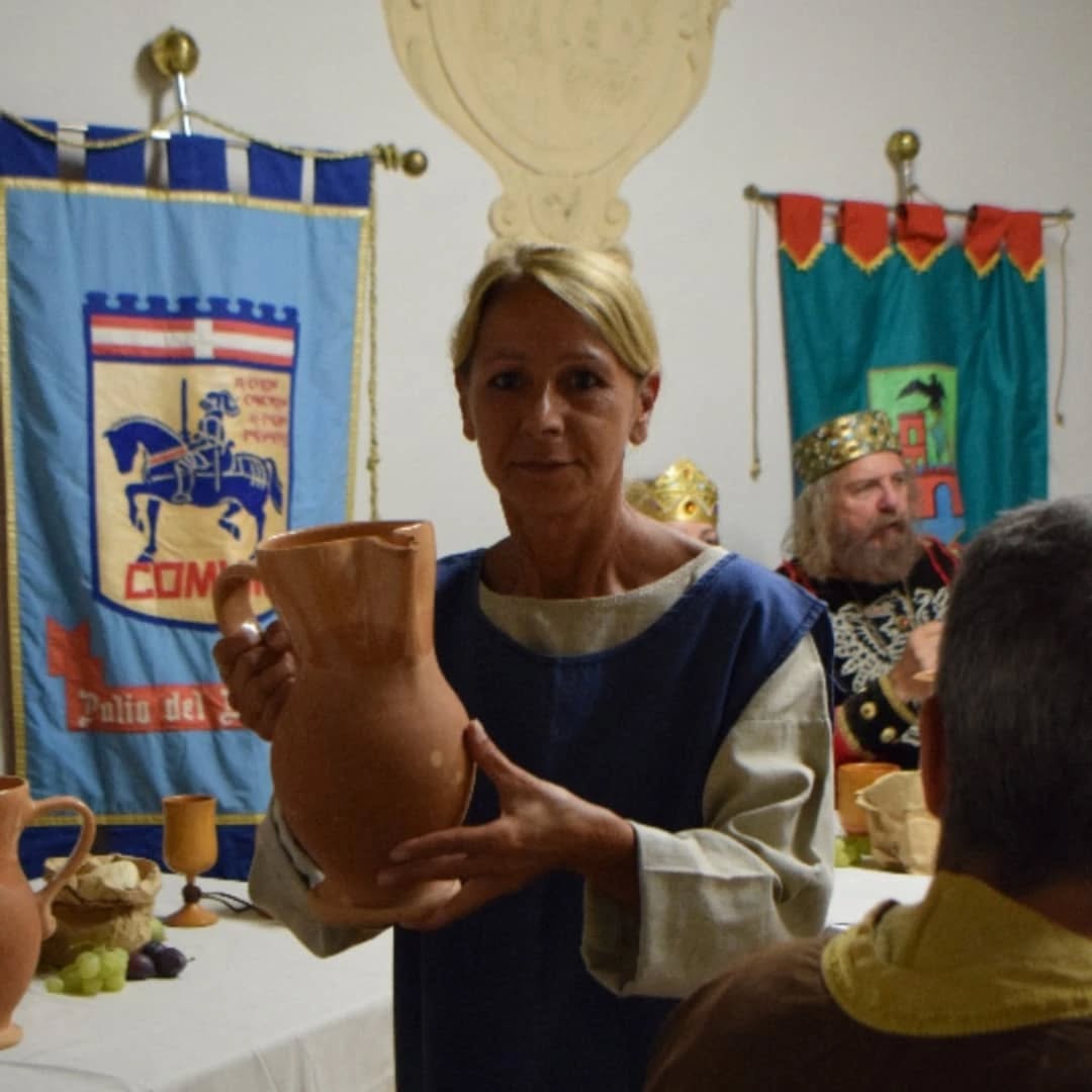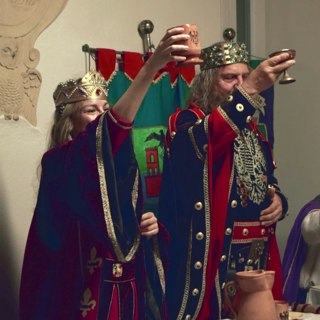 Durante la serata, l’imperatore Federico I Barbarossa e l’imperatrice Beatrice di Borgogna brindano augurando buona fortuna per l’inizio del Palio. A tavola vi attende un autentico viaggio nel gusto dell’epoca: