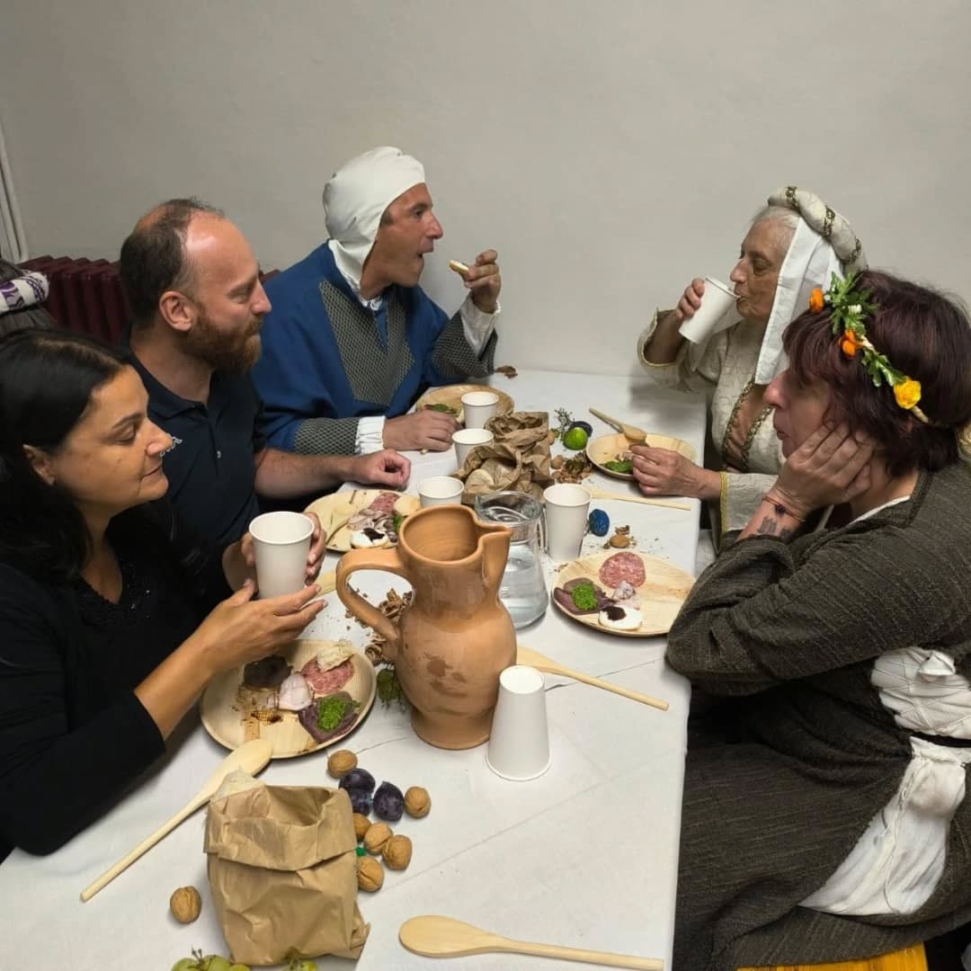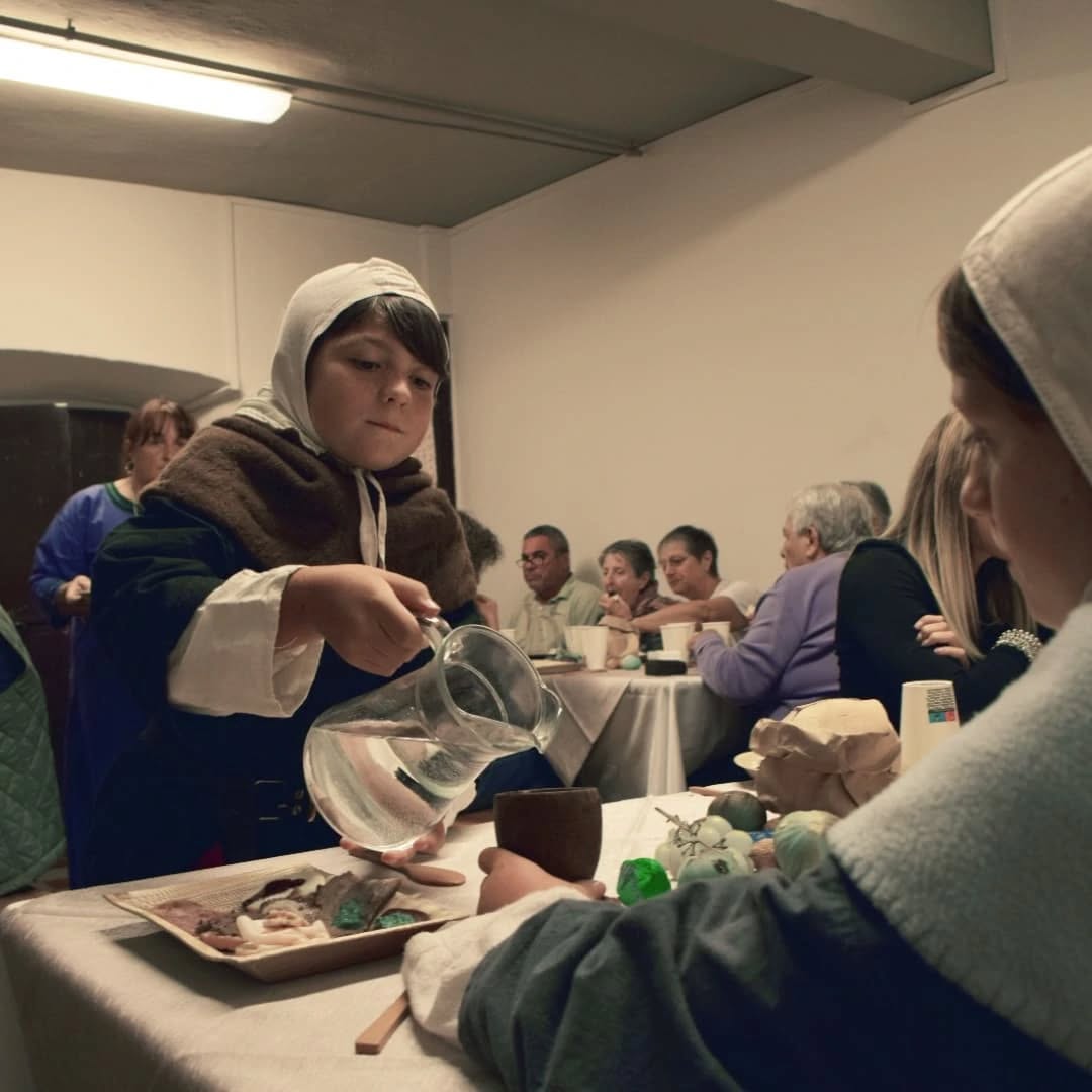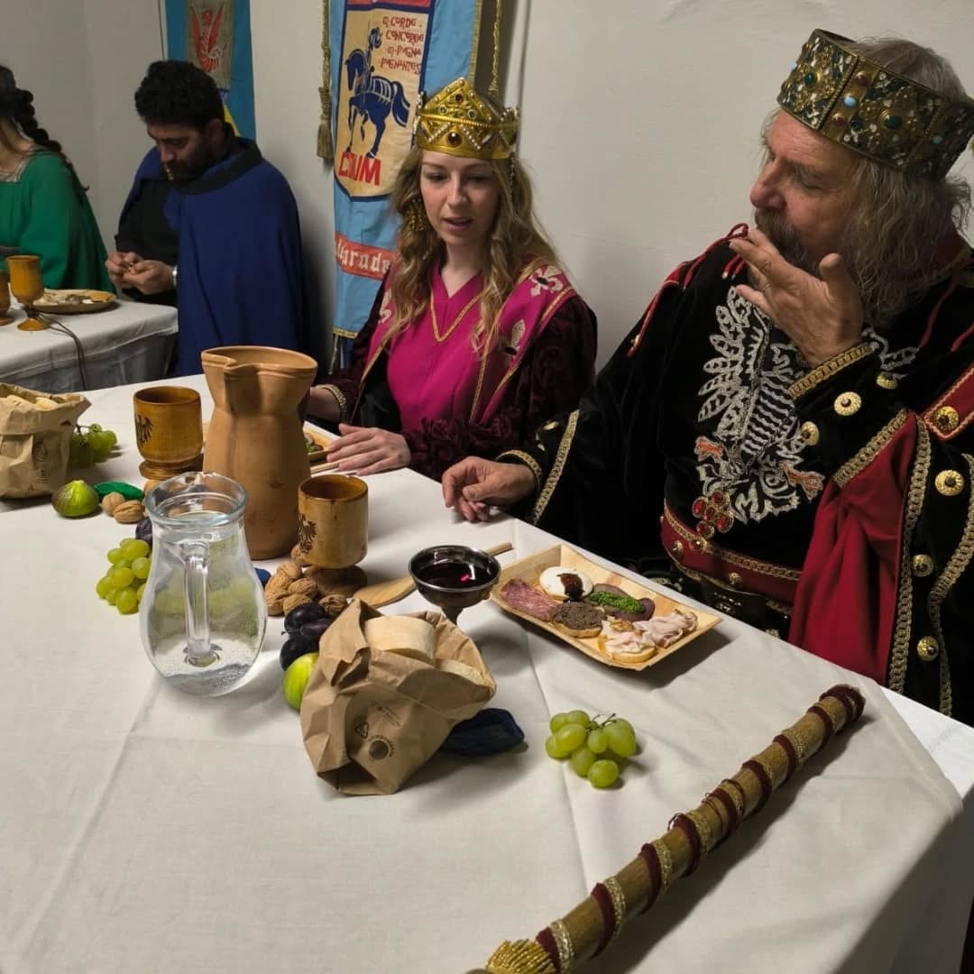 Durante la serata, l’imperatore Federico I Barbarossa e l’imperatrice Beatrice di Borgogna brindano augurando buona fortuna per l’inizio del Palio. A tavola vi attende un autentico viaggio nel gusto dell’epoca: