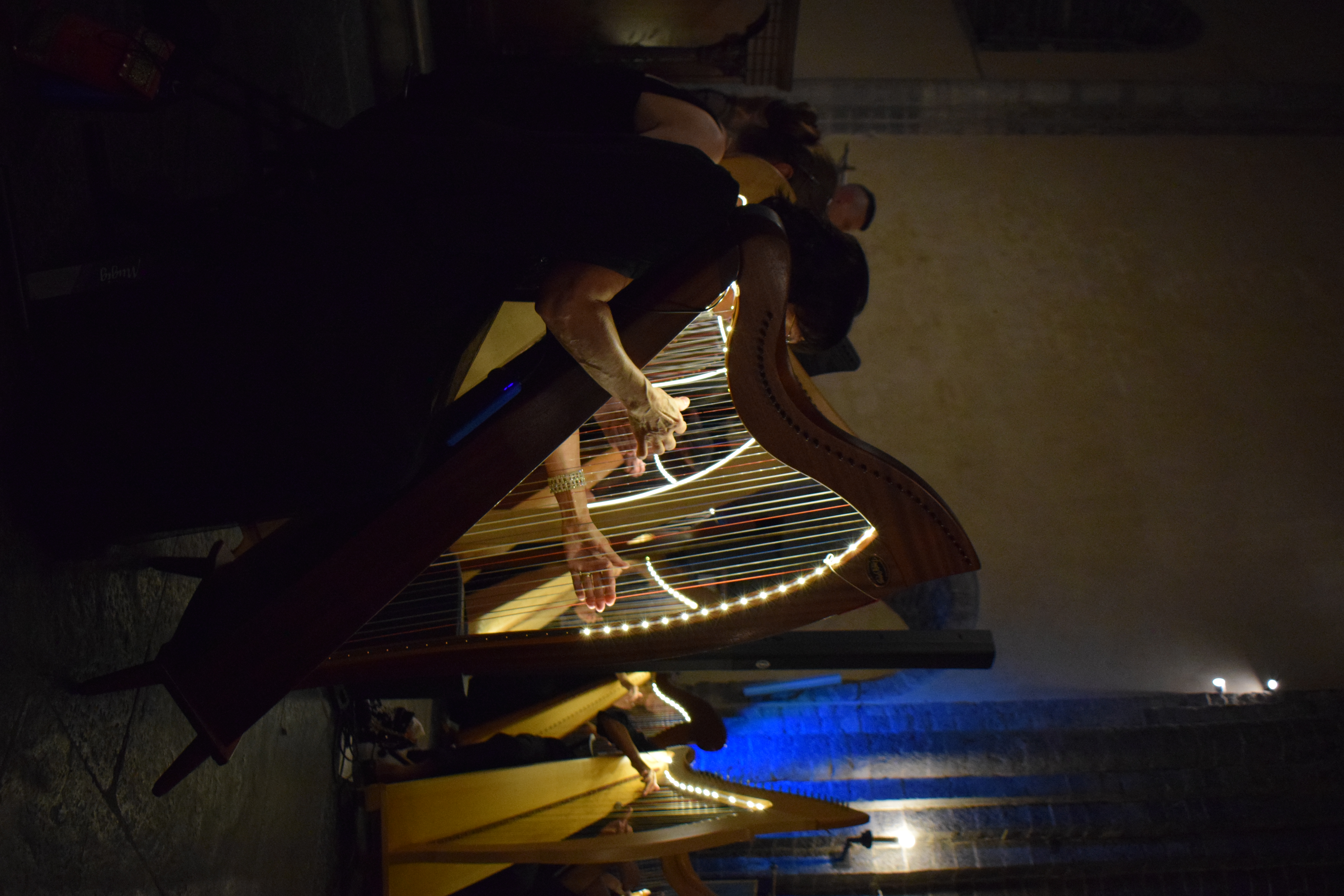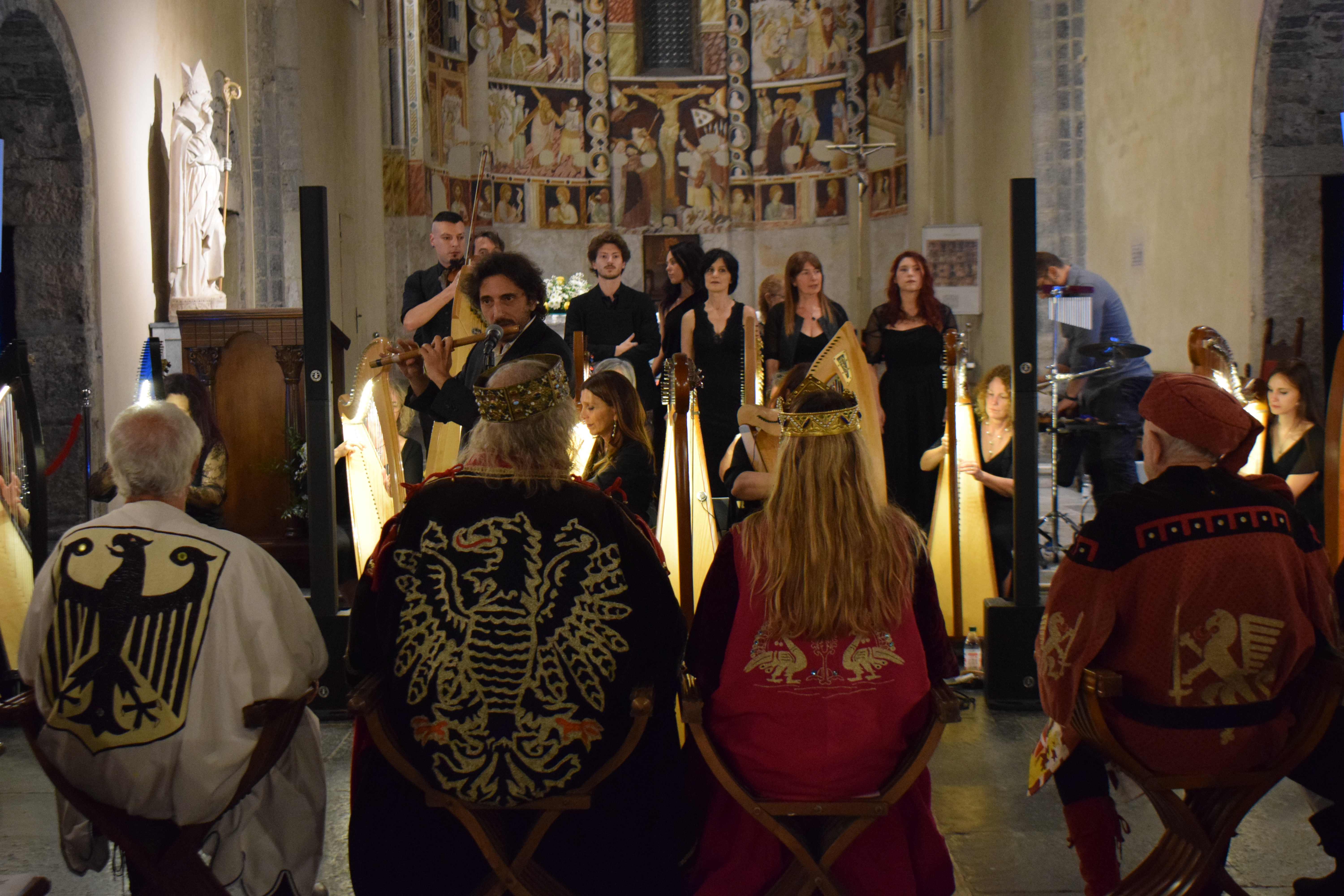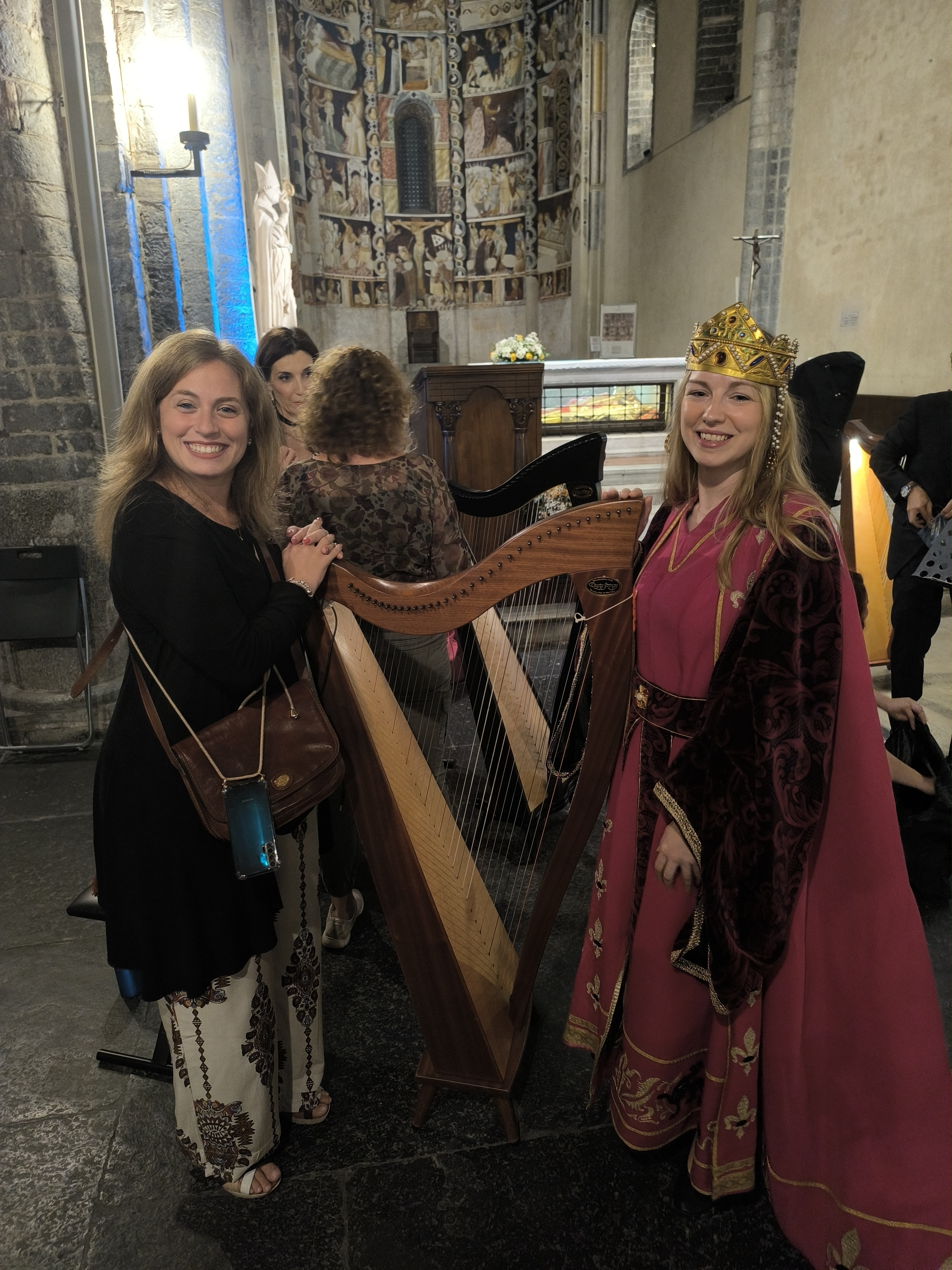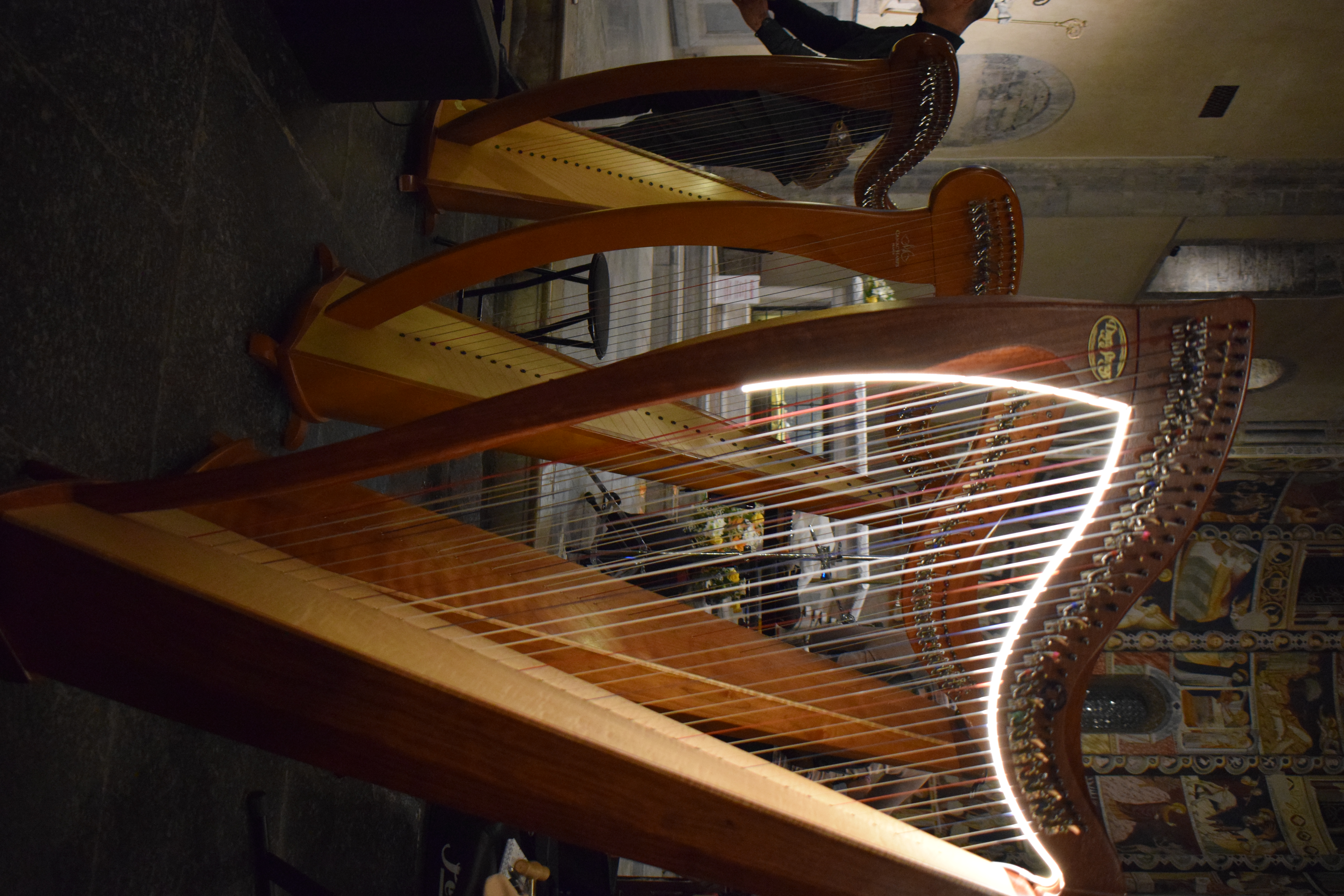 decoravano le arpe dei musicisti. Ogni riflesso, ogni vibrazione delle corde sembrava raccontare storie antiche, mentre i brani eseguiti evocavano melodie medievali e canti che riportavano alla memoria atmosfere di castelli e corti.