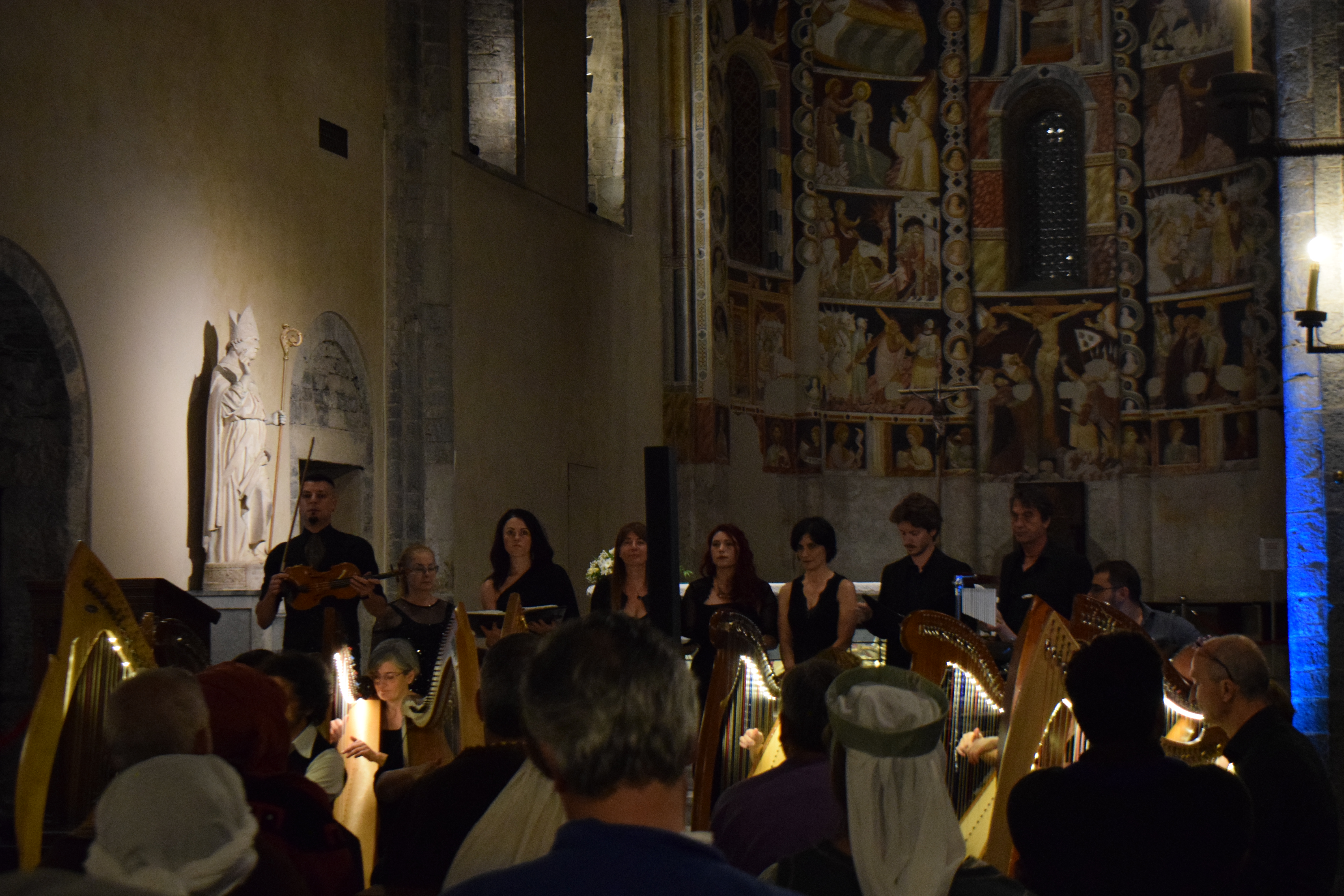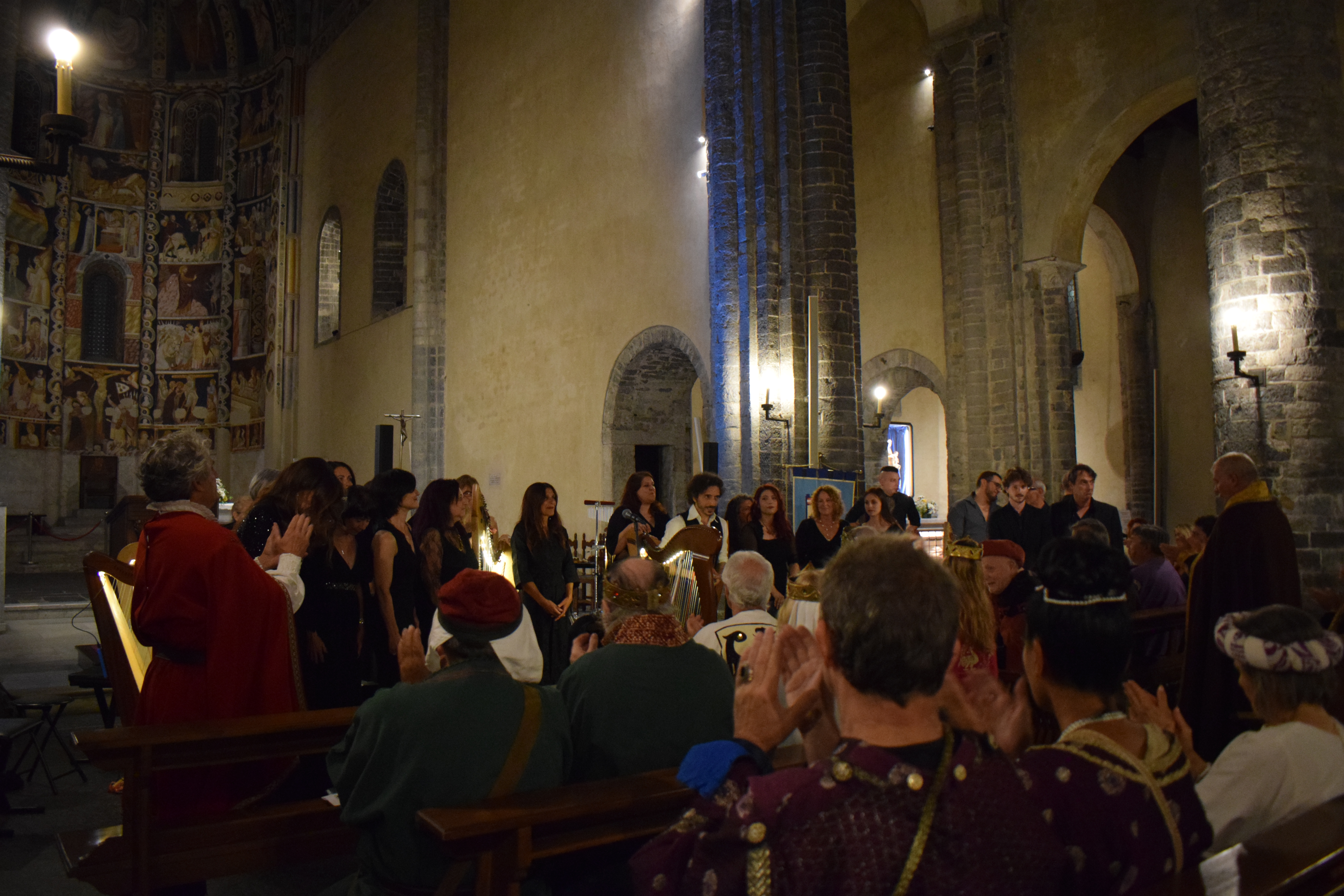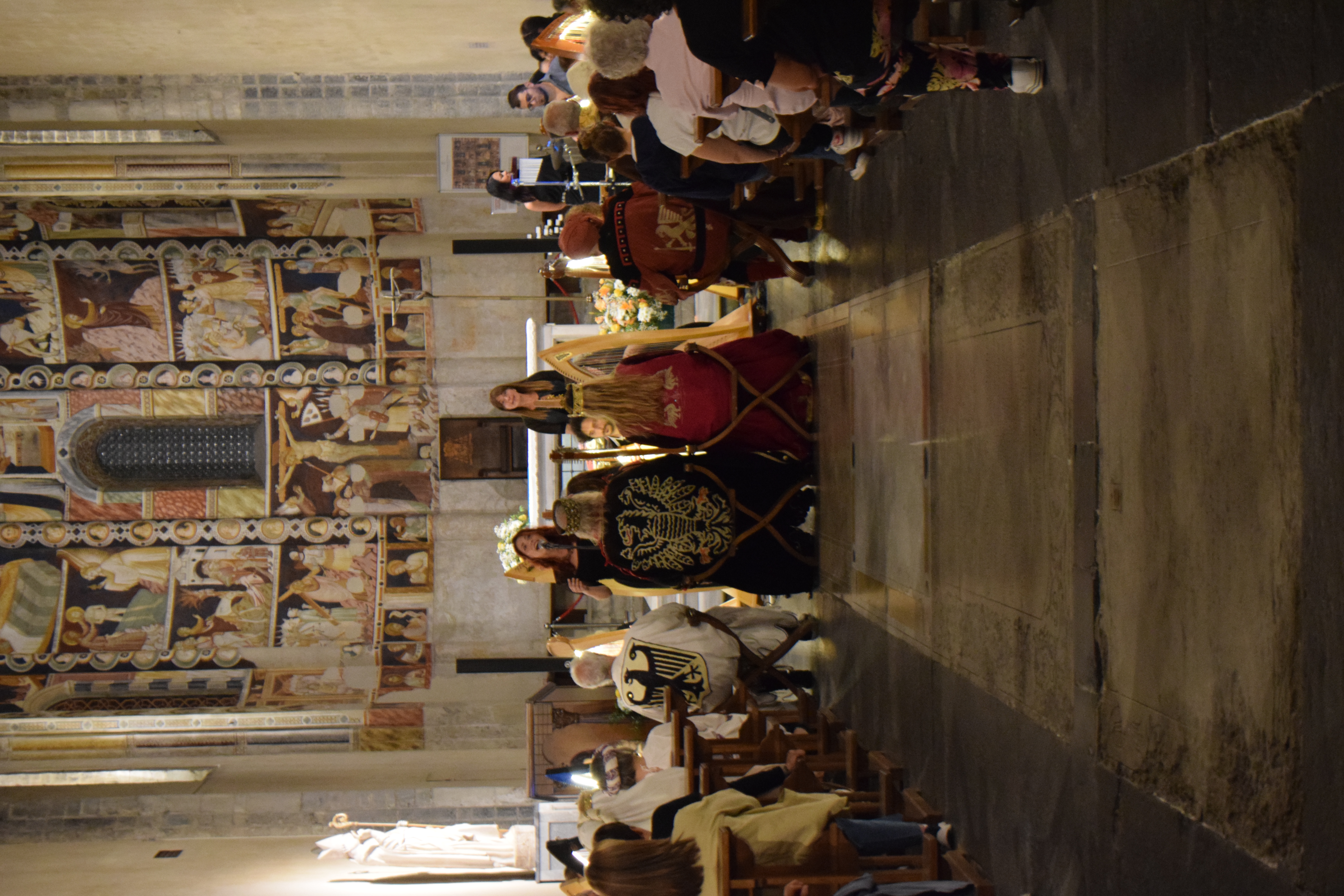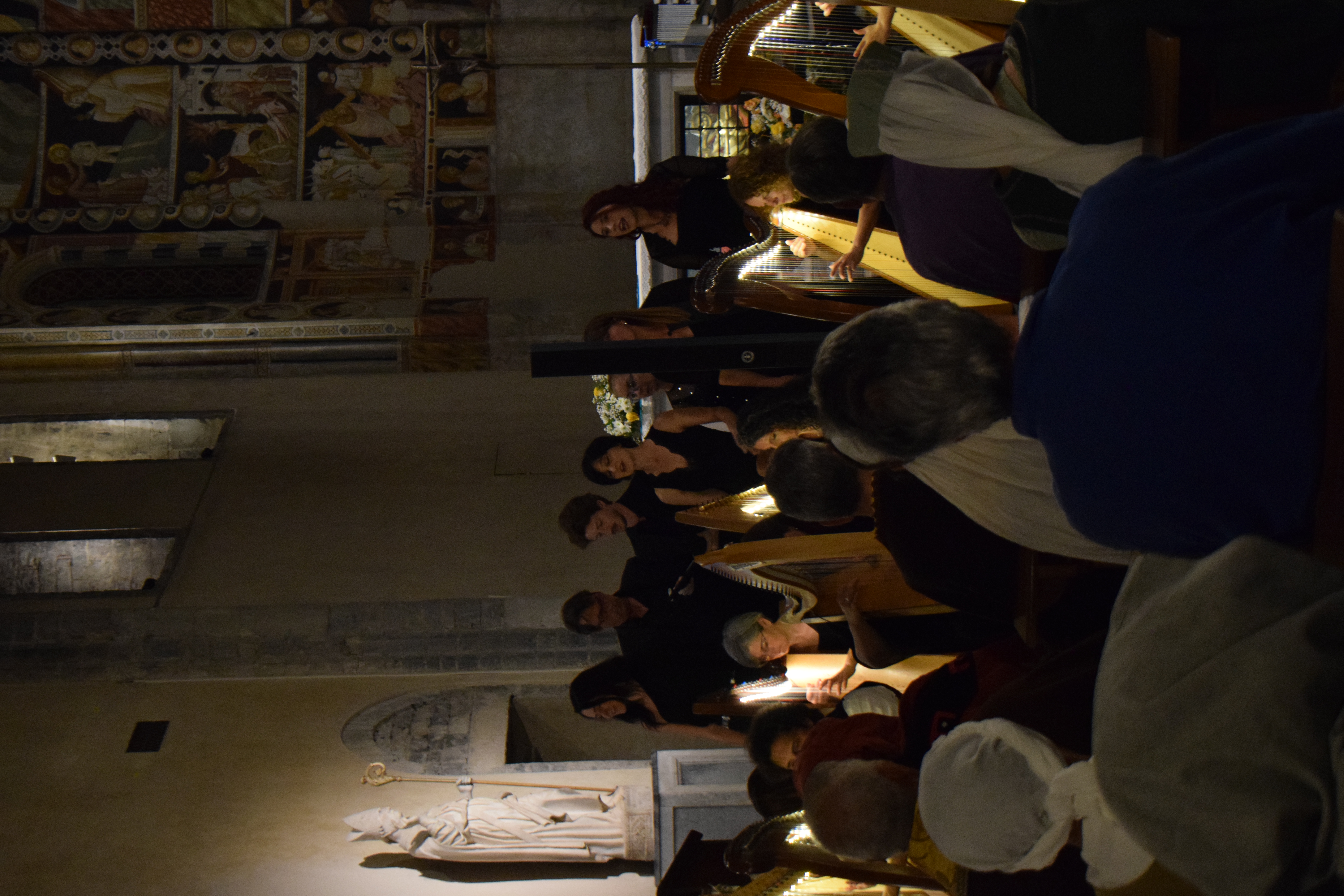 decoravano le arpe dei musicisti. Ogni riflesso, ogni vibrazione delle corde sembrava raccontare storie antiche, mentre i brani eseguiti evocavano melodie medievali e canti che riportavano alla memoria atmosfere di castelli e corti.