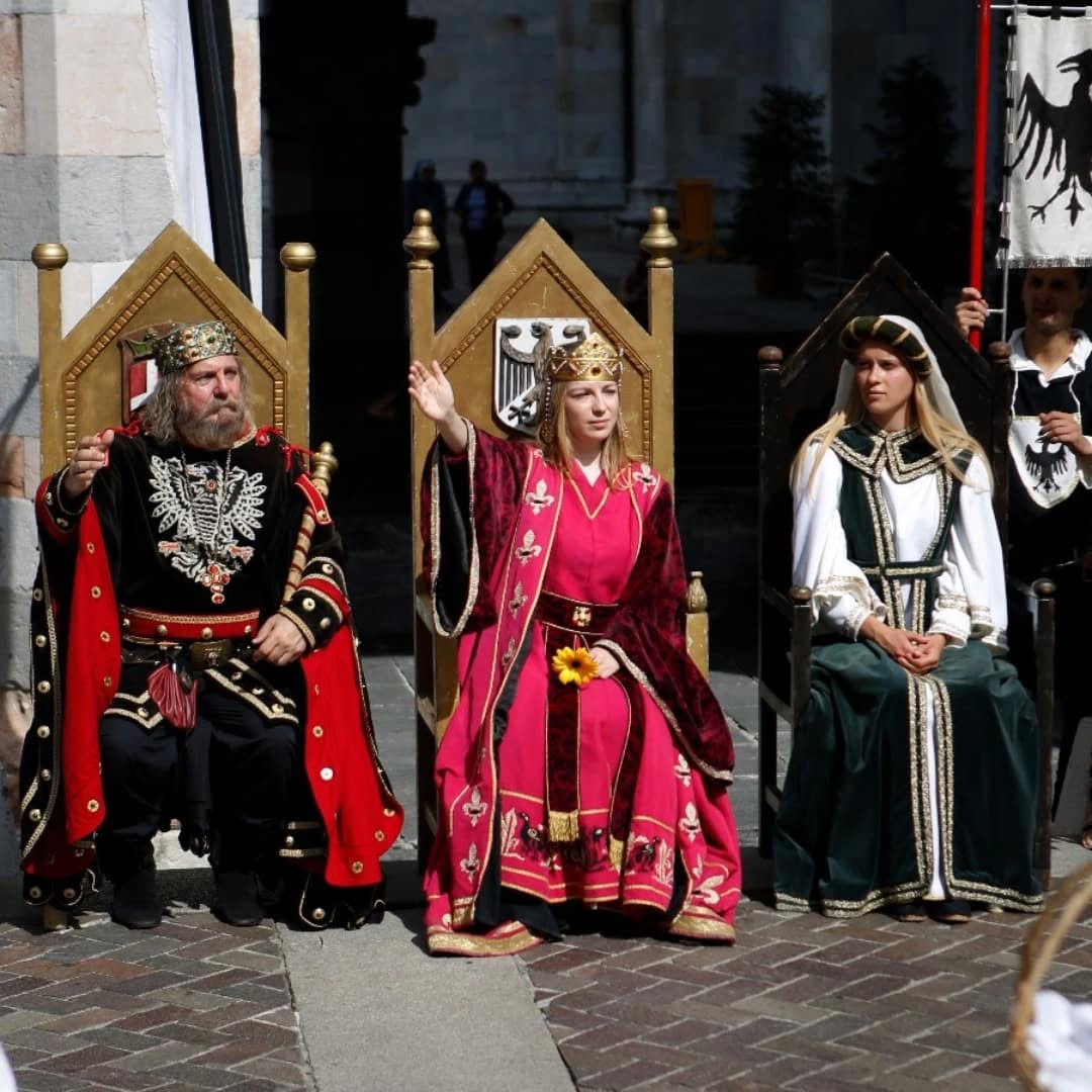 Il corteo ha visto sfilare l’imperatore Federico I Barbarossa, l’imperatrice Beatrice di Borgogna, il cugino Corrado di Hohenstaufen e sua moglie, accompagnati da un ricco seguito di figuranti. A dare vita al passato e ai borghi della tradizione
