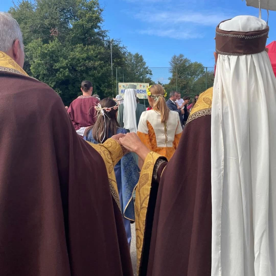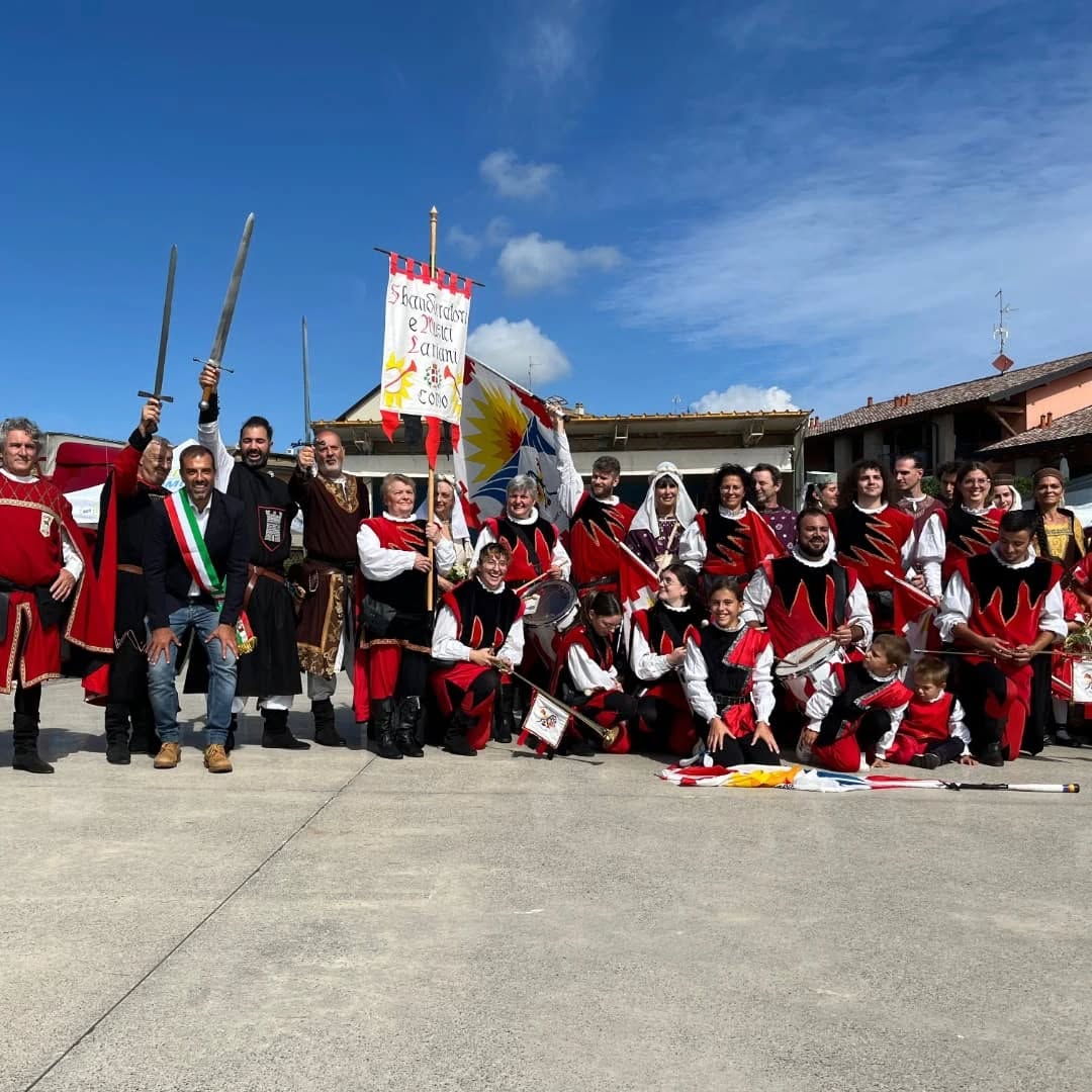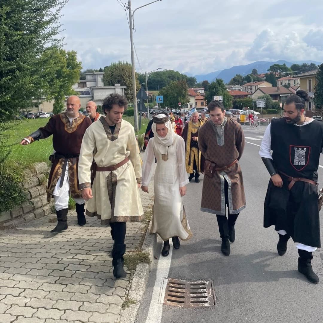 La nostra sfilata ha attraversato le vie di Montano Lucino, completamente trasformate per l’occasione in un vivace scenario agricolo: un connubio tra tradizione contadina e rievocazione medievale che ha