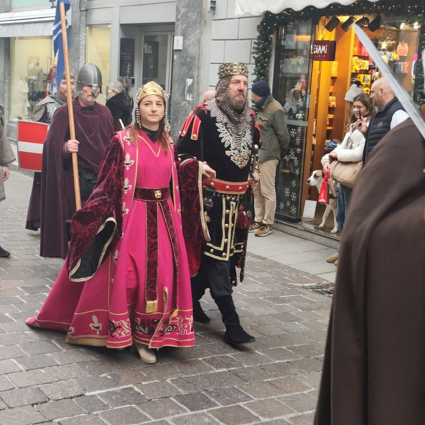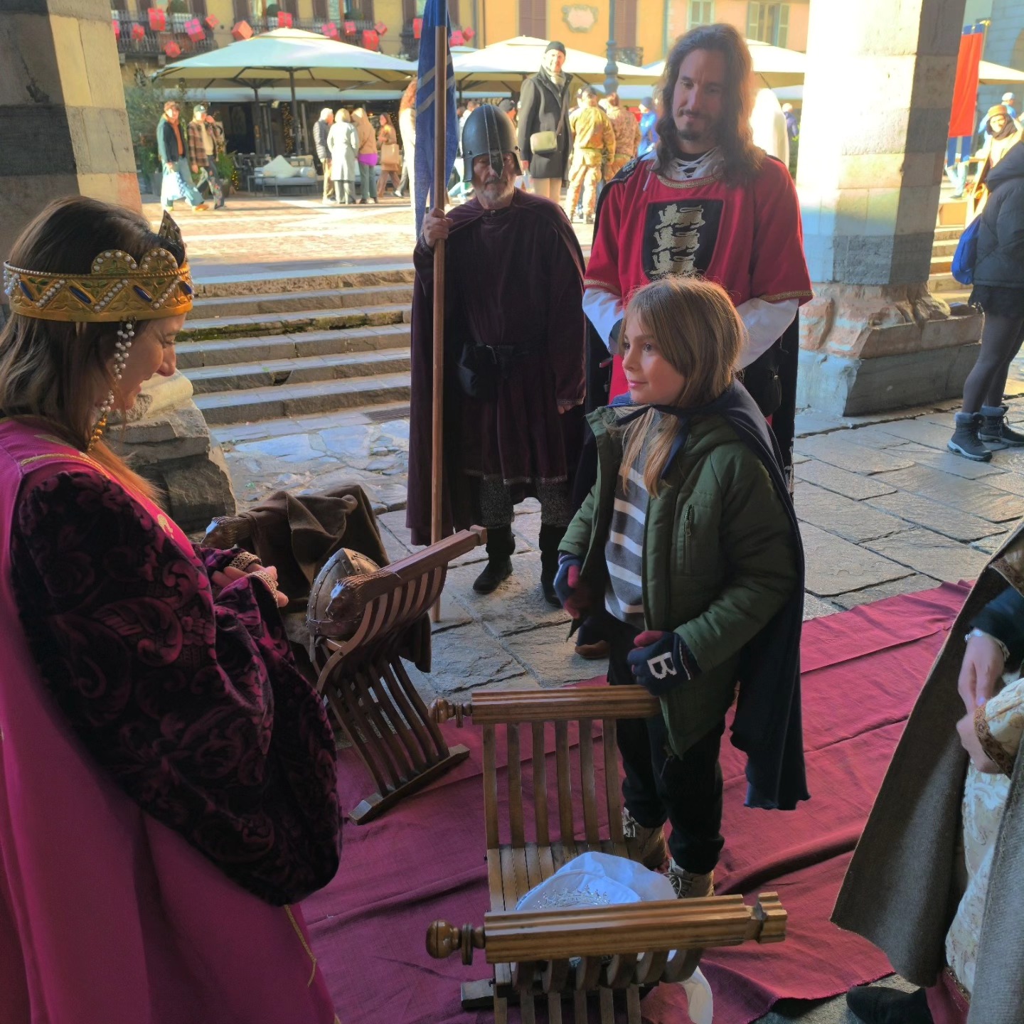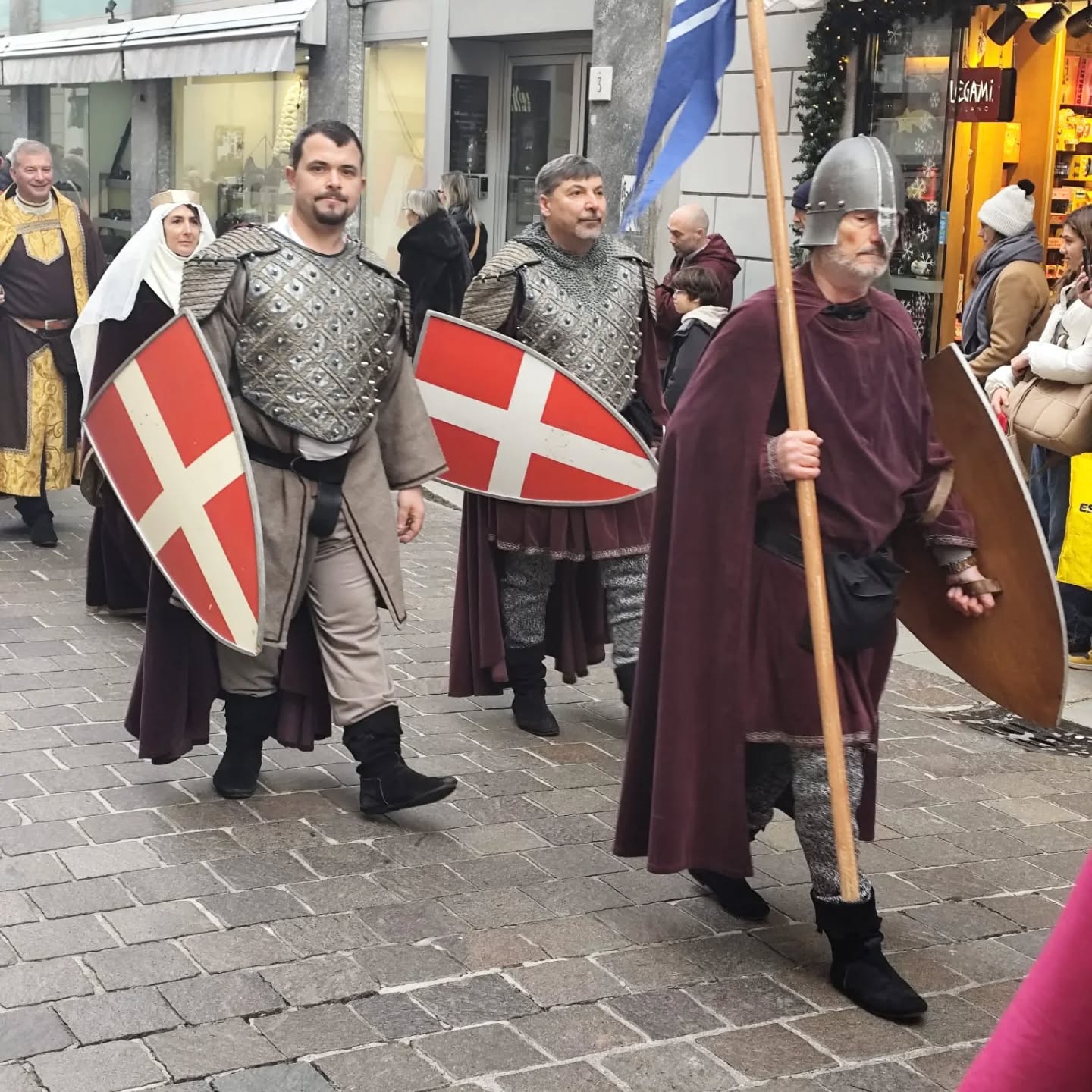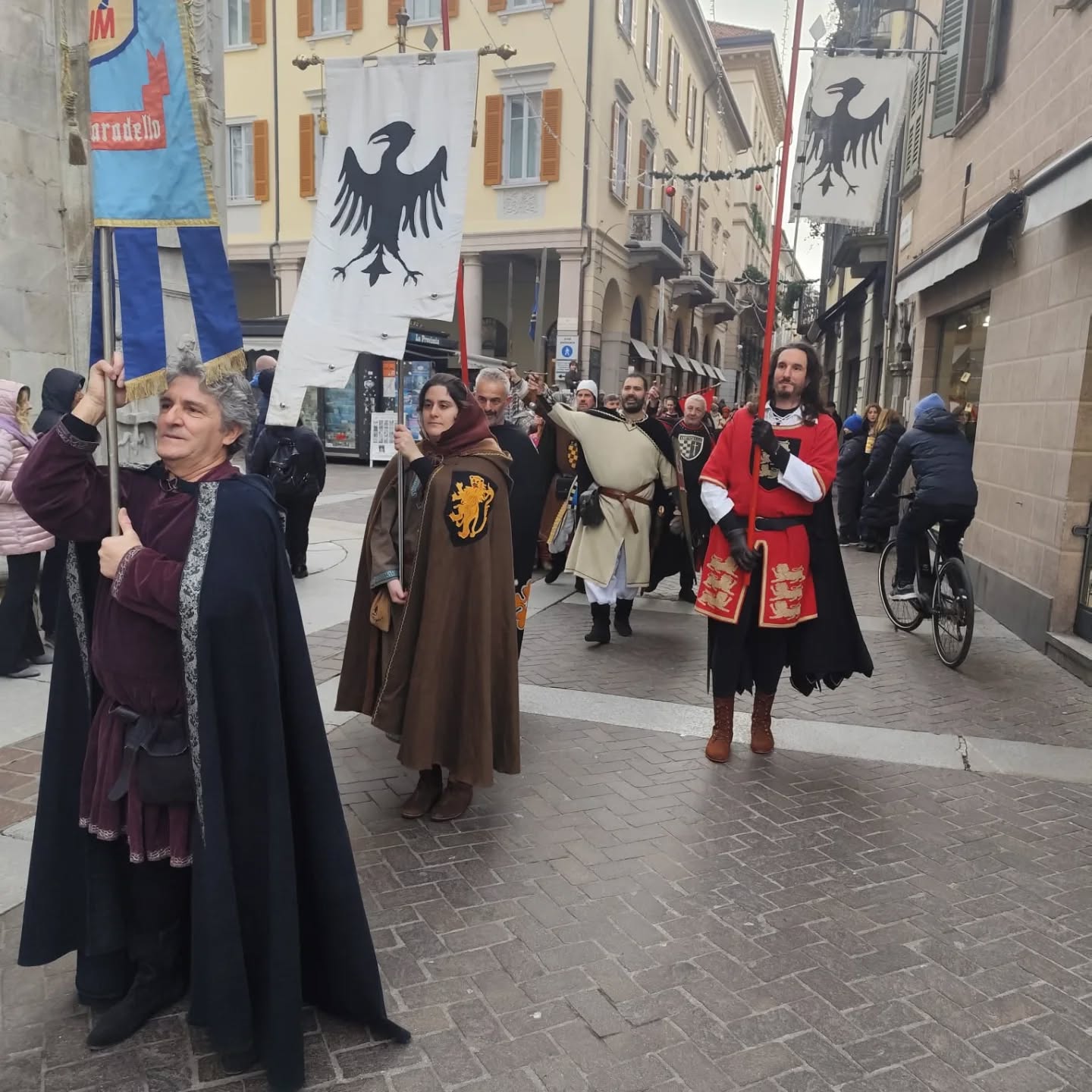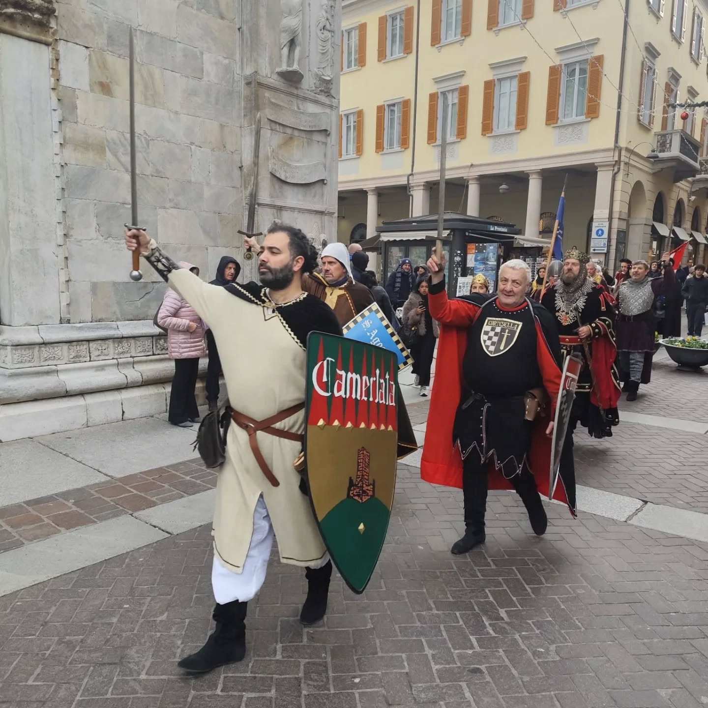 La conclusione, il 20 dicembre, ha portato per le vie di Como un emozionante corteo storico: mantelli che sfioravano le pietre antiche, vessilli mossi dal vento, figure nobili, dame, cavalieri, capitani e cortigiani hanno accompagnato Barbarossa e l’Imperatrice tra le luci natalizie, creando un’atmosfera sospesa nel tempo. In testa al corteo, Messer Raniero ha annunciato al popolo l’arrivo dell’Imperatore, aprendo la strada a un momento carico di suggestione.