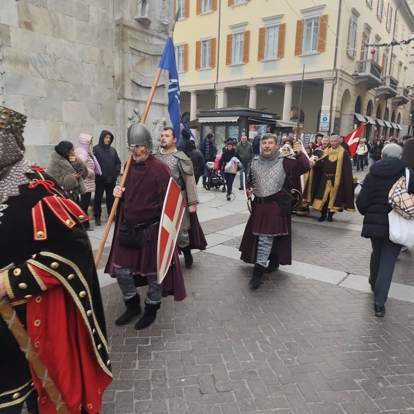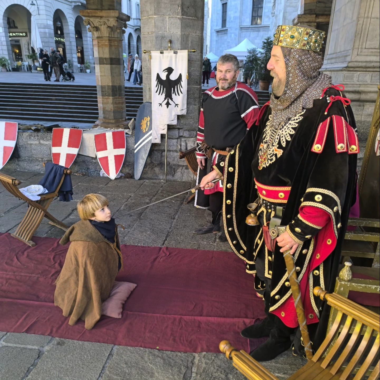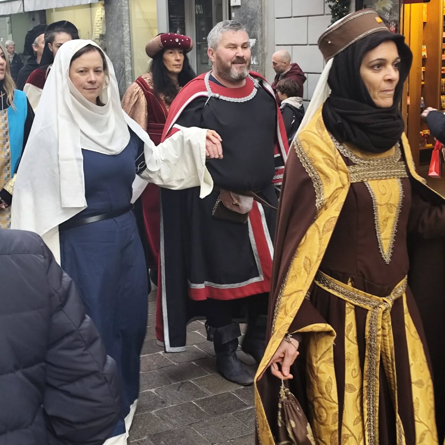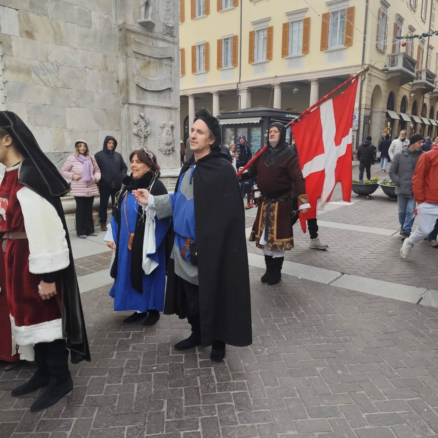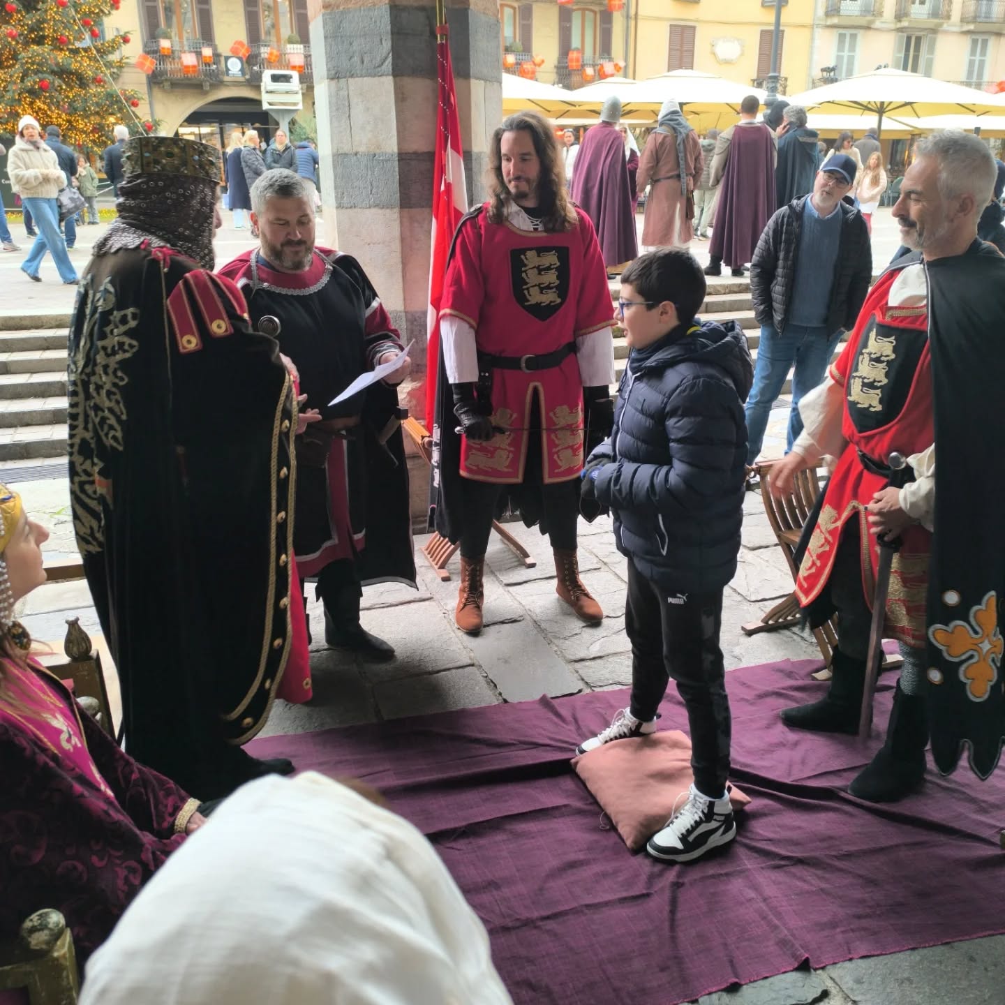 La conclusione, il 20 dicembre, ha portato per le vie di Como un emozionante corteo storico: mantelli che sfioravano le pietre antiche, vessilli mossi dal vento, figure nobili, dame, cavalieri, capitani e cortigiani hanno accompagnato Barbarossa e l’Imperatrice tra le luci natalizie, creando un’atmosfera sospesa nel tempo. In testa al corteo, Messer Raniero ha annunciato al popolo l’arrivo dell’Imperatore, aprendo la strada a un momento carico di suggestione.
