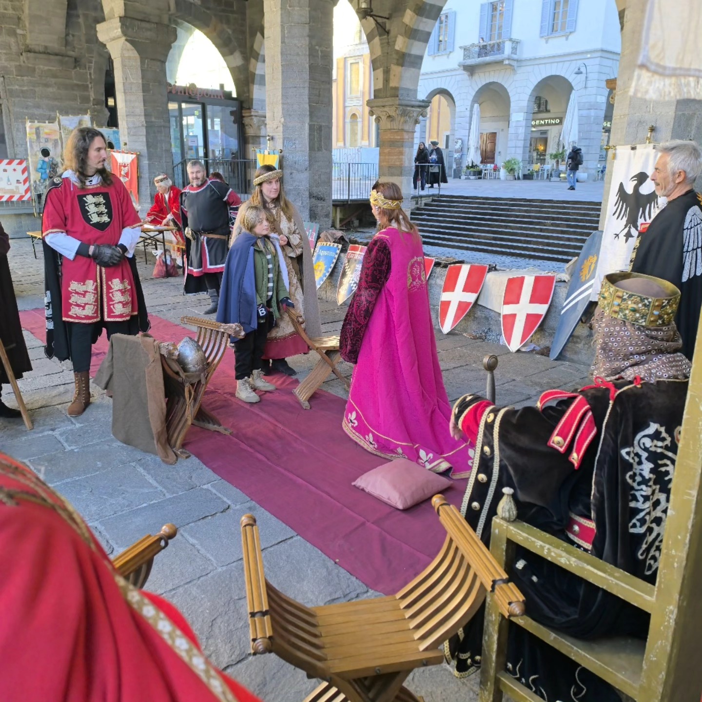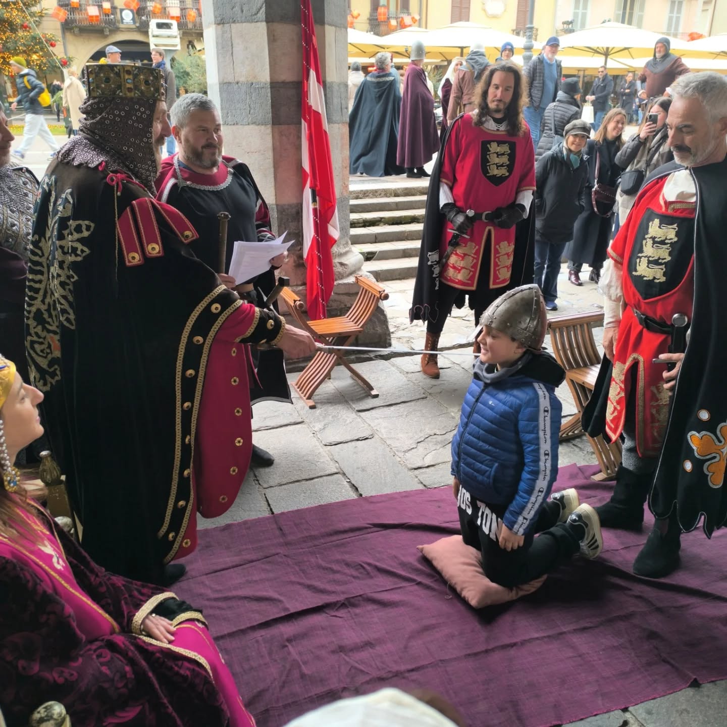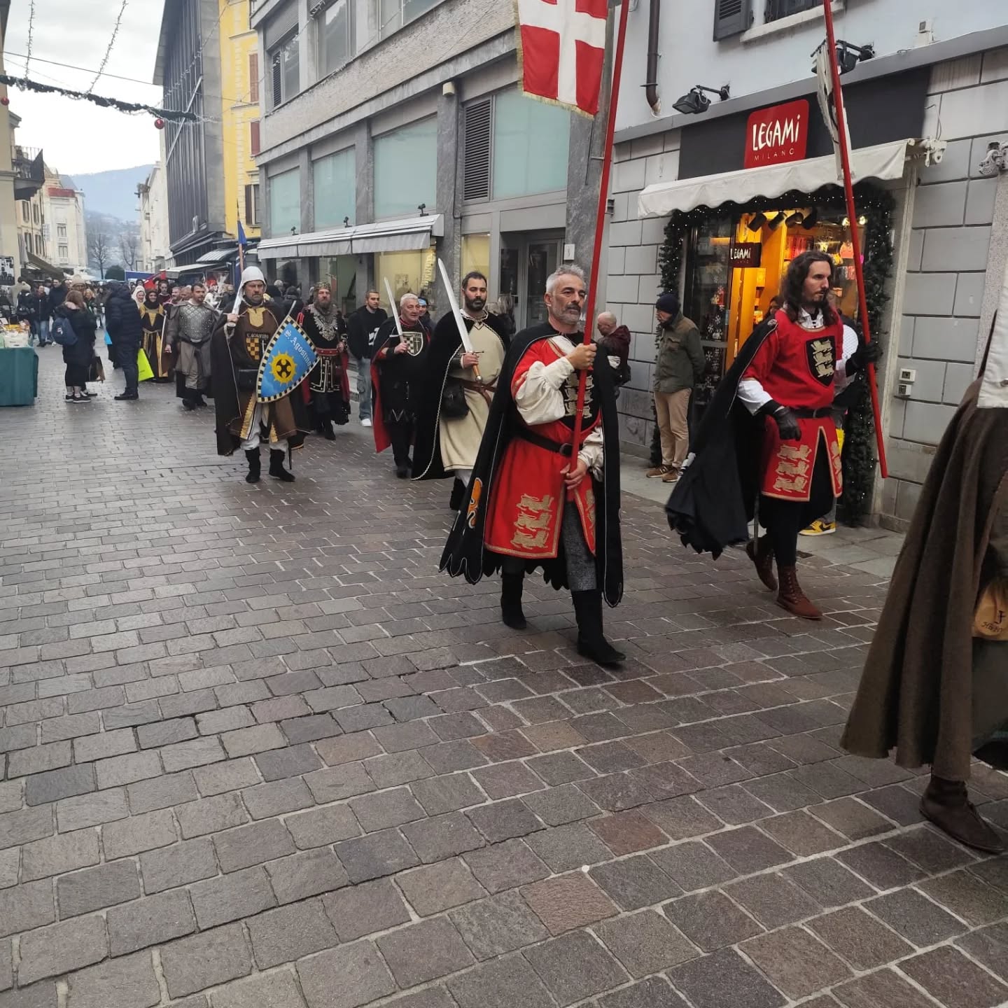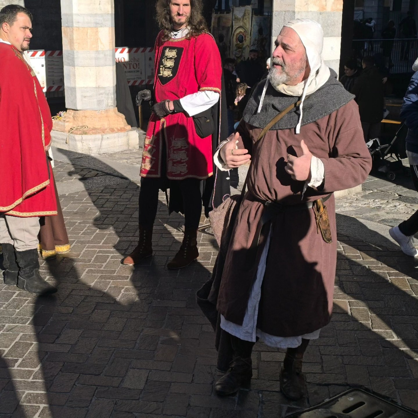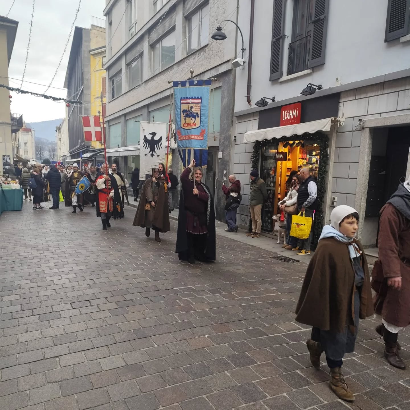 La conclusione, il 20 dicembre, ha portato per le vie di Como un emozionante corteo storico: mantelli che sfioravano le pietre antiche, vessilli mossi dal vento, figure nobili, dame, cavalieri, capitani e cortigiani hanno accompagnato Barbarossa e l’Imperatrice tra le luci natalizie, creando un’atmosfera sospesa nel tempo. In testa al corteo, Messer Raniero ha annunciato al popolo l’arrivo dell’Imperatore, aprendo la strada a un momento carico di suggestione.