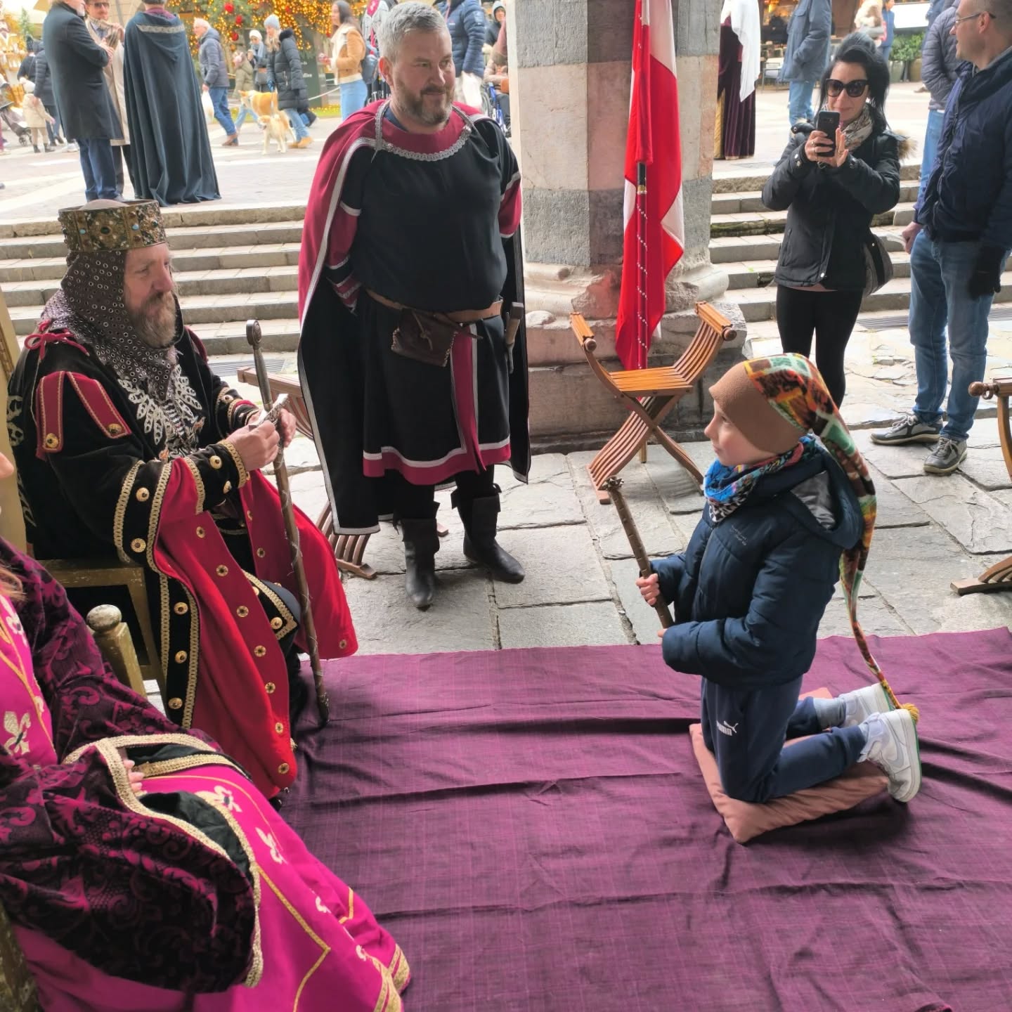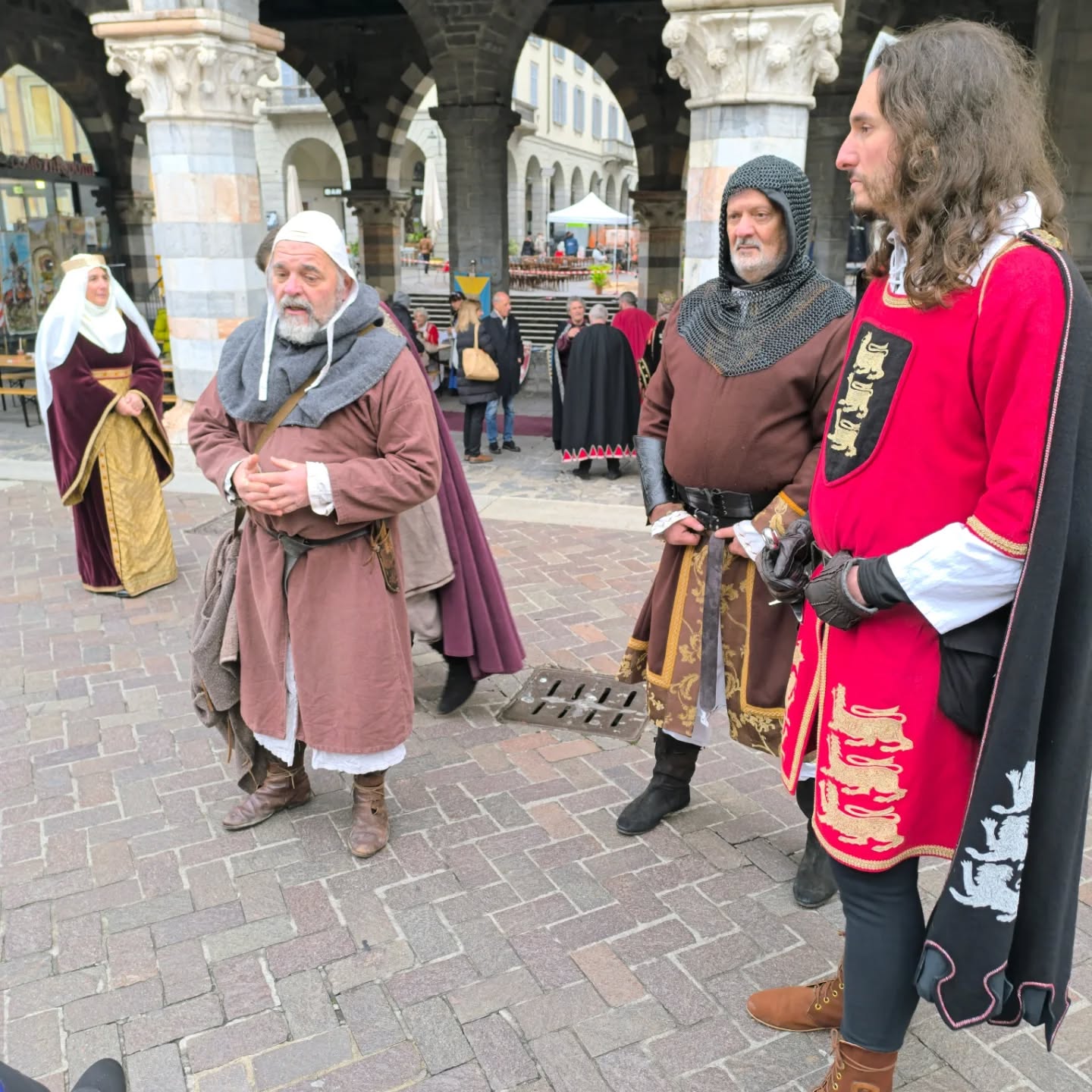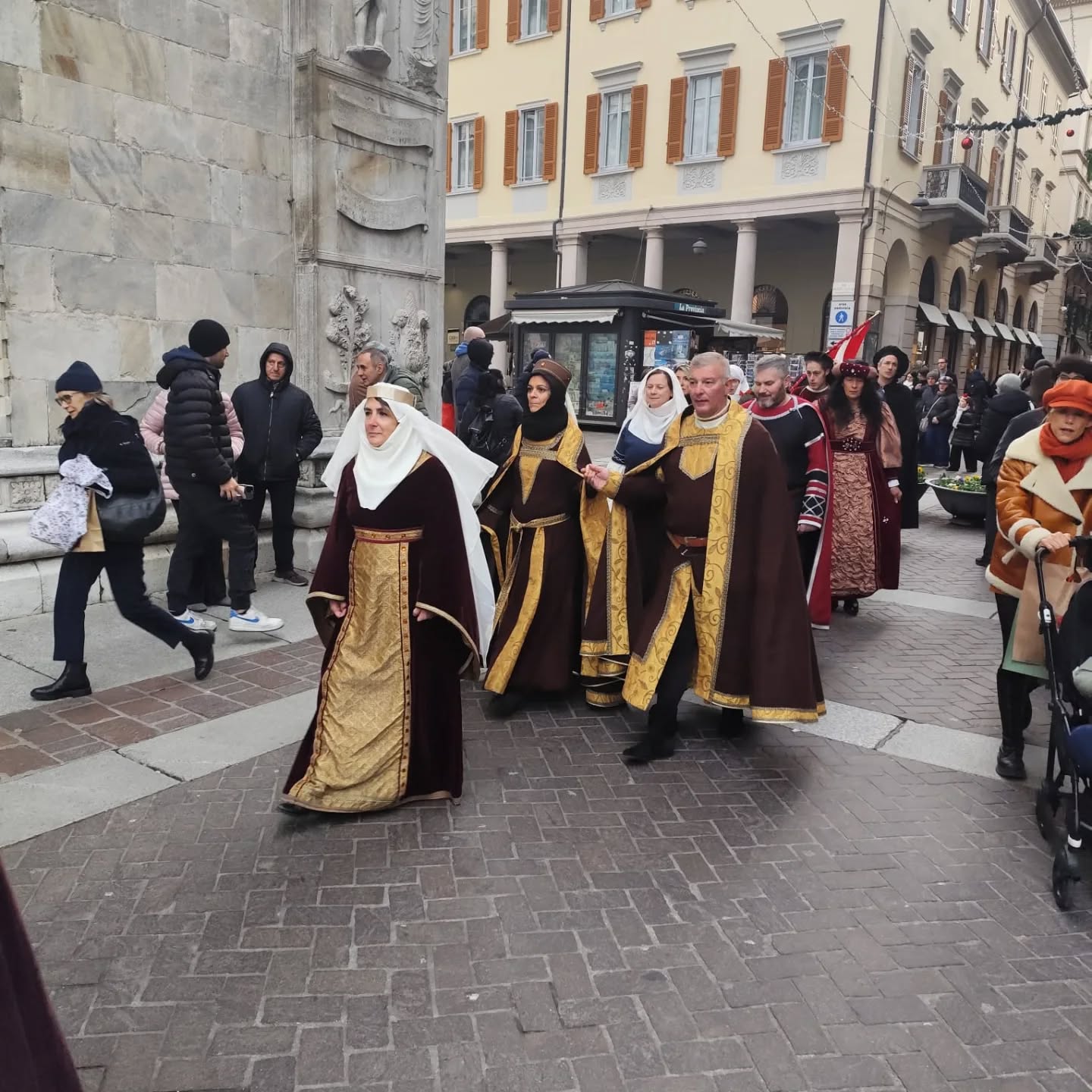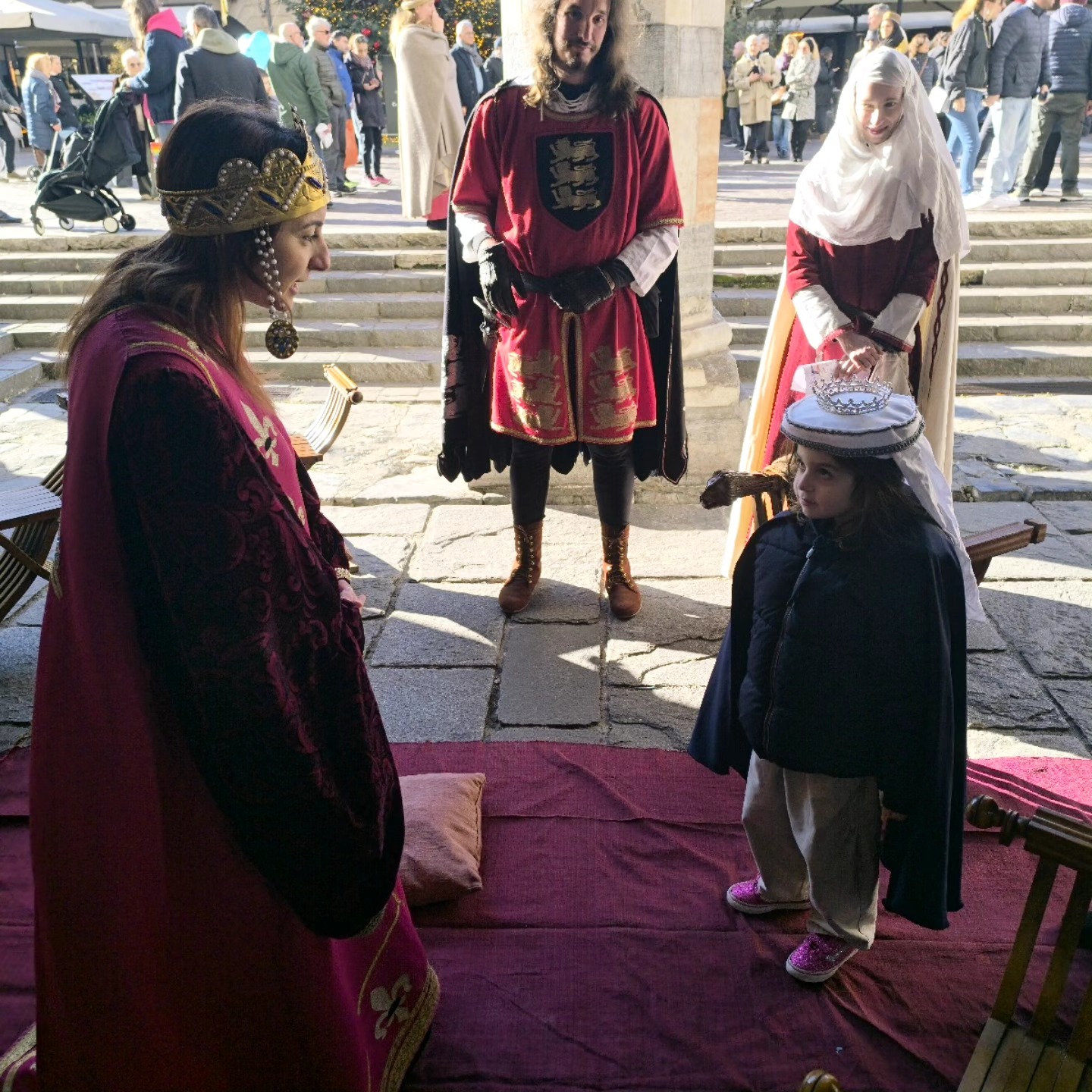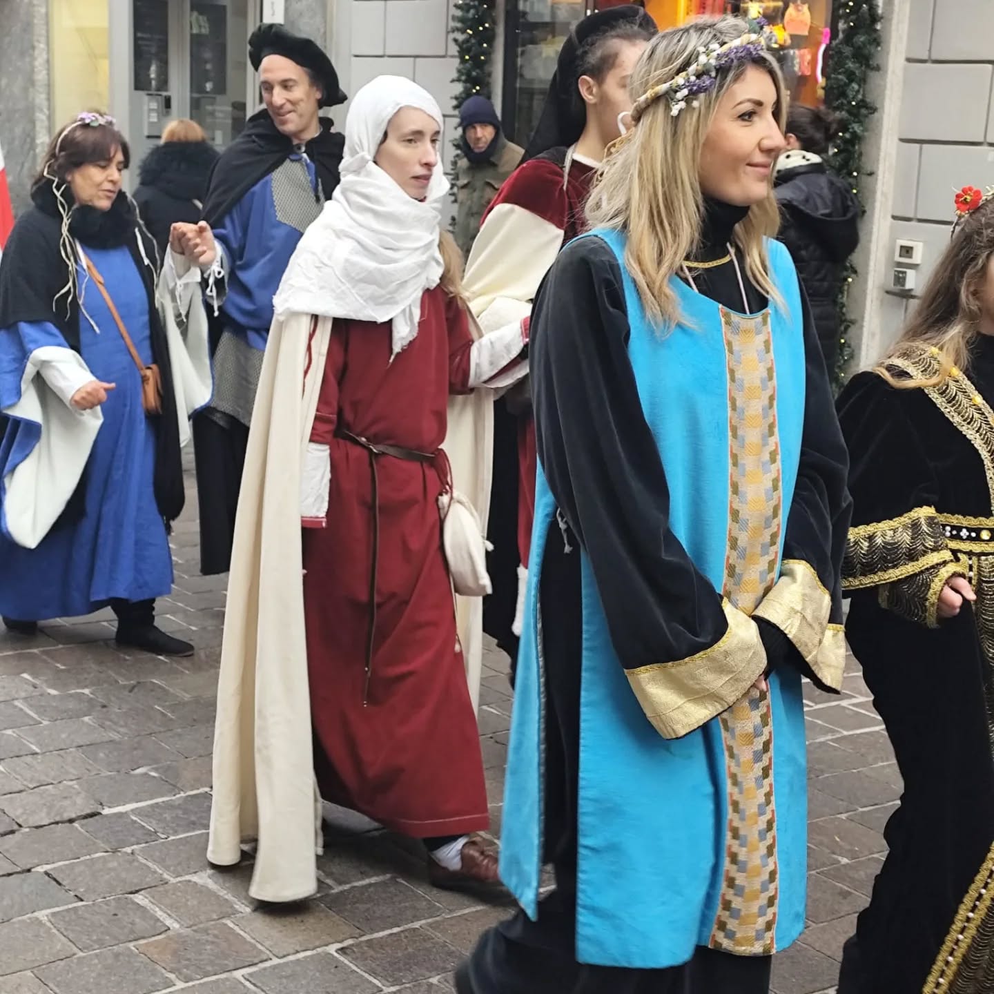 La conclusione, il 20 dicembre, ha portato per le vie di Como un emozionante corteo storico: mantelli che sfioravano le pietre antiche, vessilli mossi dal vento, figure nobili, dame, cavalieri, capitani e cortigiani hanno accompagnato Barbarossa e l’Imperatrice tra le luci natalizie, creando un’atmosfera sospesa nel tempo. In testa al corteo, Messer Raniero ha annunciato al popolo l’arrivo dell’Imperatore, aprendo la strada a un momento carico di suggestione.